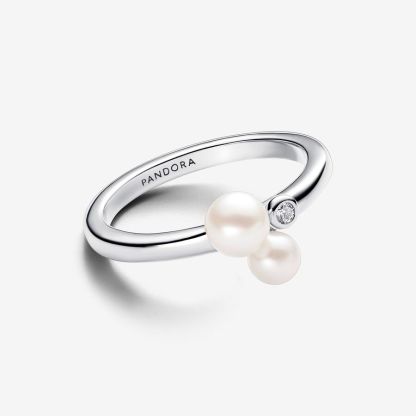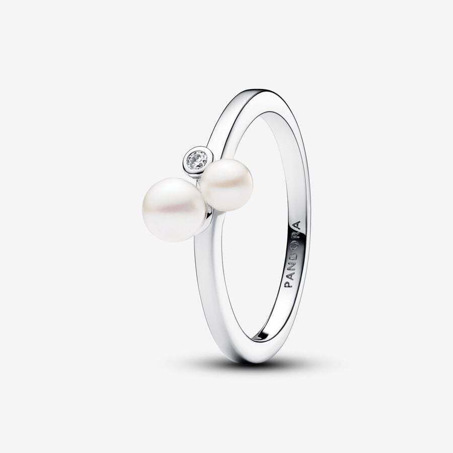 Celebrate closeness with our Duo Treated Freshwater Cultured Pearls Ring from the Pandora Timeless collection. Crafted in sterling silver, the slightly squared profile of the band showcases two asymmetrically placed treated freshwater cultured pearls, accompanied by clear cubic zirconia. This unique piece, embellished with the engraved Pandora logo, captures the essence of classic pearls, symbolizing beauty, wisdom, and love. Wear it as a symbol of your unique connection. Please note each treated freshwater cultured pearl is unique and can vary in size and color; normal wear and tear may occur with this material. Our freshwater cultured pearls are treated with bleaching and lustre enhancement.
