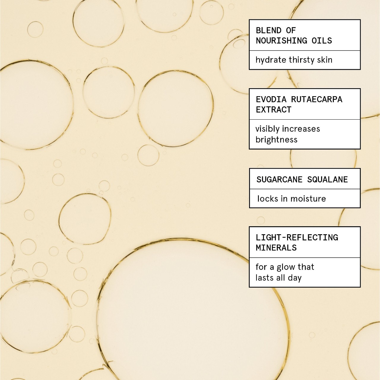 - Nurturing Four-Oil Blend (Jojoba, Grapeseed, Evening Primrose, and Rosehip Oils): Delivers dewy-looking moisture.