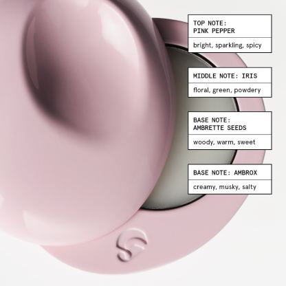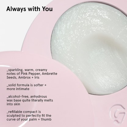Fragrance Description: With an alcohol-free, anhydrous wax base that melts into skin and holds the fragrance close, Glossier You Solid smells soft, warm, and intimate—almost like it's part of you. Pink pepper is the bright, sparkling, spicy top note. Then comes a woodsy, slightly sweet heart of ambrette alongside creamy, musky, salty ambrox. The composition is balanced with iris root, a white floral, for powdery freshness.