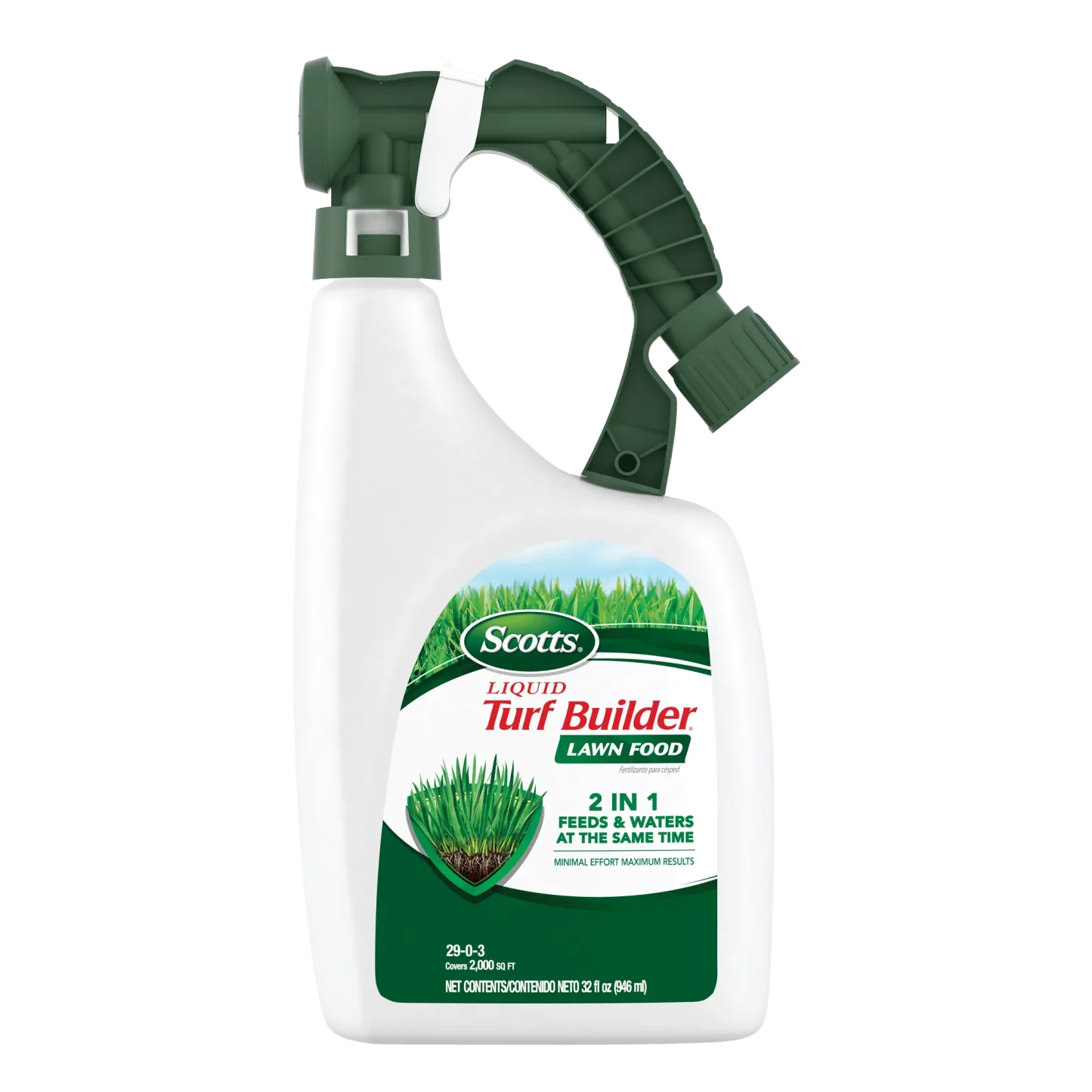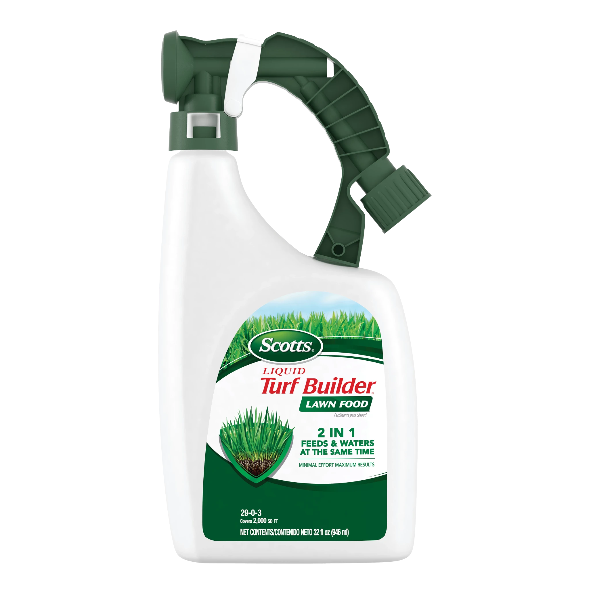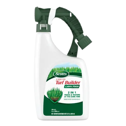 Feed, green, and water your lawn all at once! Scotts® Liquid Turf Builder® Lawn Food is the easy way to a lush, green lawn. This ready-to-spray liquid fertilizer contains the essential nutrients and feeding power lawns need for great results. Plus, the 2-in-1 solution makes it incredibly easy to feed and water your grass at the same time. Scotts® Liquid Turf Builder® Lawn Food can be applied to any grass type. Apply when turf is actively growing. If your lawn needs watering, water thoroughly 24 hours before application of the product. To apply Scotts® Liquid Turf Builder® Lawn Food, simply connect the bottle to a garden hose, turn on the water, and spray. For best results, do not cut your grass 1 to 2 days after application and do not apply when temperatures exceed 85°F. One 32 fl. oz. bottle of Scotts® Liquid Turf Builder® Lawn Food covers 2,000 sq. ft.