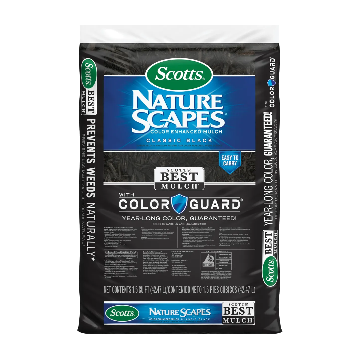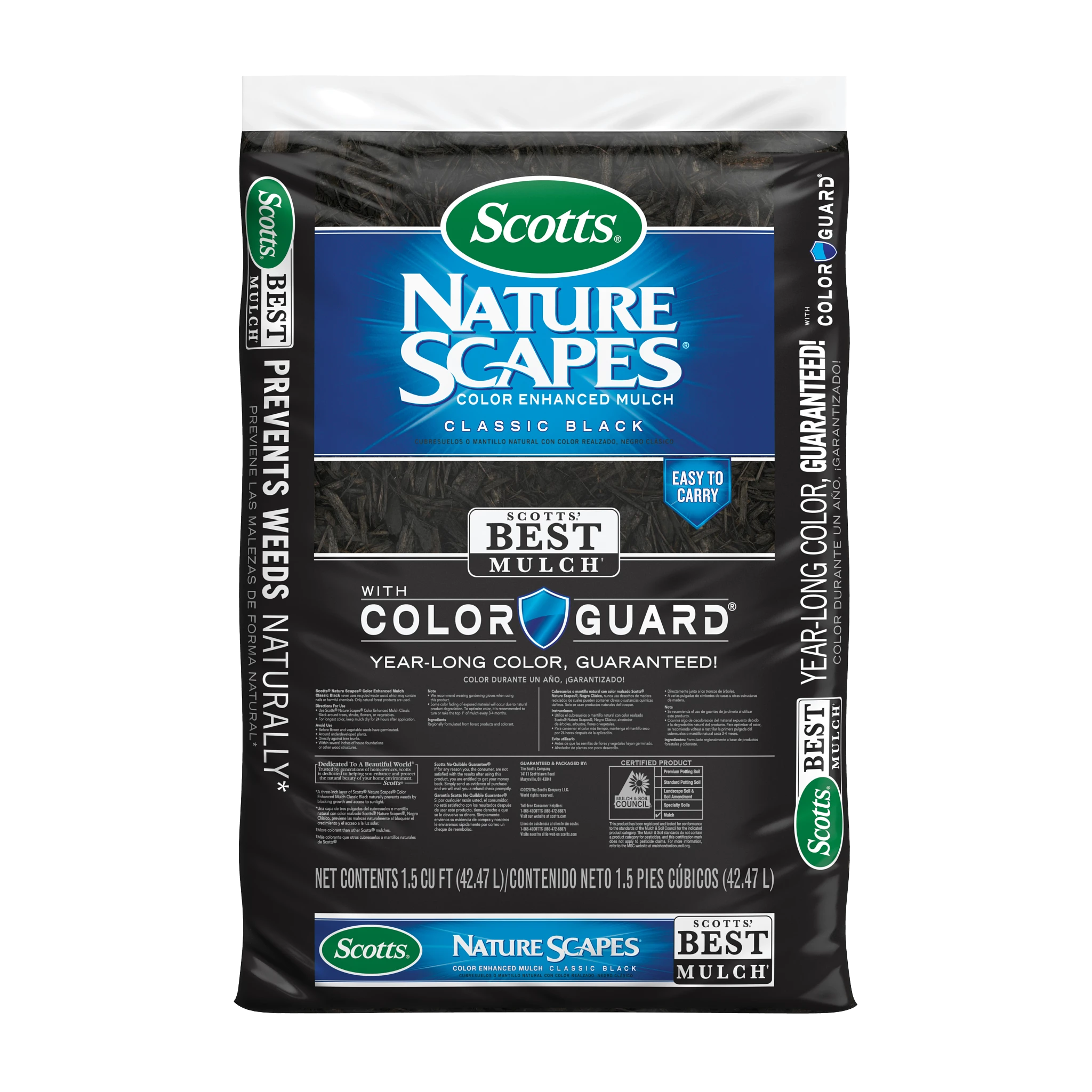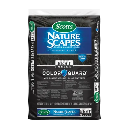 Enhance your outdoor space with black wood mulch. This 1.5 cu. ft. bag of shredded mulch helps retain moisture. Scotts® Nature Scapes® Color Enhanced Mulch is ideal for around trees, shrubs, flowers or vegetables. For longest color, keep mulch dry for 24 hours after application. This color enhanced mulch never uses recycled waste wood, only natural forest products. Build a better landscape that you know will look great and be free of any construction debris and pallet wood. Landscape mulch offers a rich, natural black color that is guaranteed for a year with ColorGuard®.