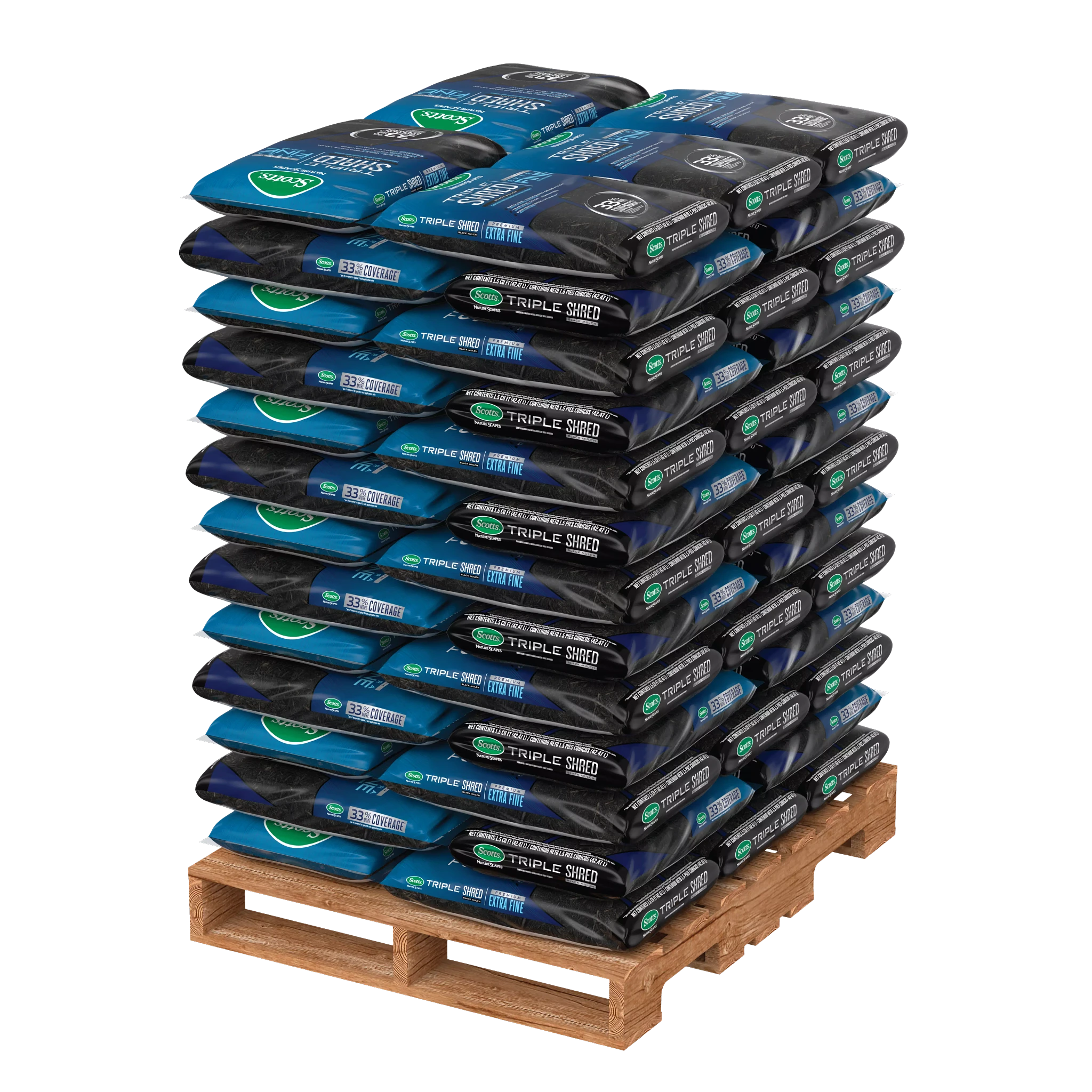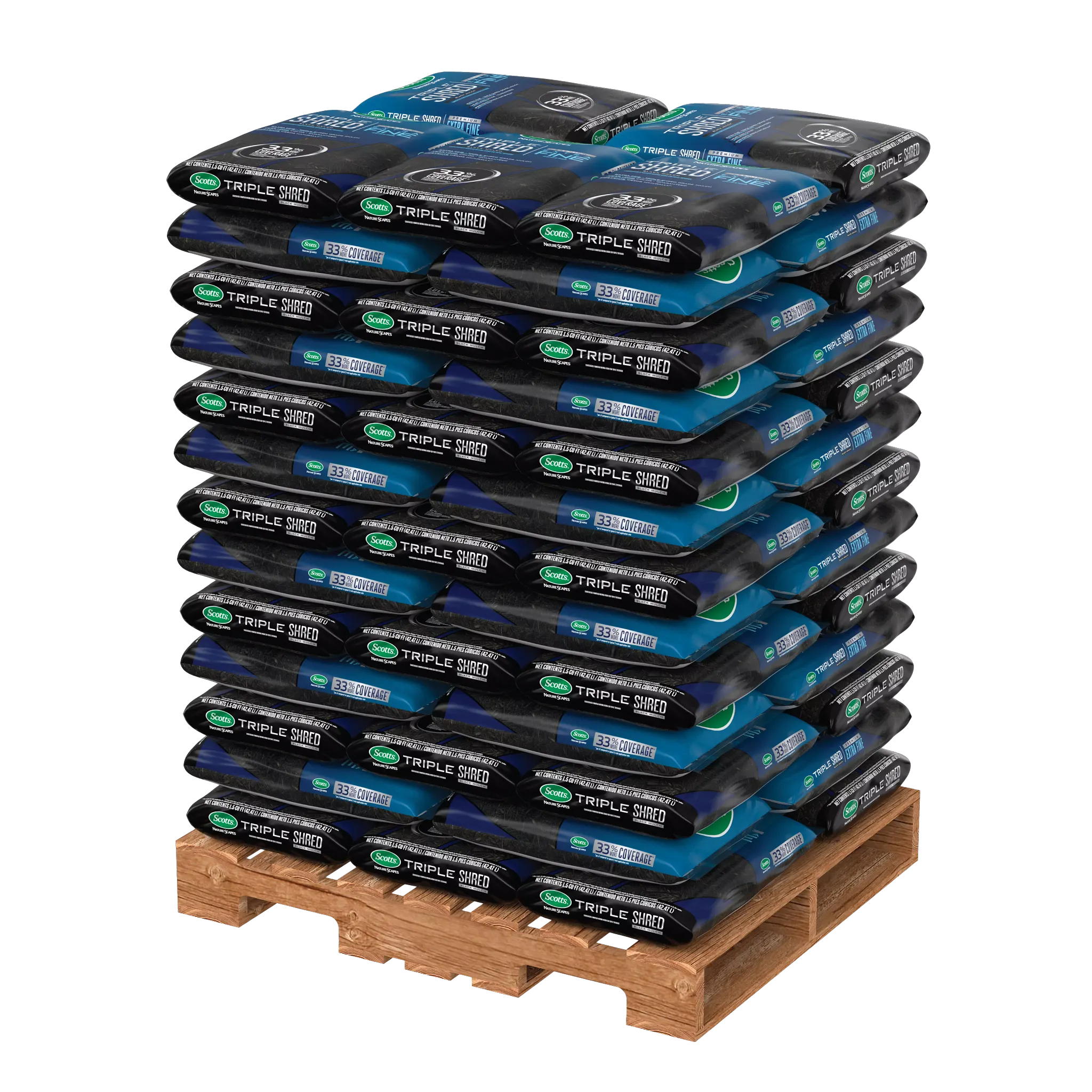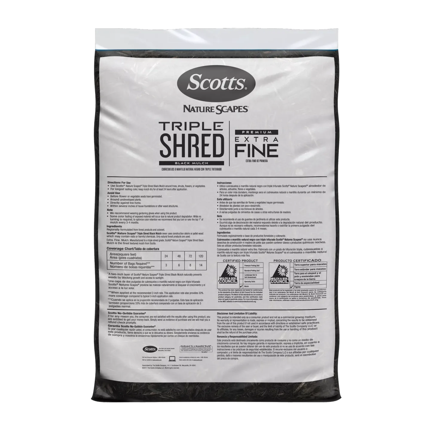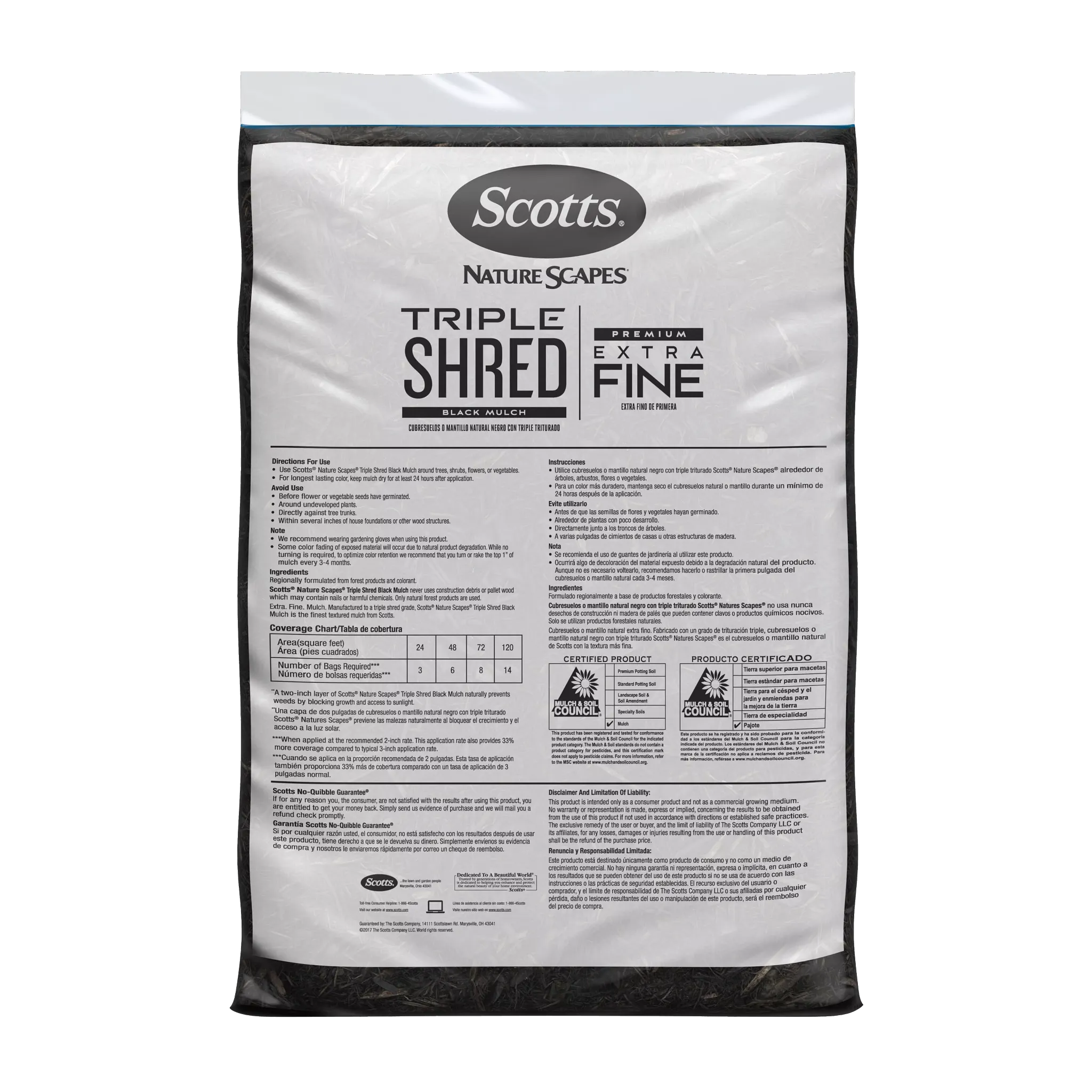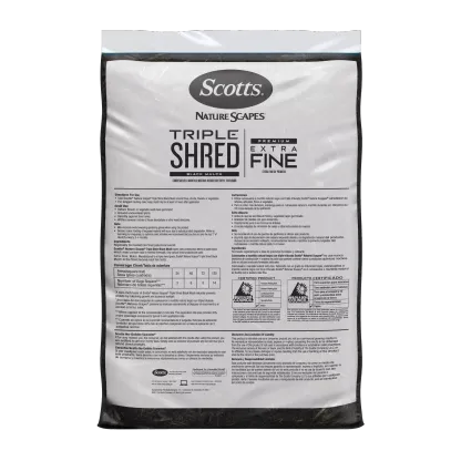- Scotts® Nature Scapes® Triple Shred Black Mulch is an extra-fine, easy-to-use mulch that provides year-long color and 33% more coverage per cubic foot compared to typical 3 inch application rate