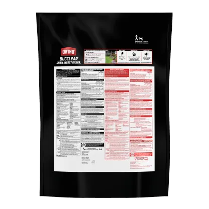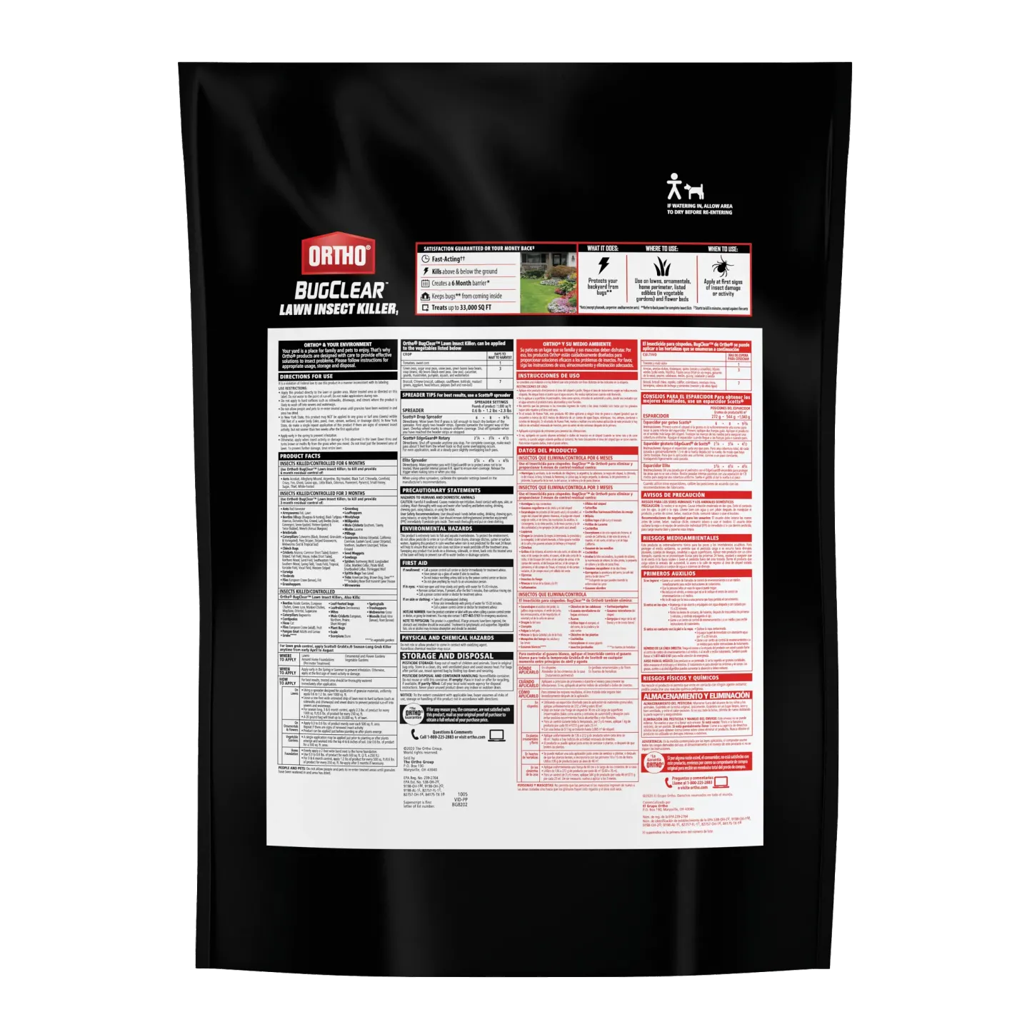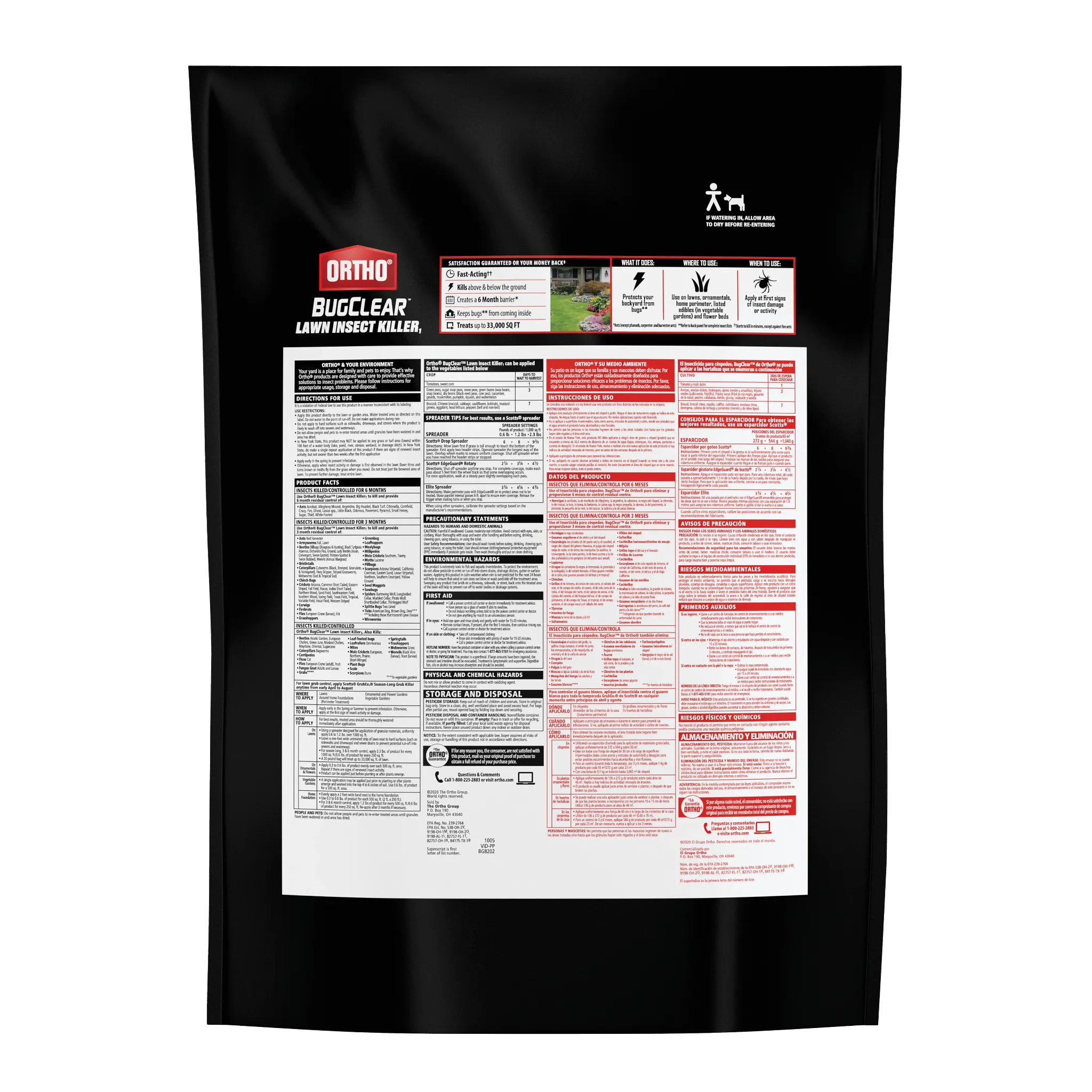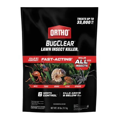 Ortho BugClear Lawn Insect Killer controls Ants (Carpenter, Pharaoh, Acrobat, Allegheny Mound, Argentine, Big Headed, Black Turf, Citronella, Cornfield, Crazy, Ghost, Little Black, Odorous, Pavement, Pyramid, Red Harvester, Small Honey, Thief, White Footed), Armyworms (Fall, Lawn), Beetles (Billbugs (Bluegrass & Hunting), Black Turfgrass Ataenius, Dichondra Flea, Ground, Lady Beetles (Asian, Convergent, Seven-spotted, Thirteen-Spotted & Twice-Stabbed), and Weevils (Annual Bluegrass), Asiatic Garden, European Chafers, Green June, Masked Chafers, May/June, Oriental, and Sugarcane), Bristletails, Caterpillars (Bagworms, Cutworms (Black, Bronzed, Granulate, and Variegated), Fiery Skipper, Striped Grassworm, Webworms (Sod & Tropical Sod), Centipedes, Chiggers, Chinch Bugs, Crickets (Arizona, Common Short Tailed, Eastern Striped, Fall Field, House, Indies Short Tailed, Northern Wood, Sand Field, Southeastern Field, Southern Wood, Spring Field, Texas Field, Tropical, Variable Field, Vocal Field, Western Striped), Earwigs, Firebrats, Fleas, Flies (European Crane (larvae and adult), Fruit), Grasshoppers, Greenbug, Leafhoppers, Leaf-footed Bugs, Leafrollers (omnivorous), Mealybugs, Millipedes, Mole Crickets (Southern, Tawny), Fungus Gnat (Adults and Larvae), Grubs, Mites, Mole Crickets (European, Northern, Prairie, Short-Winged), Moths (Lucerne), Pillbugs, Plant Bugs, Scale, Scorpions (Arizona Stripetail, California Common, Dune, Eastern Sand, Lesser Stripetail, Northern, Southern Unstriped, Yellow Ground), Seed Maggots, Sowbugs, Spiders (Burrowing Wolf, Longbodied Cellar, Marbled Cellar, Pirate Wolf, Short Bodied Cellar, Thin Legged Wolf), Spittlebugs (Two Lined), Springtails, Ticks (American Dog, Brown Dog, Deer (including those that transmit Lyme Disease)), Treehoppers, Webworms, Wireworms, and Weevils (Black Vine (larvae), Root (larvae))