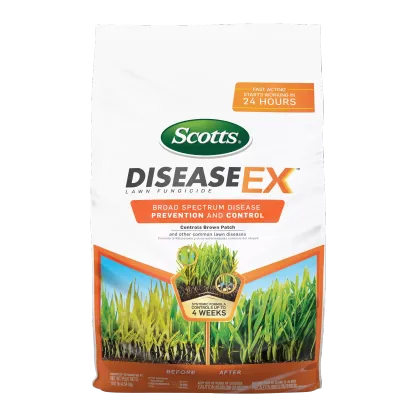 Scotts DiseaseEx controls brown patch, stem and stripe rust, red thread, powdery mildew, anthracnose, pythium, southern and typhula blight, leaf spot, pink patch, necrotic ring spot, summer patch, fusarium patch, gray leaf spot, leaf rust, melting out, yellow path, rhizoctonia large patch, fairy ring, gray and pink snow mold, pythium root rot, spring dead spot, take-all patch, and zoysia patch.