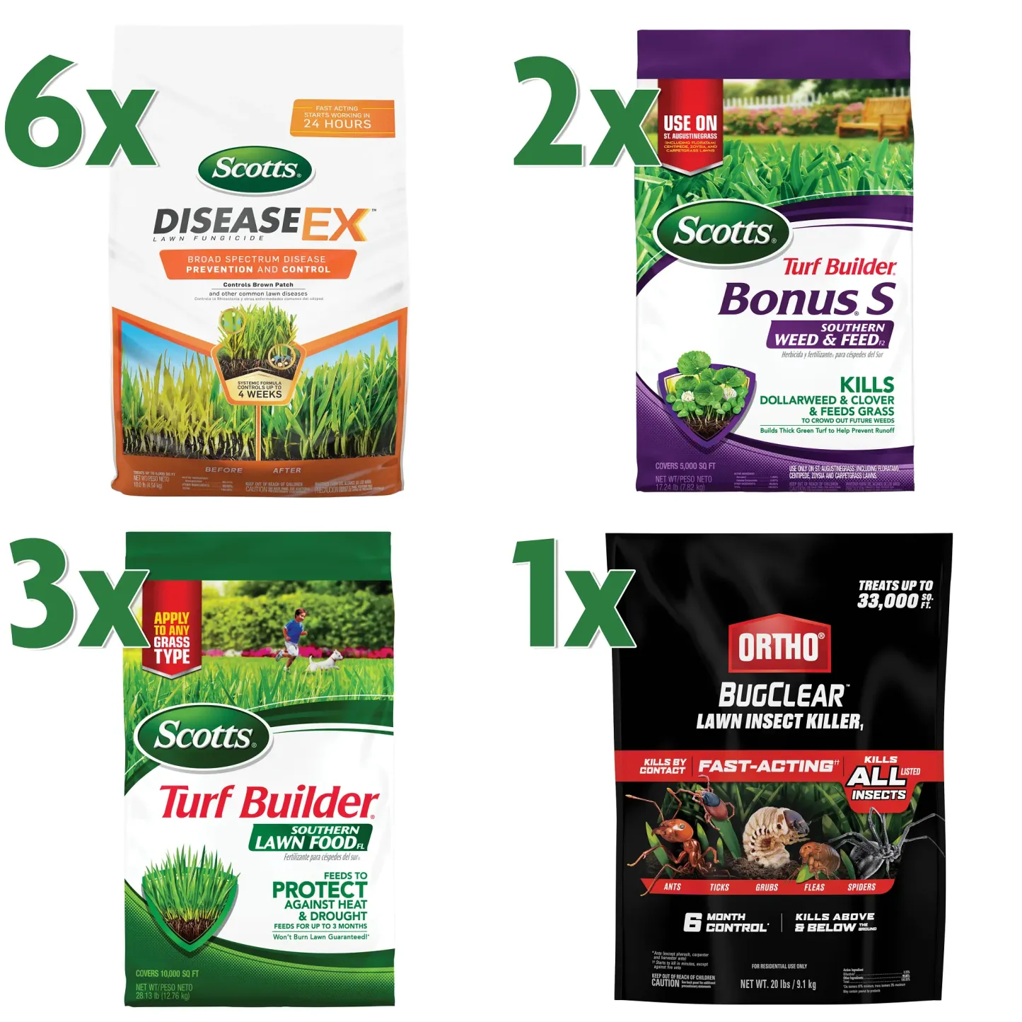 - LATE SPRING: Scotts Turf Builder Southern Lawn FoodFL (1 bag), Scotts DiseaseEx Lawn Fungicide (2 bags)