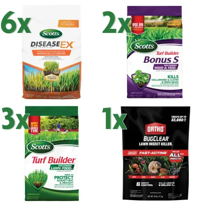 - FALL: Scotts Turf Builder Southern Lawn Food (1 bag), Scotts DiseaseEx Lawn Fungicide (2 bags)