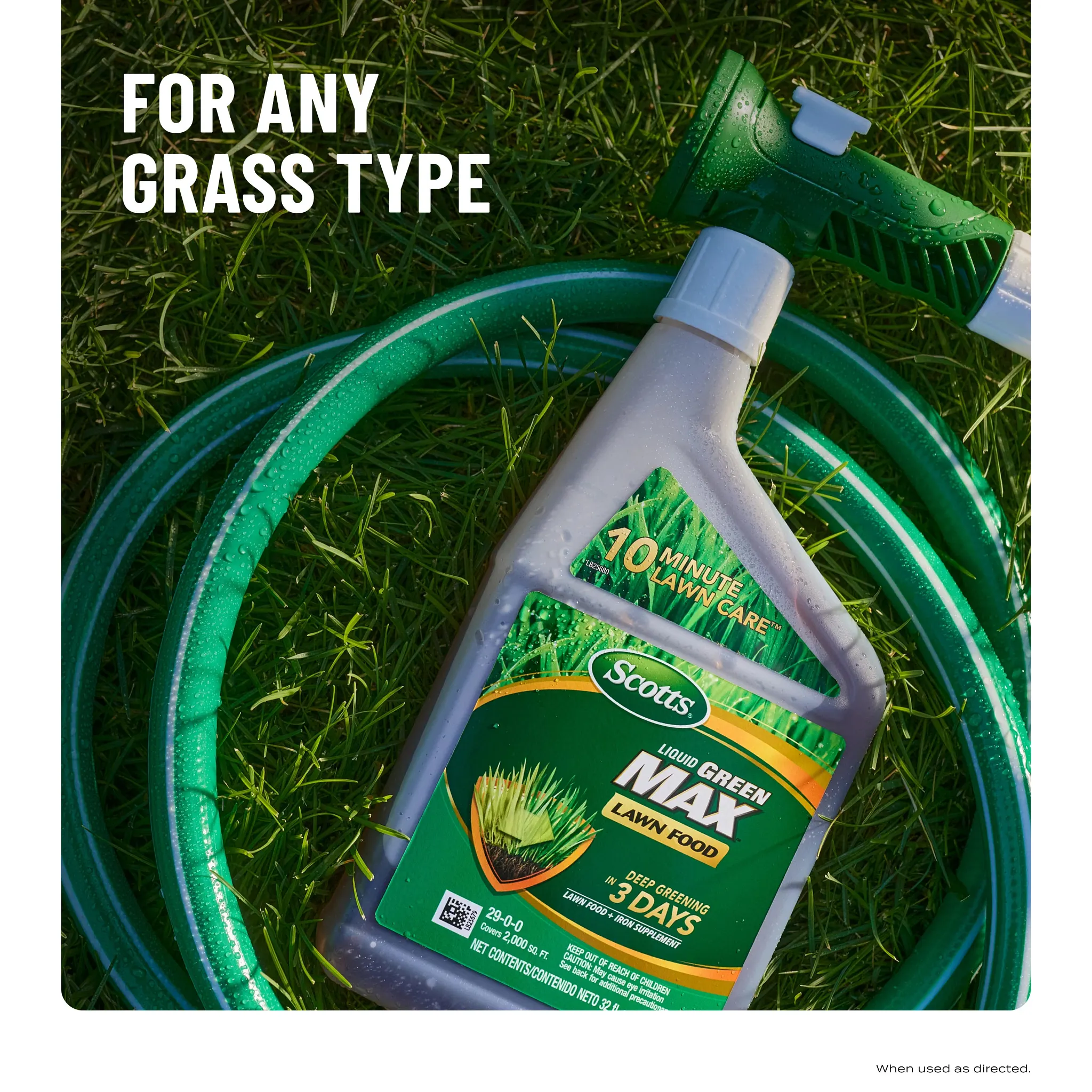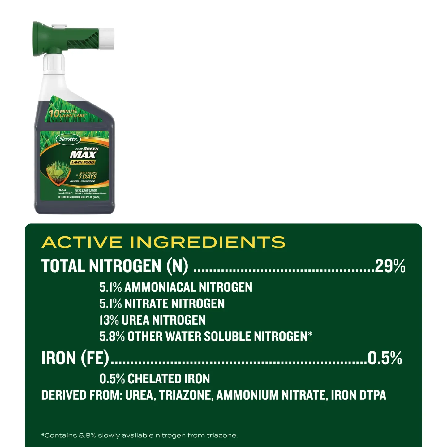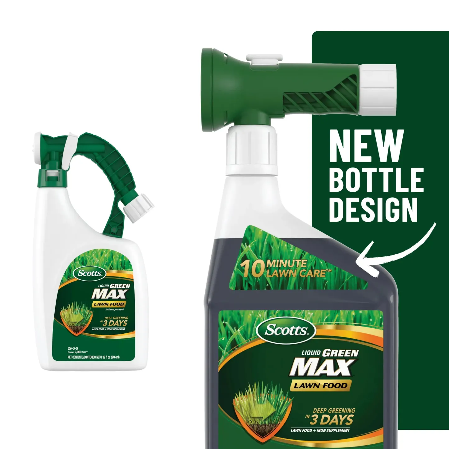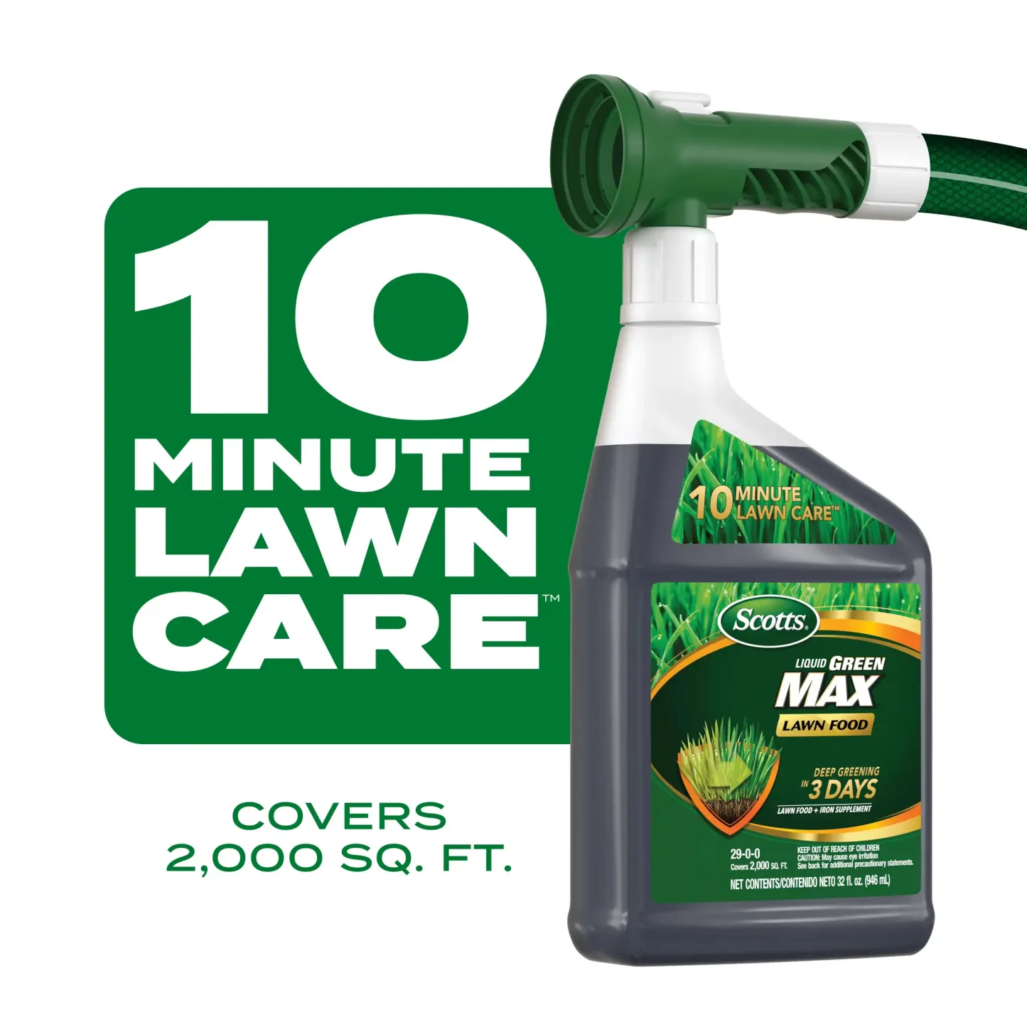 - 10 MINUTE LAWN CARE™: 32 fl. oz. bottle of Scotts® Liquid Green Max™ Lawn Food feeds a 2,000 sq. ft. lawn in 10 minutes