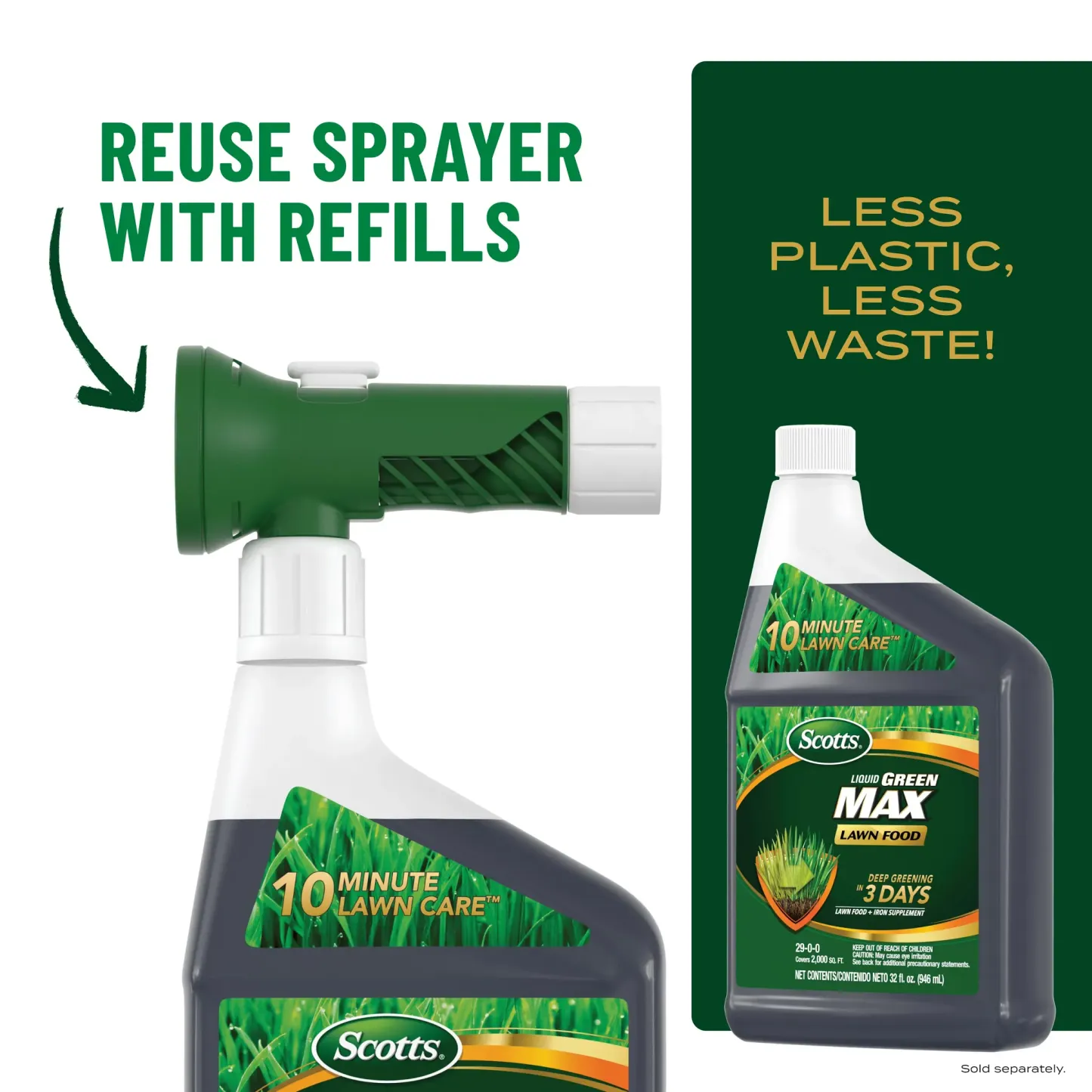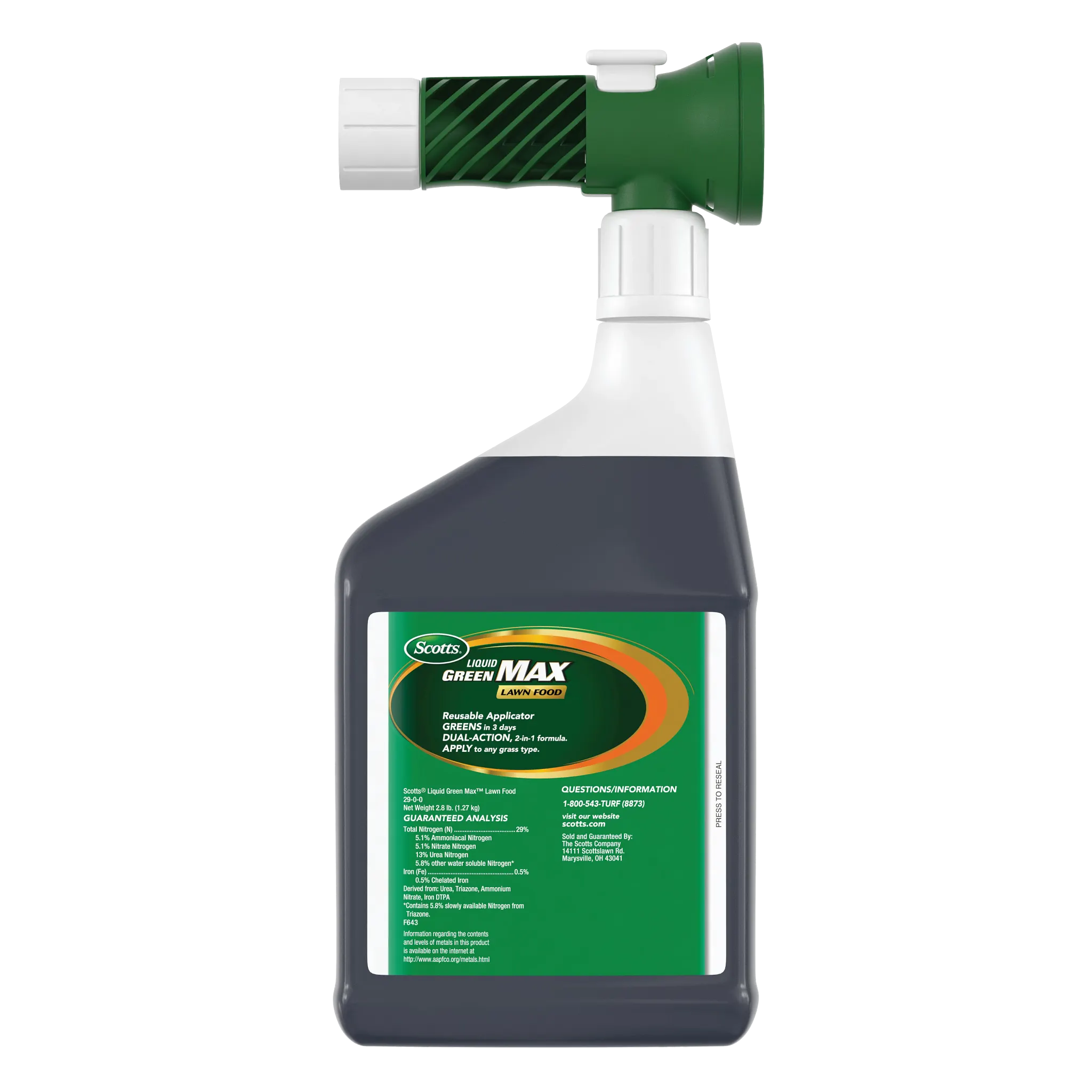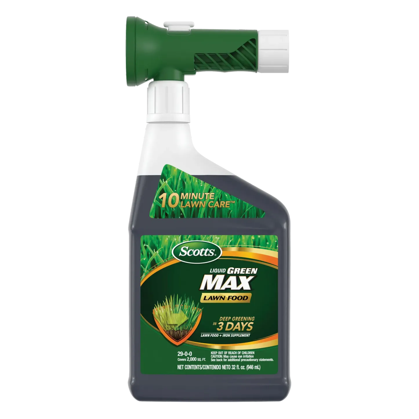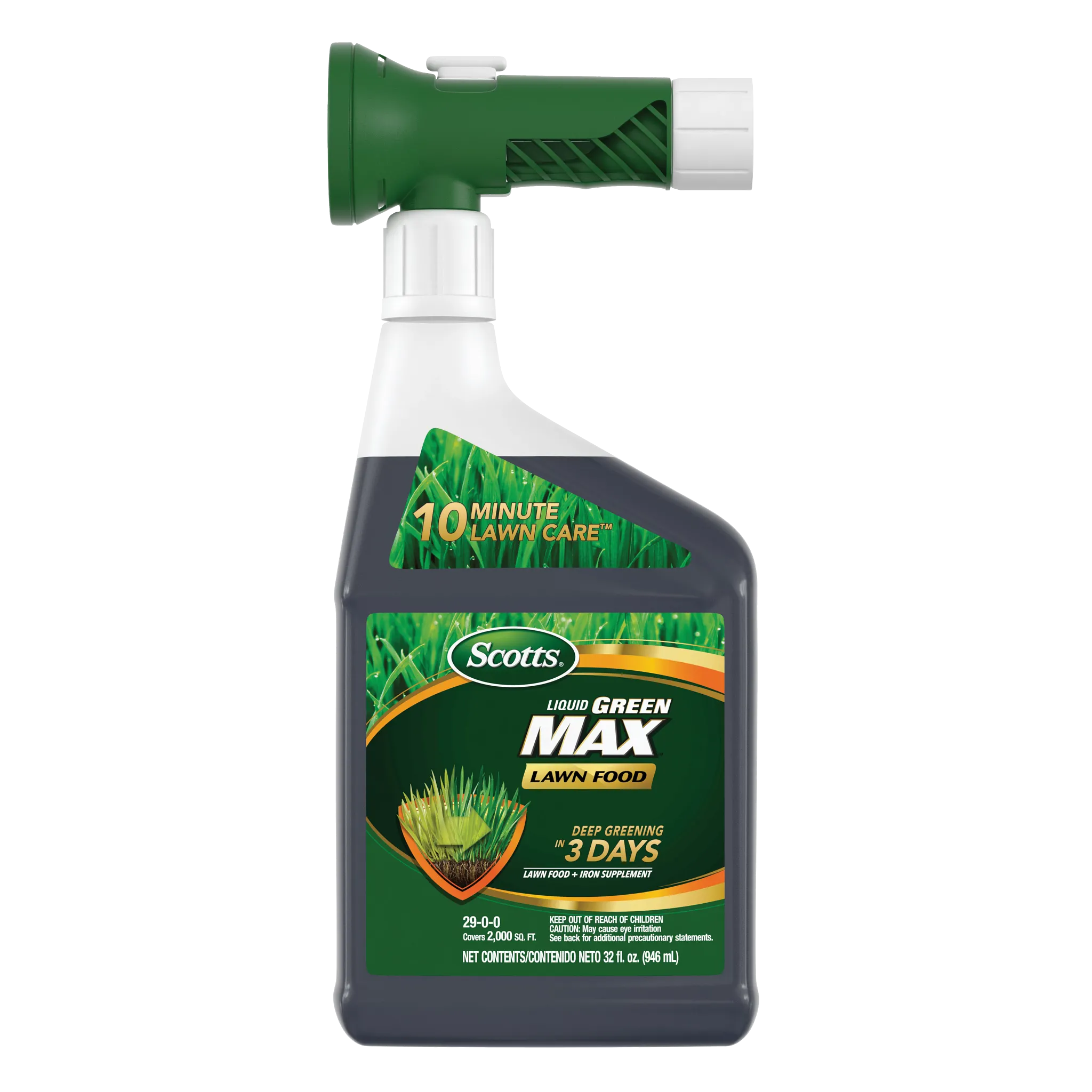 - 10 MINUTE LAWN CARE™: 32 fl. oz. bottle of Scotts® Liquid Green Max™ Lawn Food feeds a 2,000 sq. ft. lawn in 10 minutes