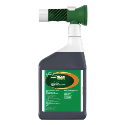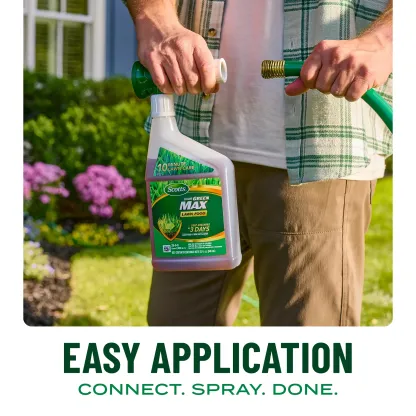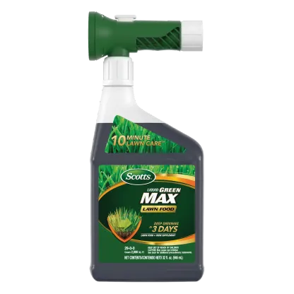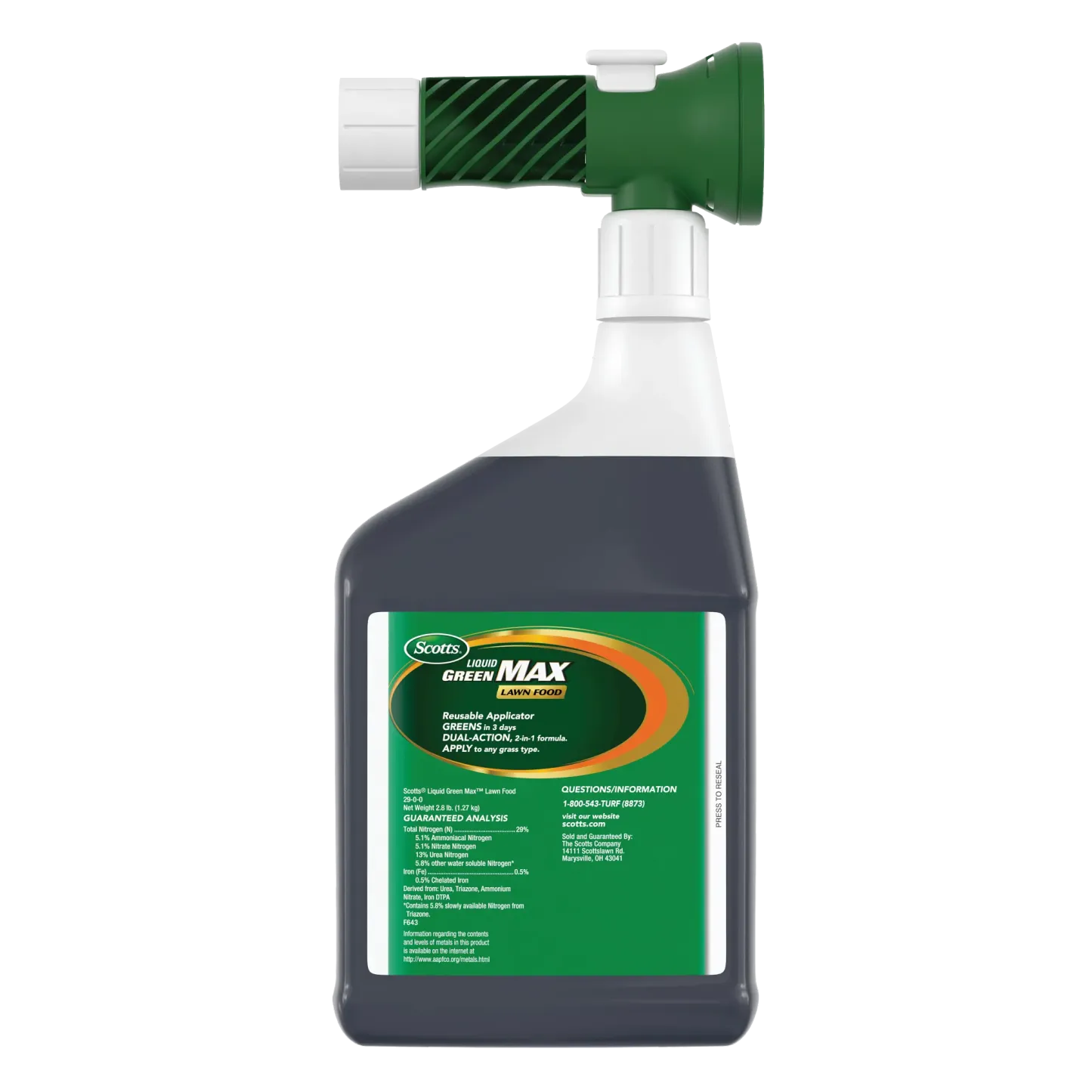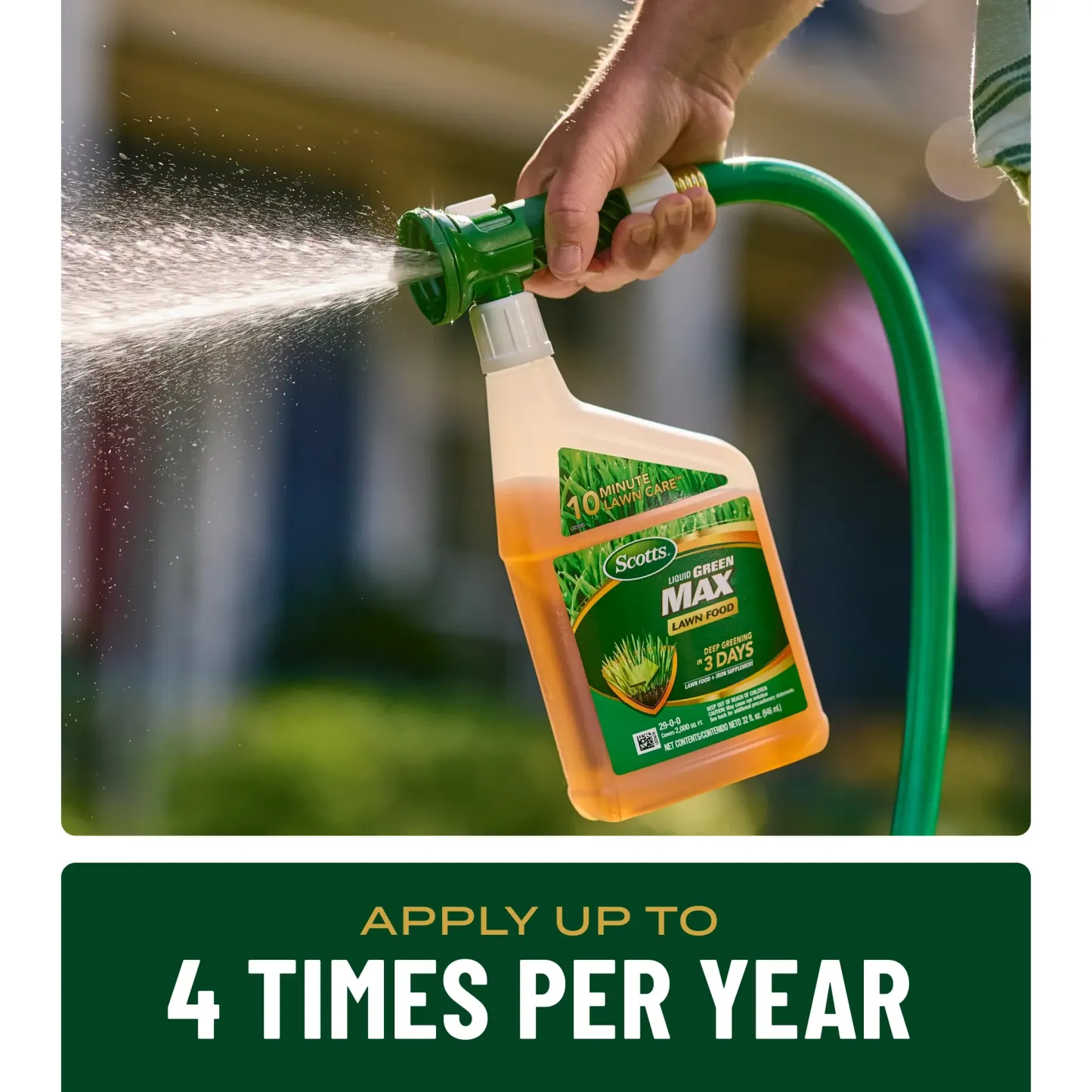 Want a deep green lawn without the wait? Scotts® Liquid Green Max™ Lawn Food is your secret weapon, greening up your grass in as little as 3 days. It's incredibly easy—you can feed a 2,000 sq. ft. lawn in just 10 minutes. Getting started is a snap: just connect the applicator to your hose, flip the switch, and spray. Since the applicator is reusable, you can just grab a refill bottle (sold separately) next time and you’re good to go. We even made the bottle translucent, so you can see exactly how much you're applying. No more guessing. This 2-in-1 feed-while-you-water formula contains an iron supplement that delivers that rich, green color you love. Regular feedings build a stronger turf that can handle the stresses of heat, drought, and foot traffic. It’s a simple way to get a healthier, more resilient lawn that works on any grass type. For a lawn that makes the neighbors jealous, we recommend feeding four times a year: in early spring, late spring, summer, and fall.