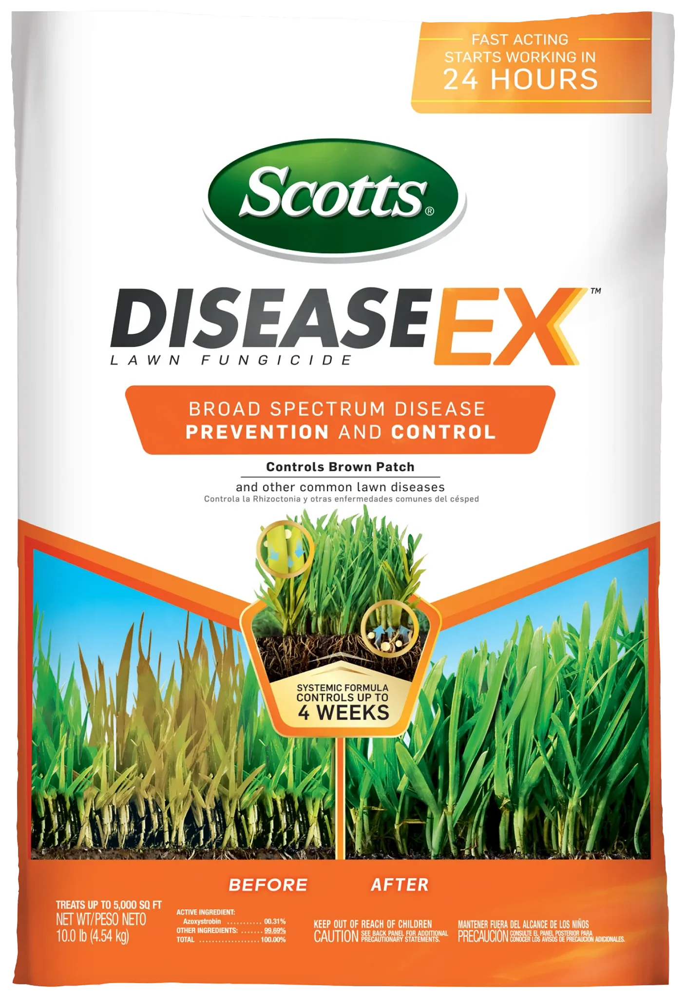 - One 10 lb. bag of Scotts® DiseaseEx™ Lawn Fungicide 10 lb. bag treats up to 5,000 sq. ft.