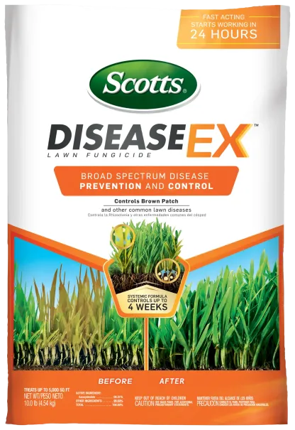 Don't let brown spots or mildew block your path to a beautiful, green yard. Scotts® DiseaseEx™ Lawn Fungicide prevents disease before it appears and controls disease at the first sign of symptoms. It controls 26 listed lawn diseases, including brown patch, stem & stripe rust, red thread, powdery mildew, necrotic ring spot, and pink patch. Scotts® DiseaseEx™ Lawn Fungicide starts to work within 24 hours of application, and continues to control diseases up to 4 weeks. We recommend using a Scotts® spreader to apply this product. For Scotts® broadcast/rotary spreaders, use a setting of 2 ¼ for the preventative rate or 3 ¾ for the curative rate. For Scotts® drop spreaders, use a setting of 4 for the preventative rate or 5 ½ for the curative rate. For Scotts® Wizz, use a setting of 3 ¼ for the preventative rate or 4 for the curative rate. For best results, begin applications prior to disease symptoms, or when conditions are favorable for disease. It can be applied after seeding or at seed germination. The product may be reapplied at 14-28 day intervals. One 10 lb. bag of Scotts® DiseaseEx™ Lawn Fungicide treats up to 5,000 sq. ft.