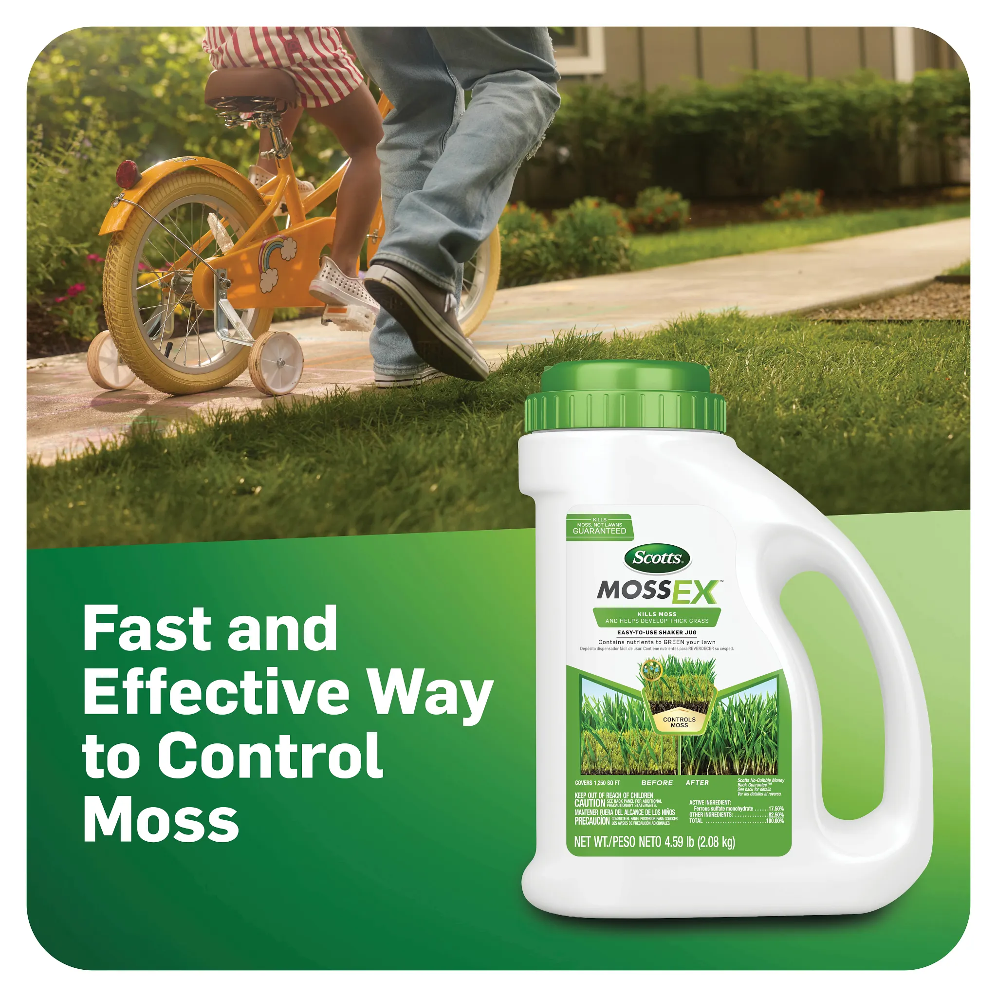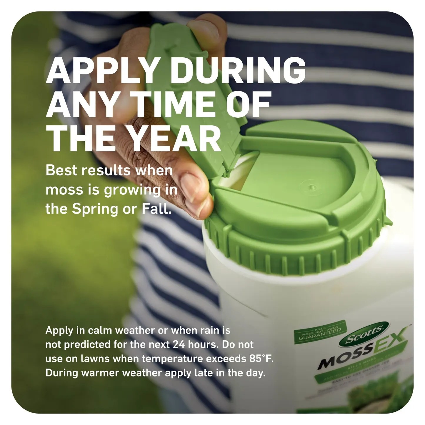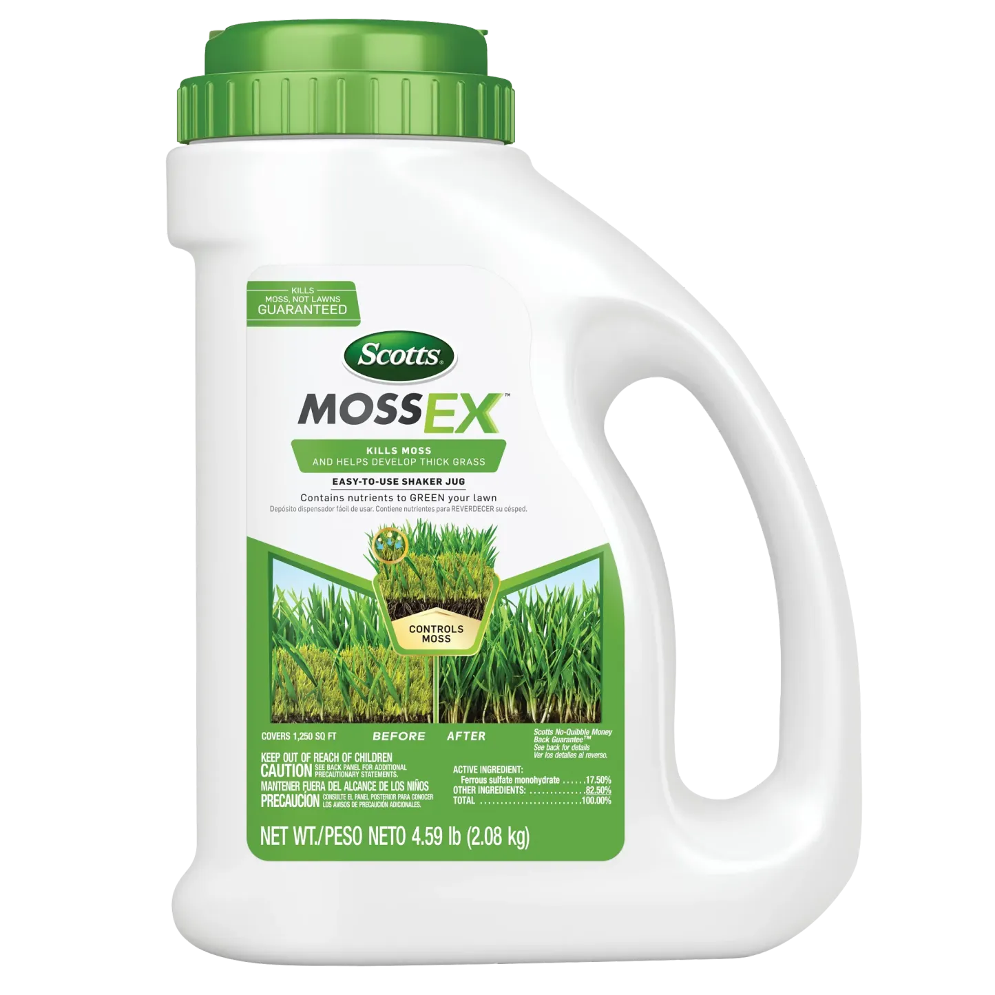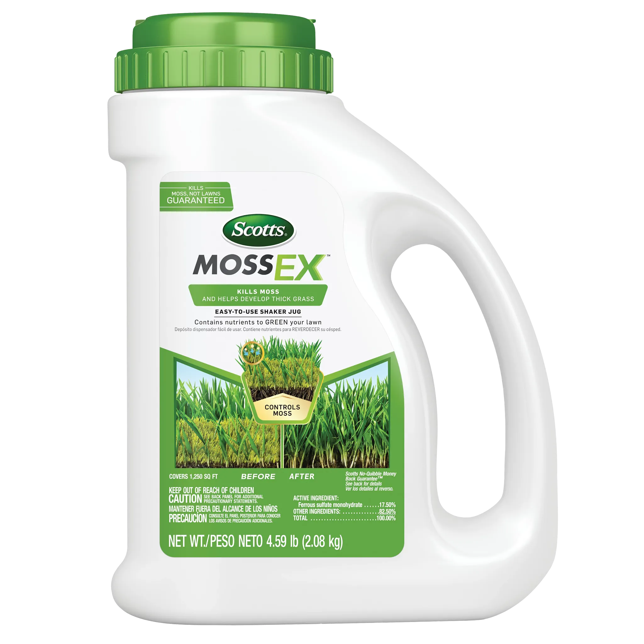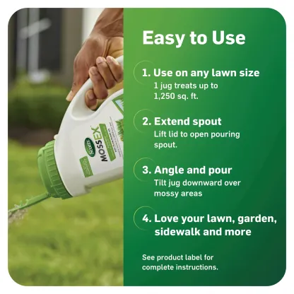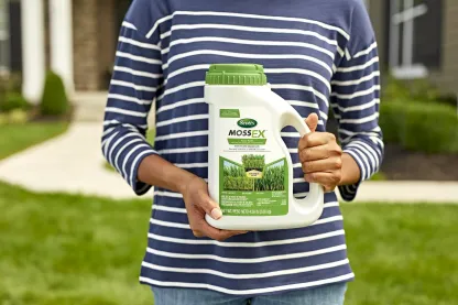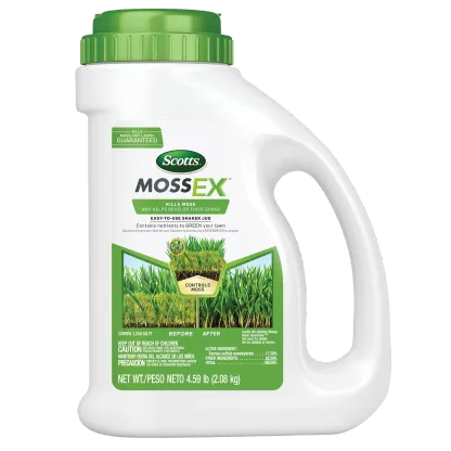 Kill moss, not your lawn, with Scotts® MossEX™. Apply easily with the convenient shaker jug, perfect for spot treatments or smaller areas of the yard. Scotts® MossEX™ also contains added nutrients to help your lawn grow greener and thicker as moss dies away. For best results, apply to a moist lawn after tall grass is mowed to expose low-growing moss. With Scotts® MossEX™, this is the year you can enjoy a moss-free lawn.