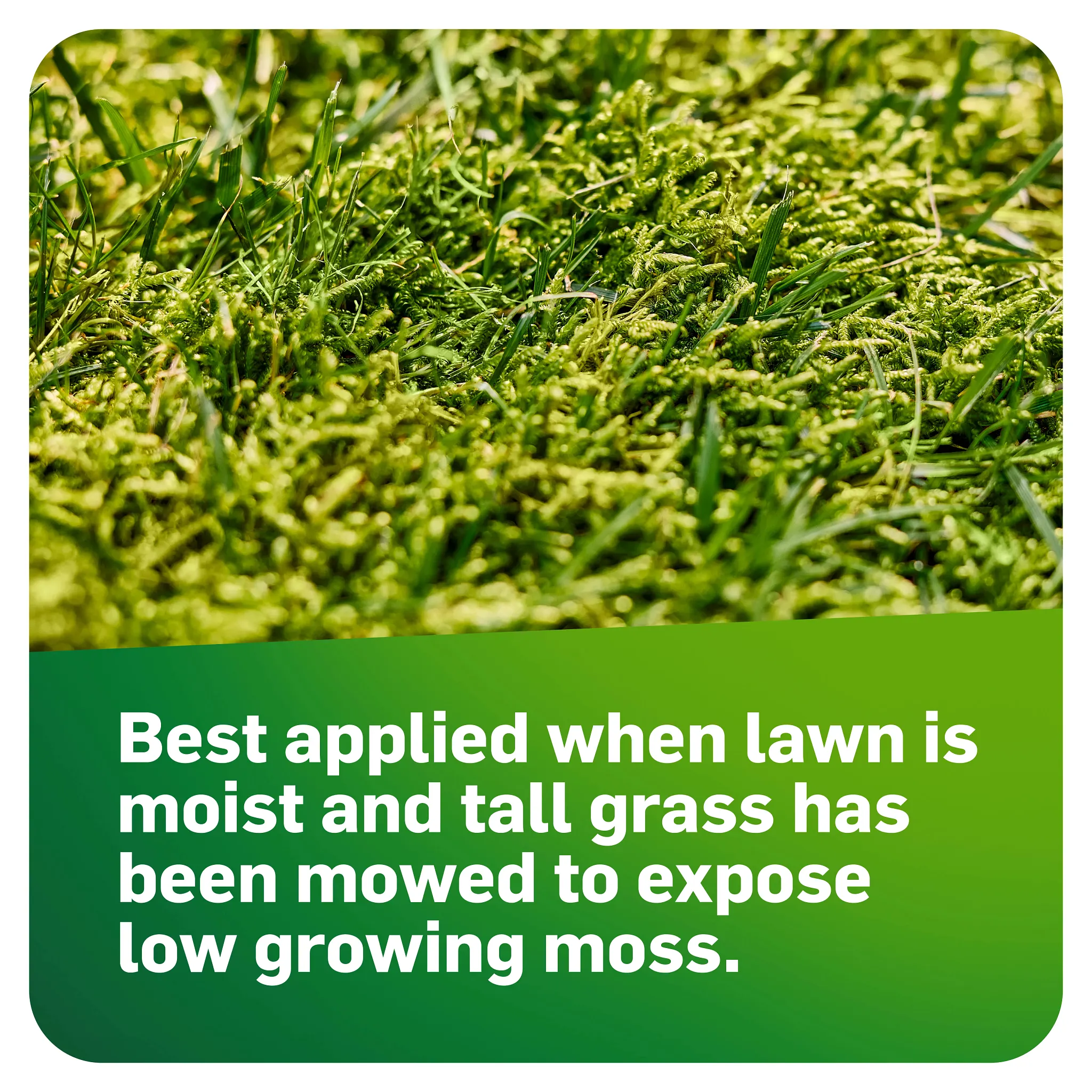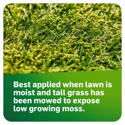 - Apply when lawn is moist and tall grass has been mowed to expose low-growing moss.