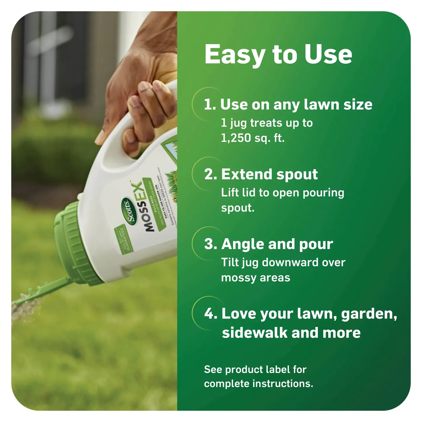 - Angle jug downward and sprinkle granules over mossy areas. Apply evenly. Refer to diagram on package as a guide for uniform distribution of granules