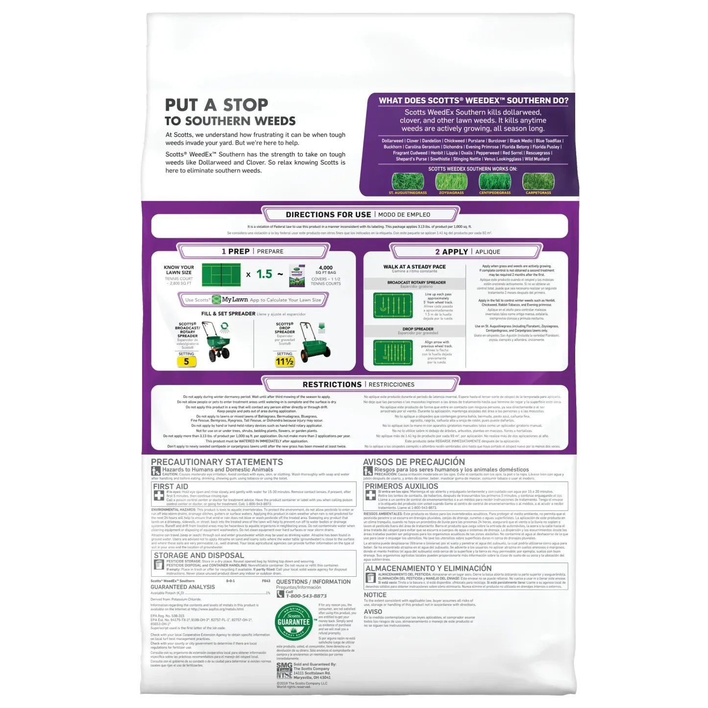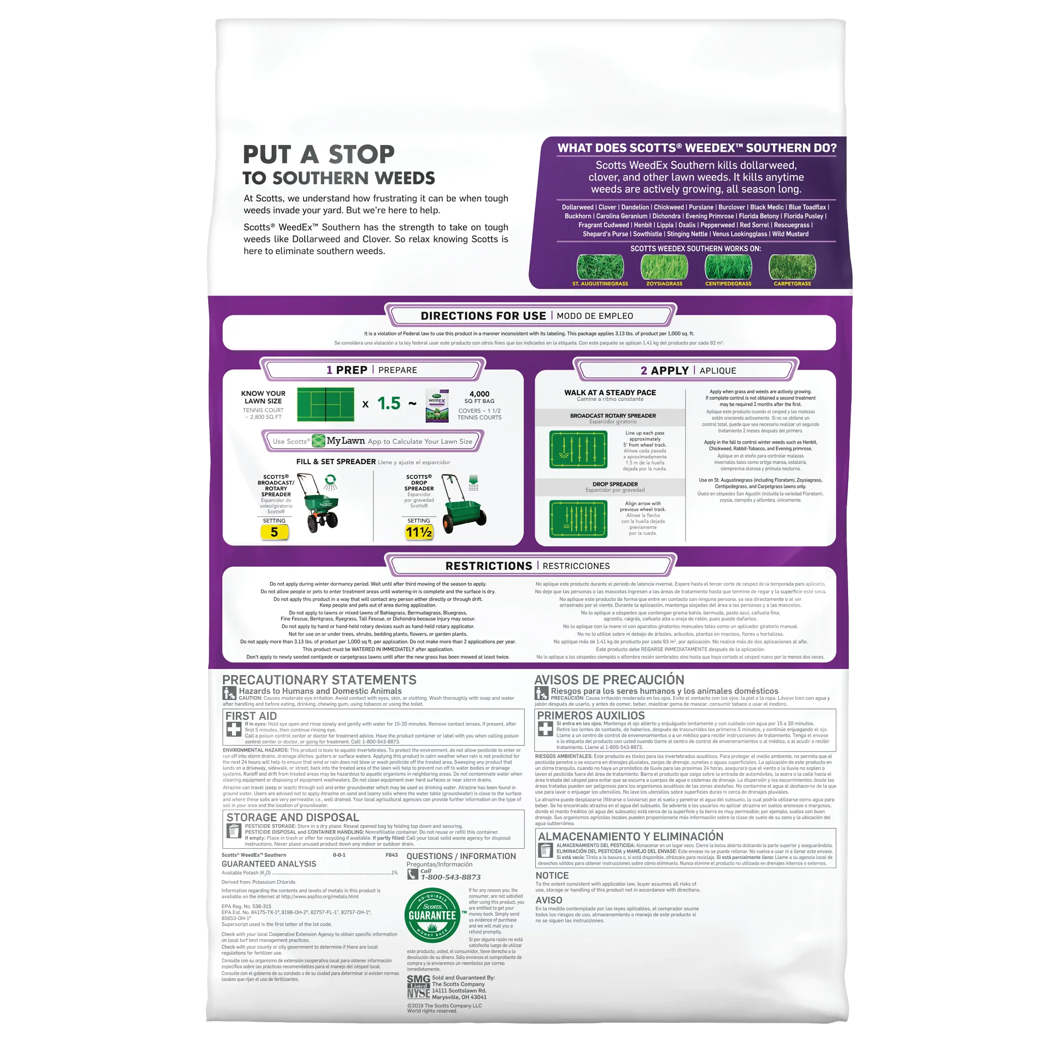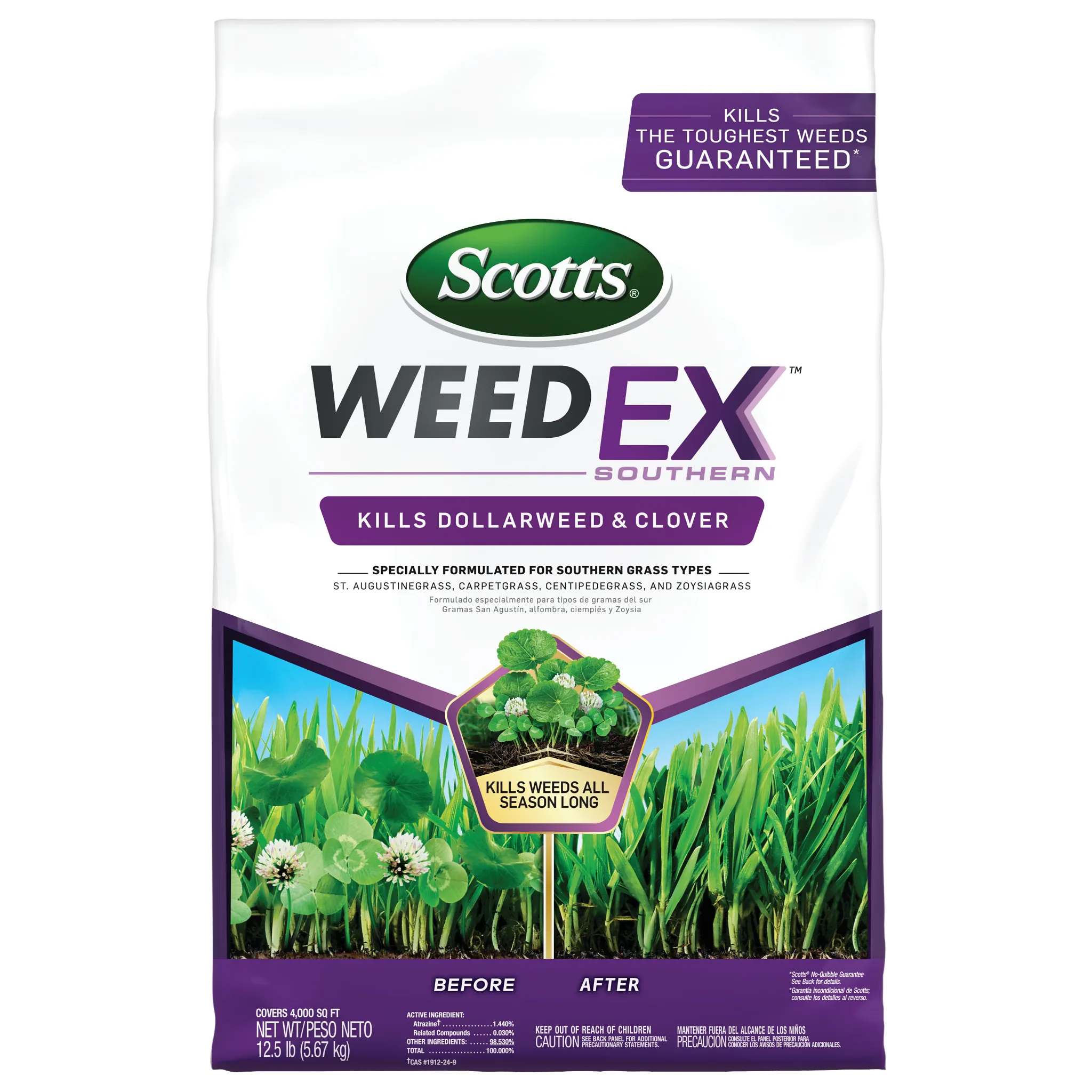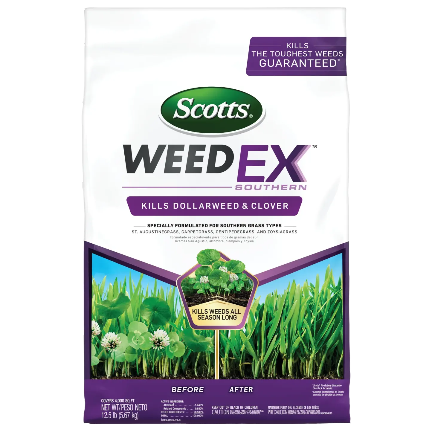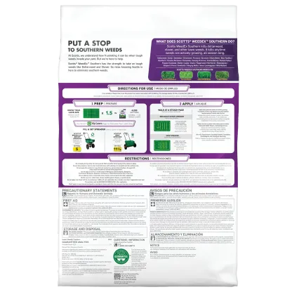 Kill the toughest Southern weeds with Scotts® WeedEx™ Southern. This lawn weed killer has the strength to kill tough weeds like dollarweed and clover all season long. It controls over 25 listed weeds, including dollarweed, clover, dandelion, chickweed, and oxalis. Scotts® WeedEx™ Southern is only for use on St. Augustinegrass (including Floratam), Centipedegrass, Zoysiagrass, and Carpetgrass. Apply when grass and weeds are actively growing. Use in the fall to control winter weeds such as henbit, rabbit-tobacco, and eveningprimrose. We recommend using a Scotts® spreader to apply this product. For Scotts® broadcast/rotary spreaders, use a setting of 5. For Scotts® drop spreaders, use a setting of 11 ½. This product must be watered in immediately after application. Do not apply during winter dormancy period - wait until after the third mowing of the season. Do not apply with a hand-held spreader. One 12.5 lb. bag of Scotts® WeedEx™ Southern covers 4,000 sq. ft.