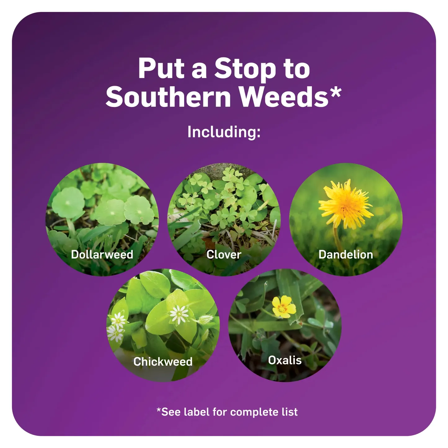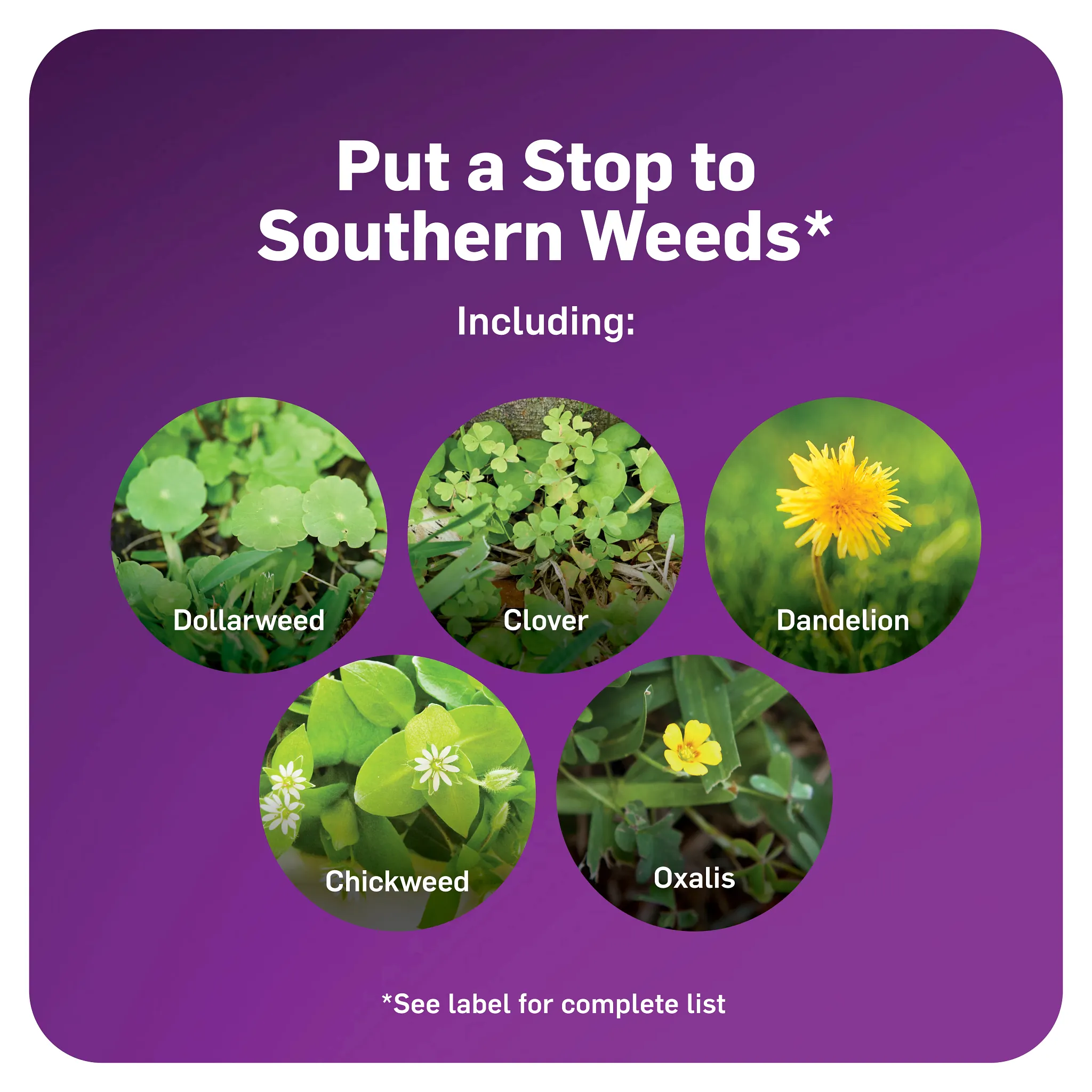 - This weed killer for Southern grass types controls dollarweed, clover, dandelion, chickweed, oxalis, henbit, eveningprimrose, and more as listed