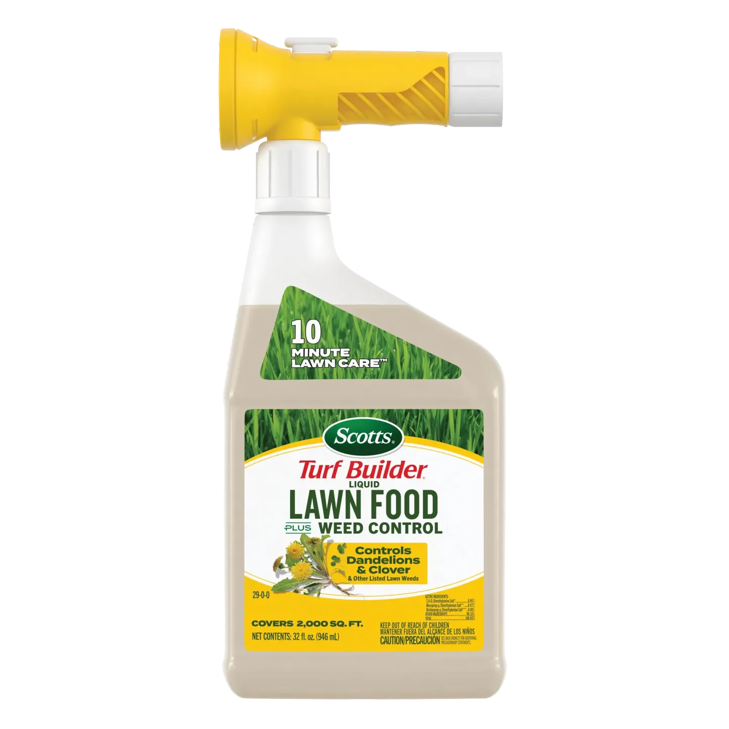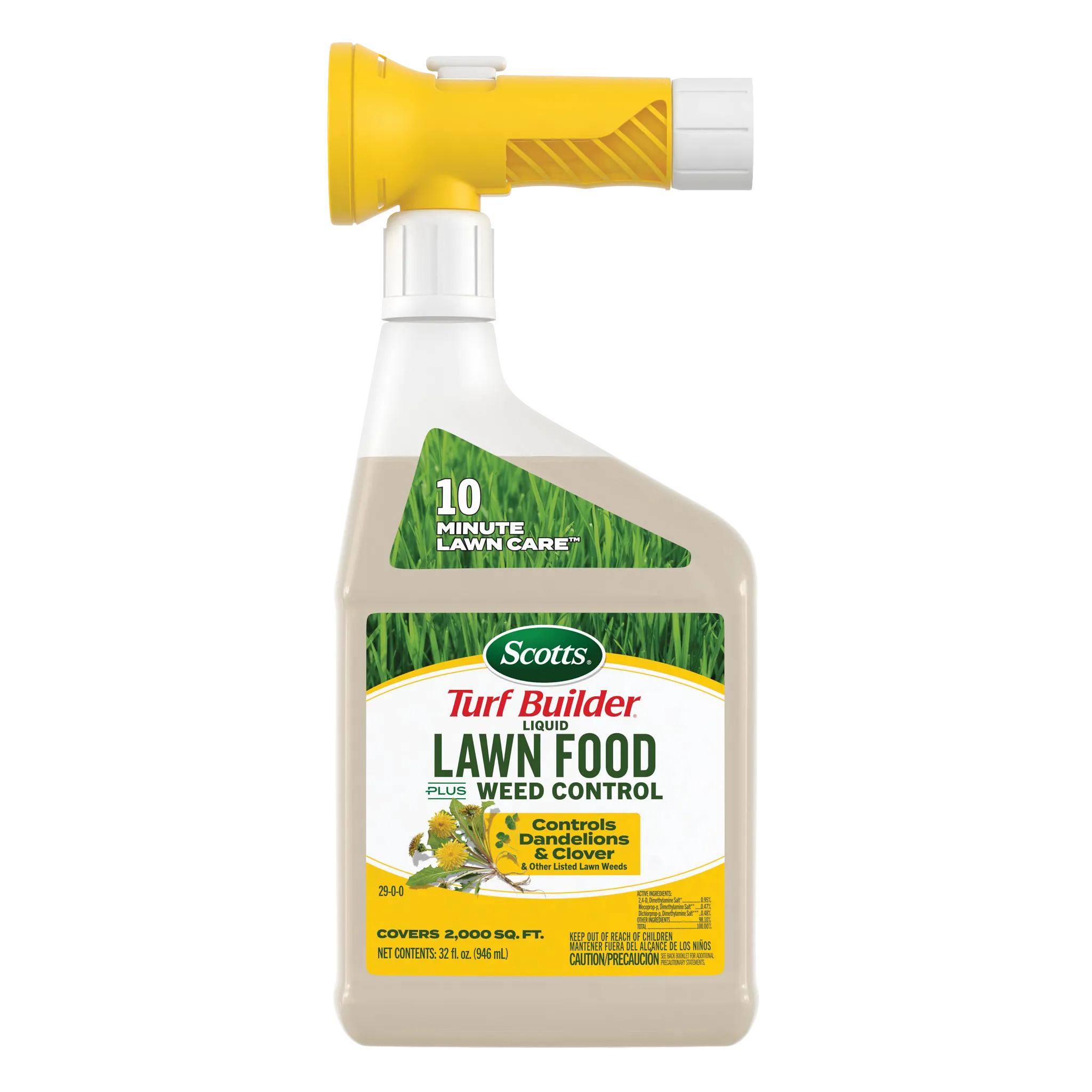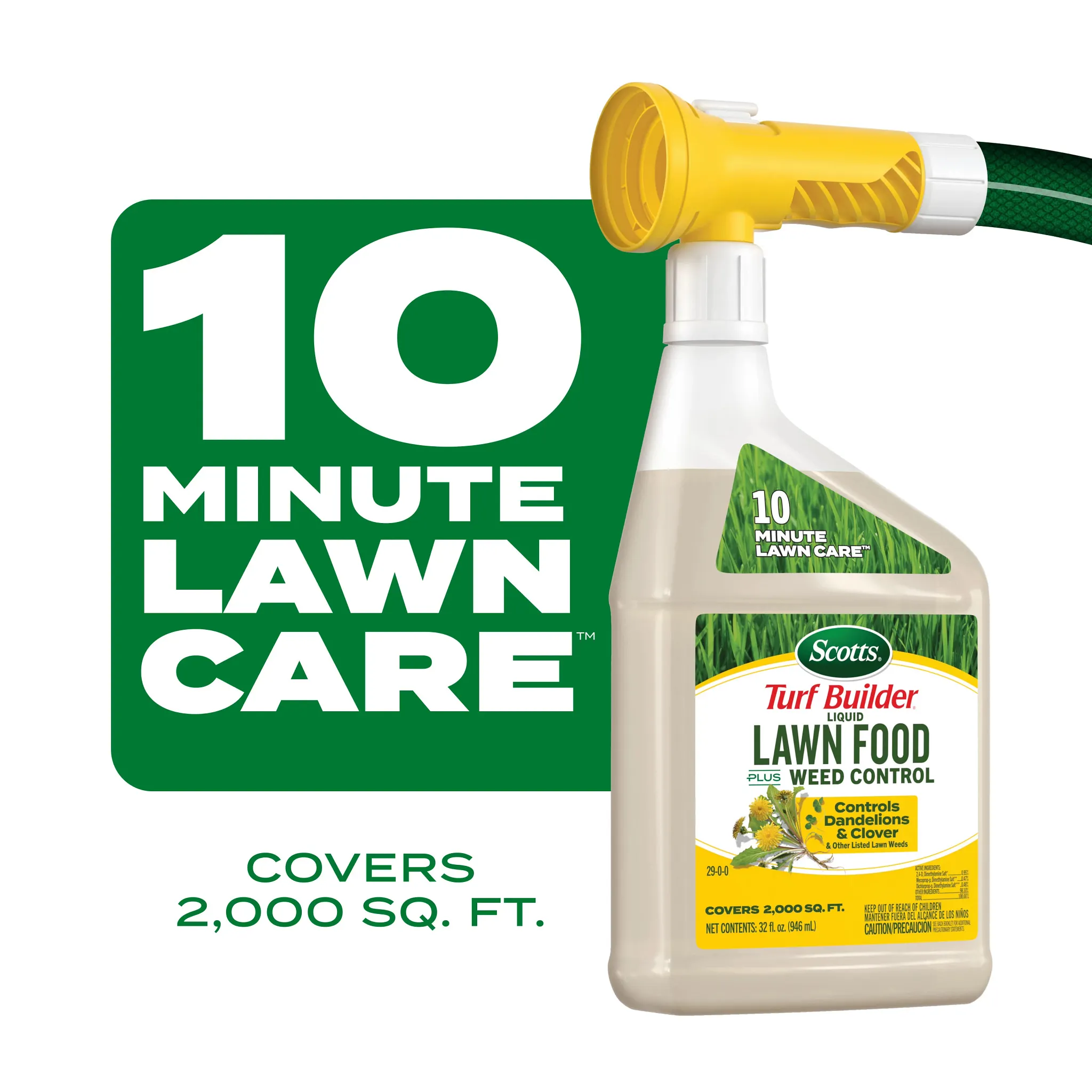 - 10 MINUTE LAWN CARE™: 32 fl. oz. bottle of Scotts® Turf Builder® Liquid Lawn Food Plus Weed Control covers a 2,000 sq. ft. lawn in 10 minutes