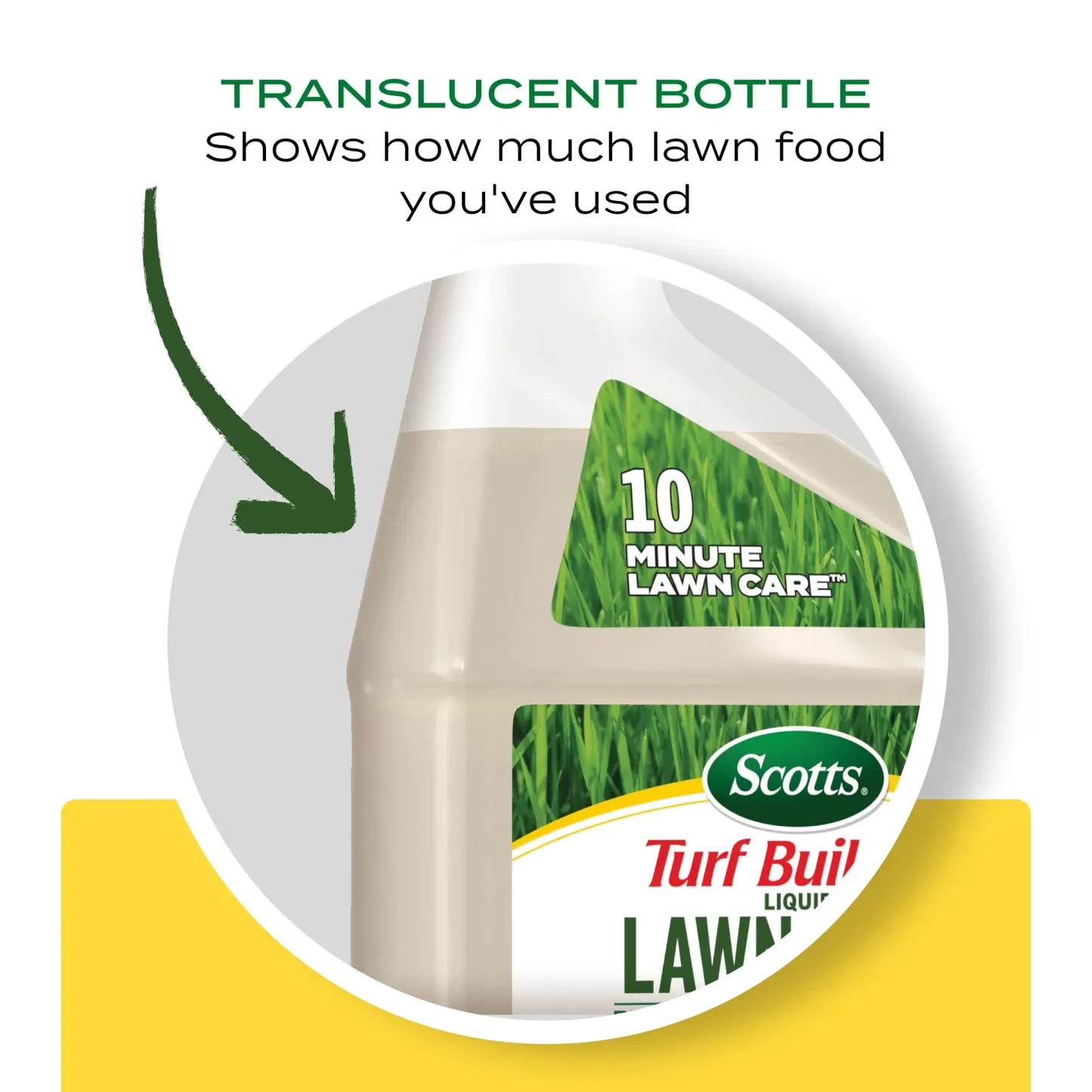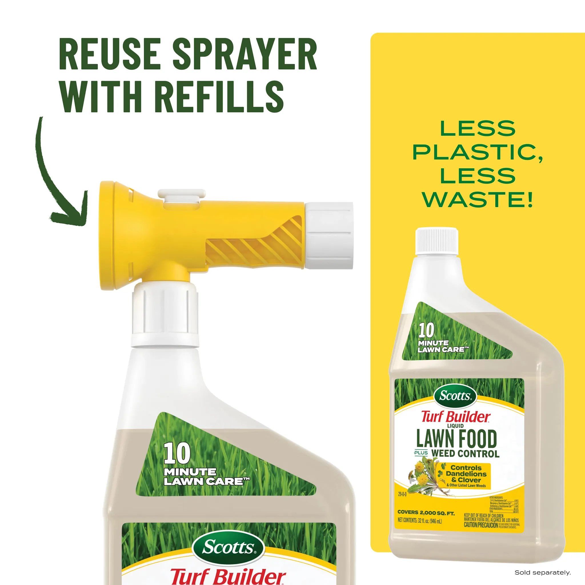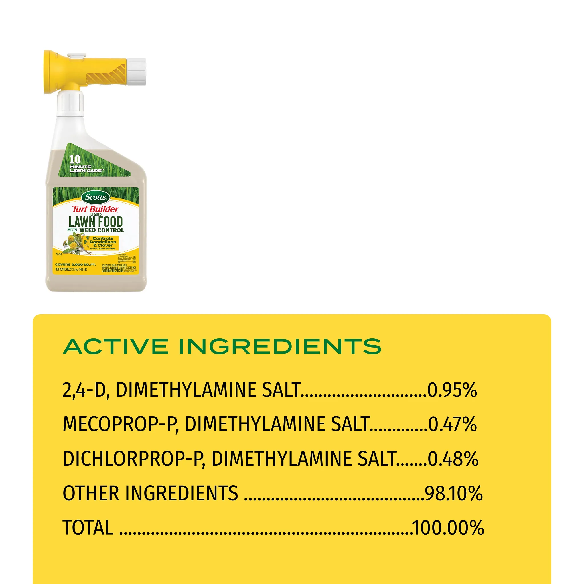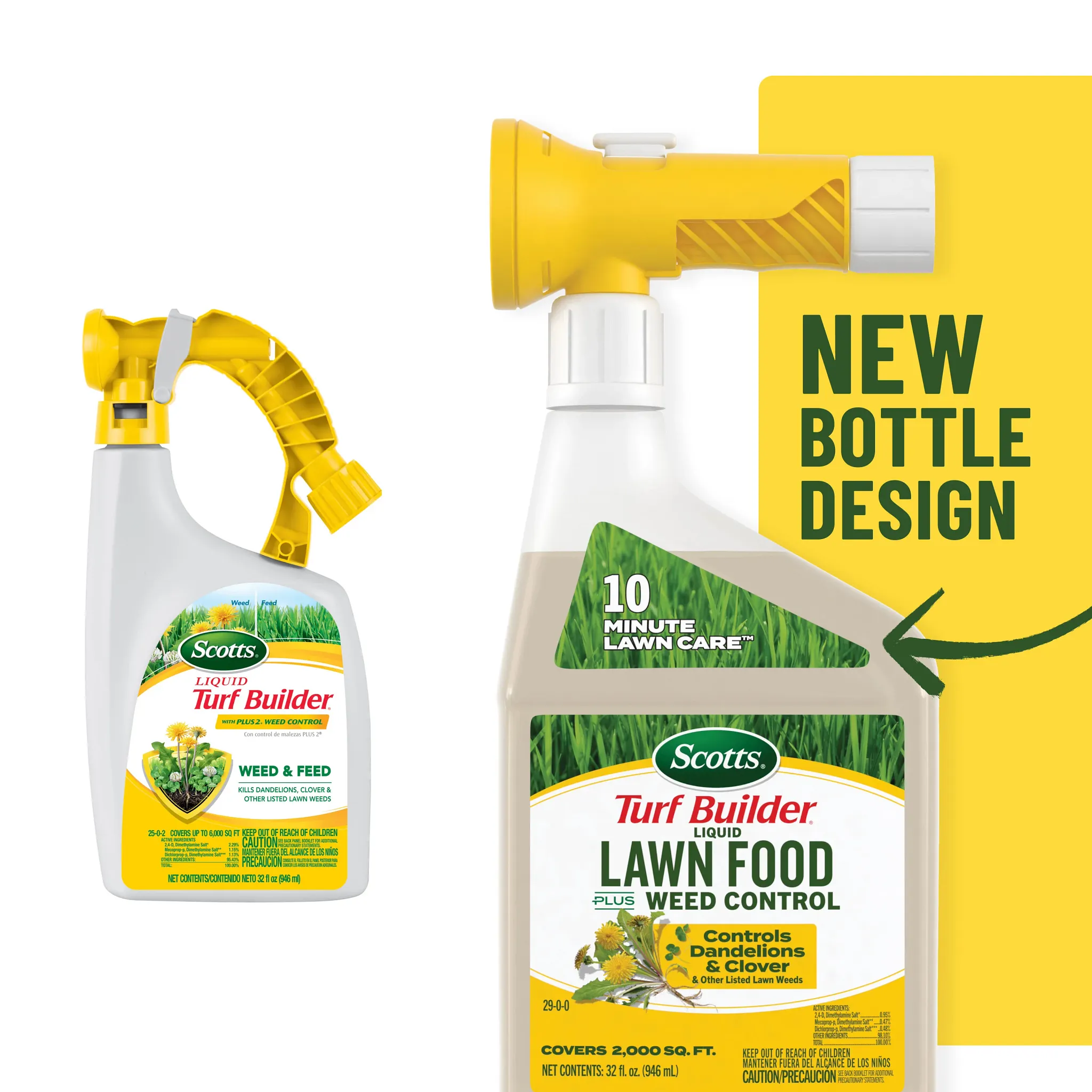 - 10 MINUTE LAWN CARE™: 32 fl. oz. bottle of Scotts® Turf Builder® Liquid Lawn Food Plus Weed Control covers a 2,000 sq. ft. lawn in 10 minutes