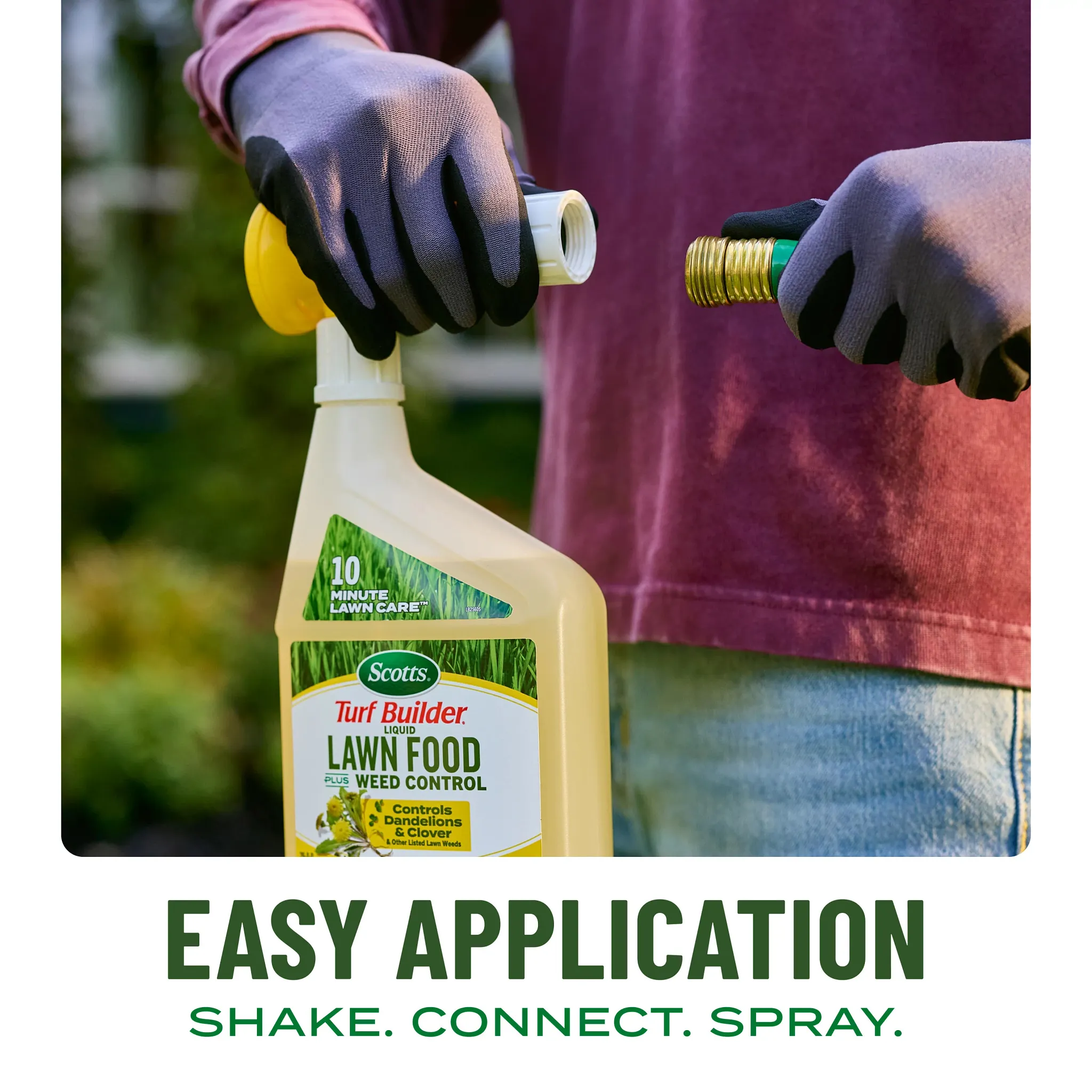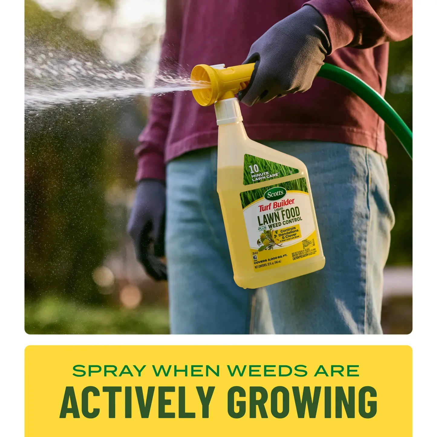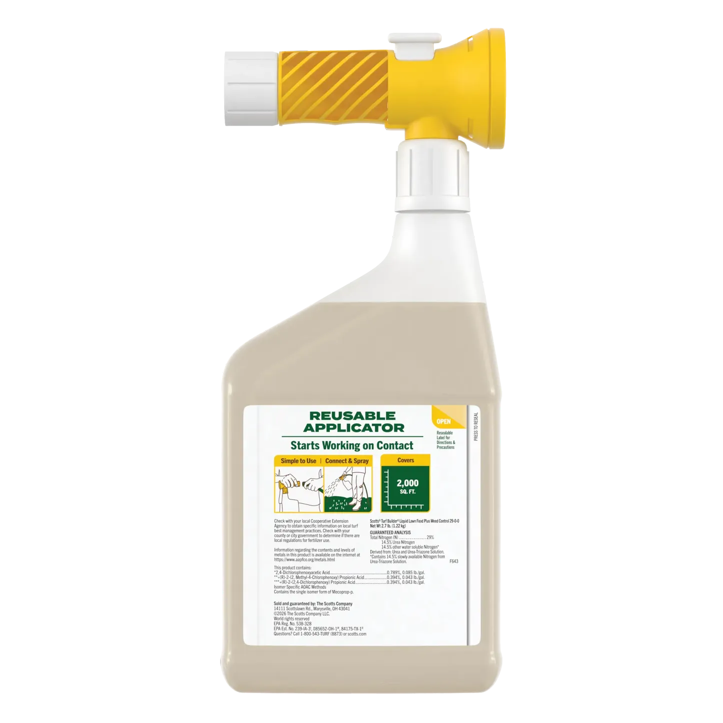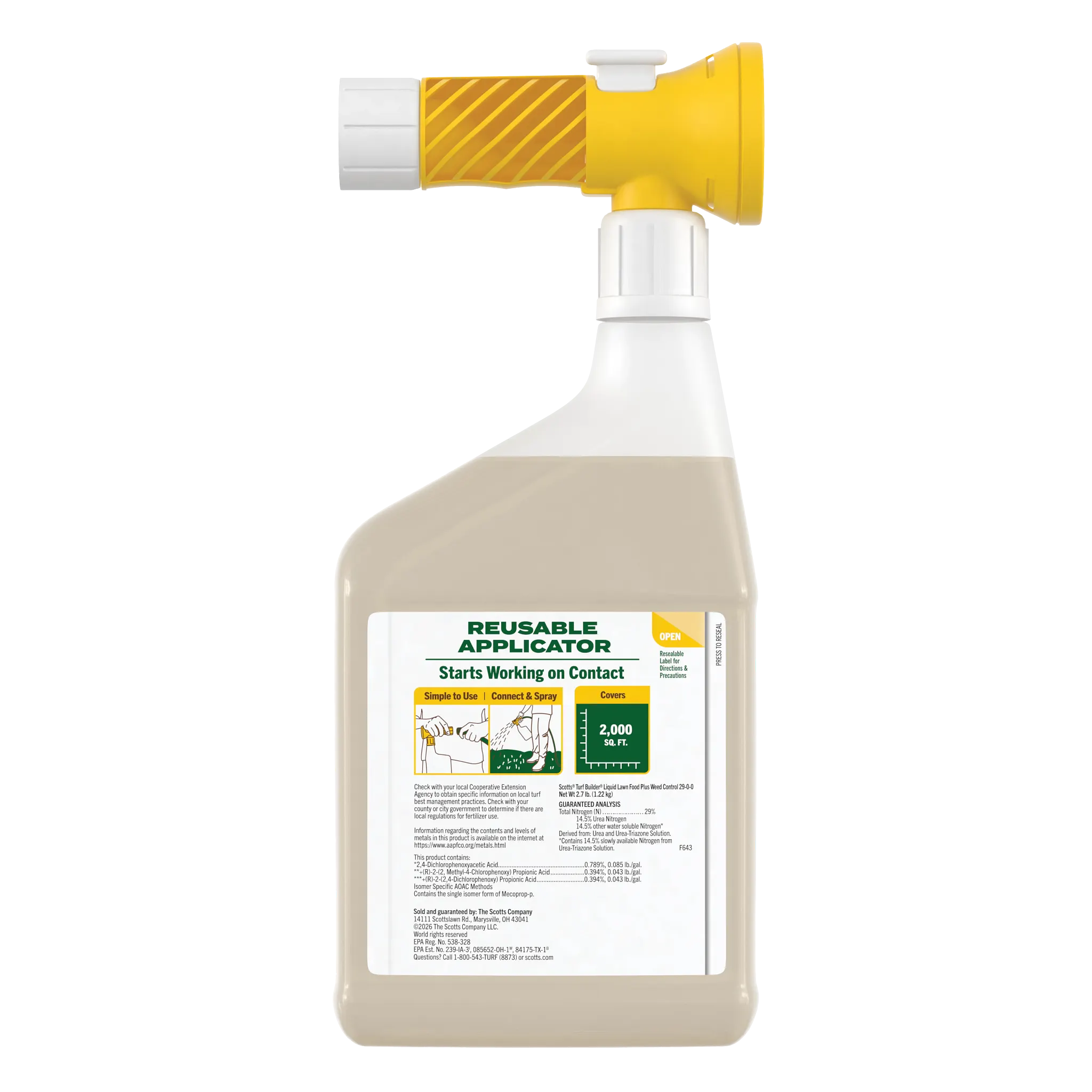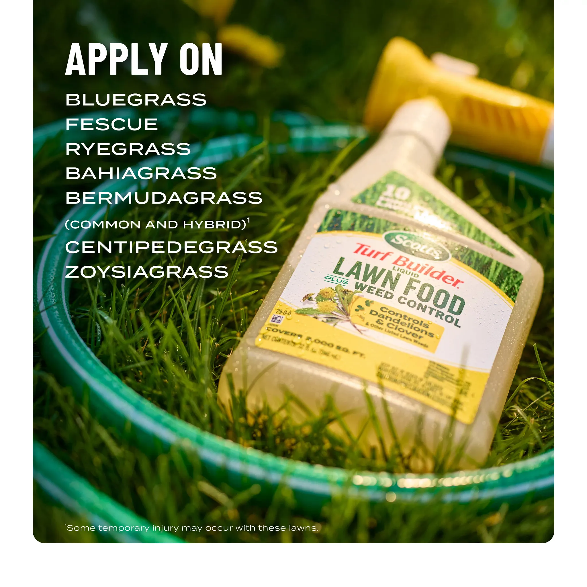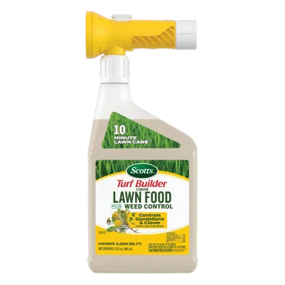 Tired of choosing between feeding your lawn and fighting weeds? With Scotts® Turf Builder® Liquid Lawn Food Plus Weed Control, you can do both at the same time. This powerful 2-in-1 formula makes lawn care incredibly simple and fast—you can cover a 2,000 sq. ft. lawn in 10 minutes, giving you more time to enjoy your yard. Getting started is a breeze. Just connect the reusable applicator to your garden hose, turn on the water, and spray. We even designed the bottle to be translucent, so you can see exactly how much you're applying, eliminating guesswork. The applicator is designed to be used again with our refill bottles, helping you reduce plastic waste. Our formula gets to work on contact, controlling stubborn weeds like dandelions and clover while feeding your grass the nutrients it needs to grow green, strong, and thick to crowd out future weeds. Apply to bluegrass, fescue, ryegrass, and other listed lawn types when weeds are actively growing to get the lawn you want, without the weeds.