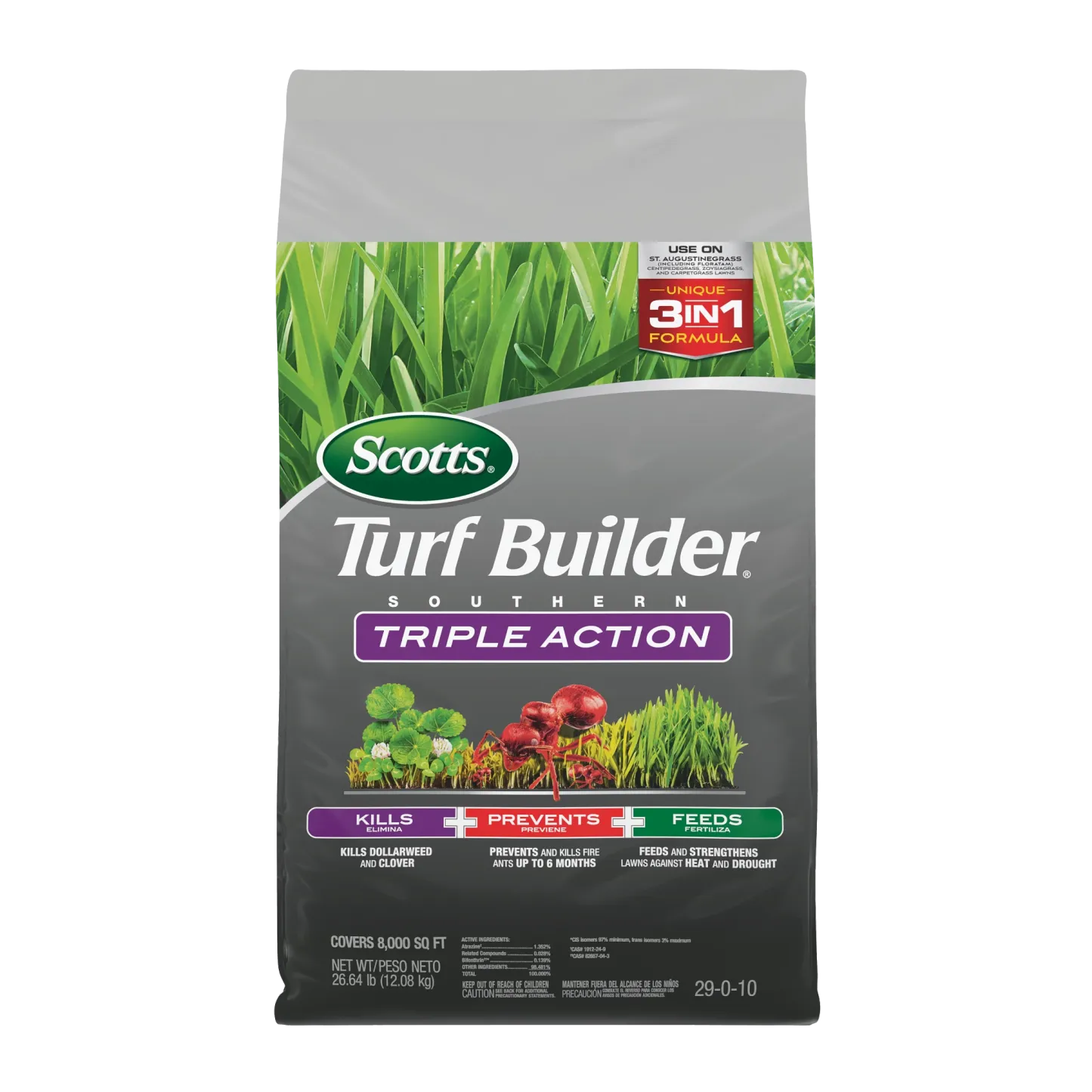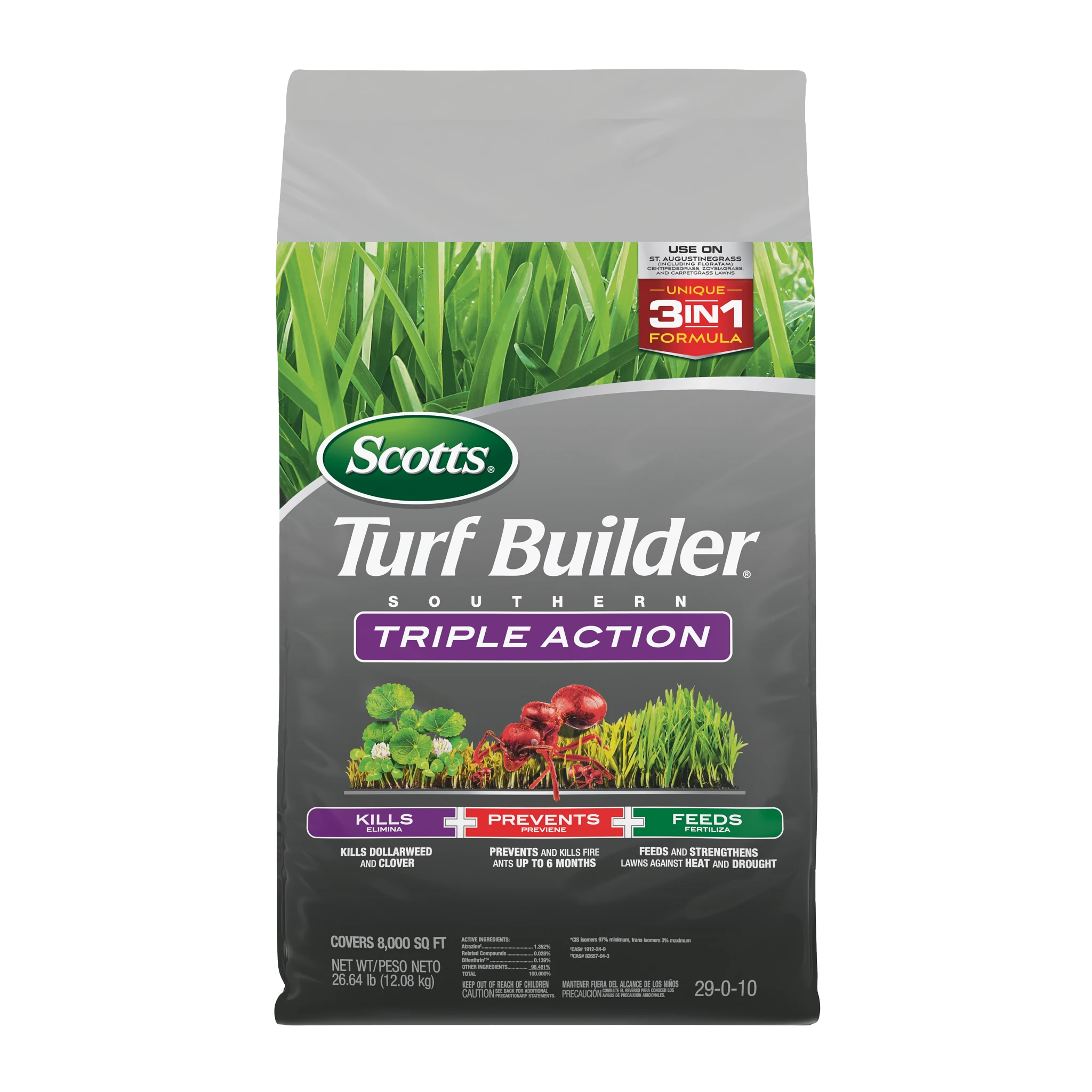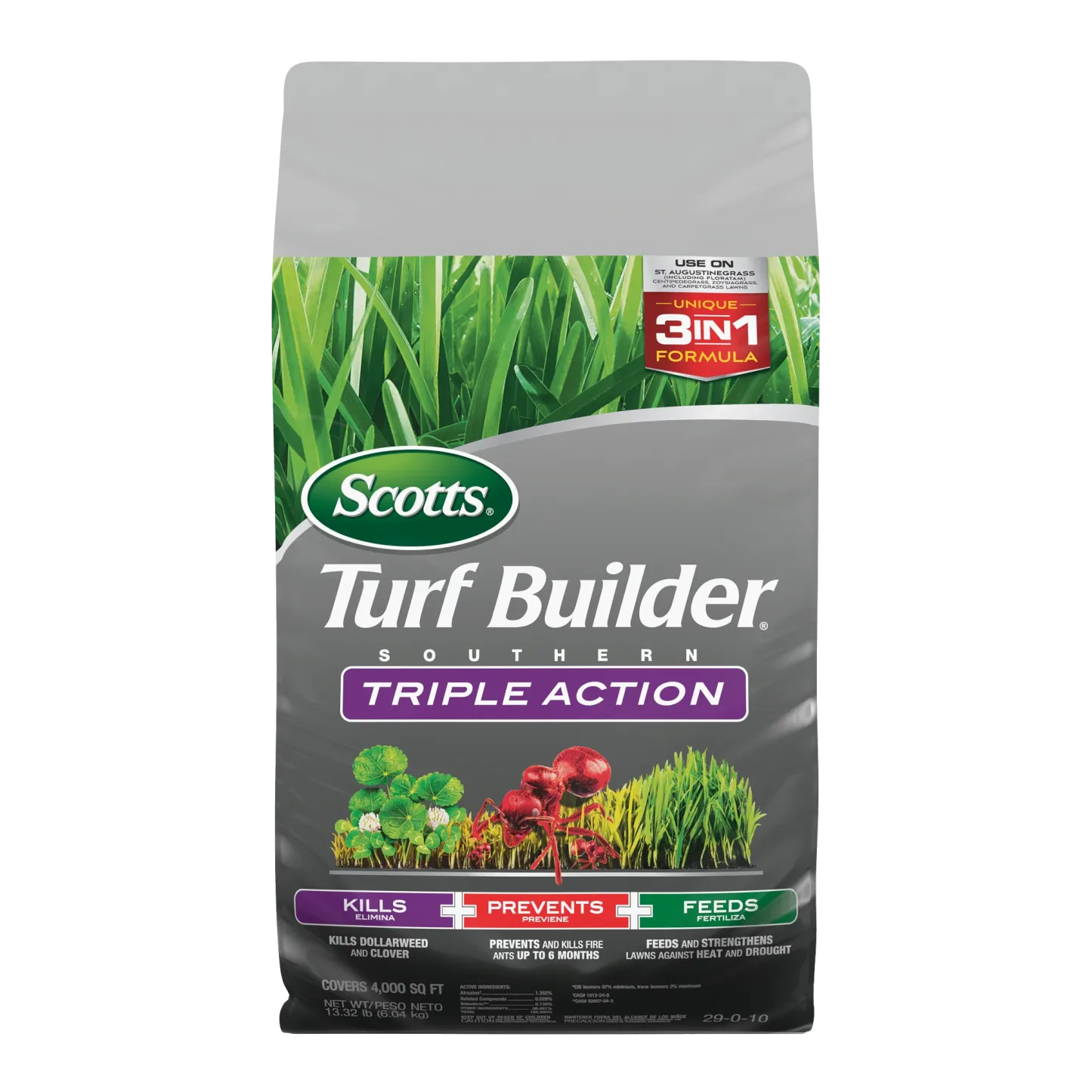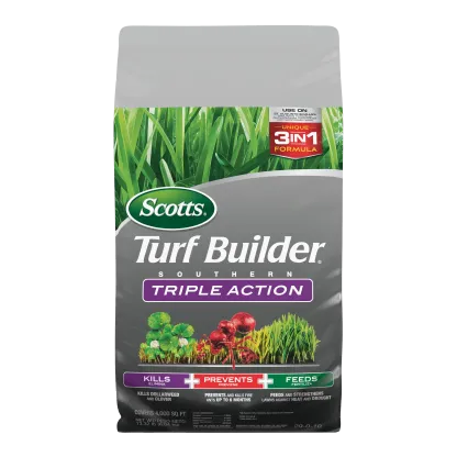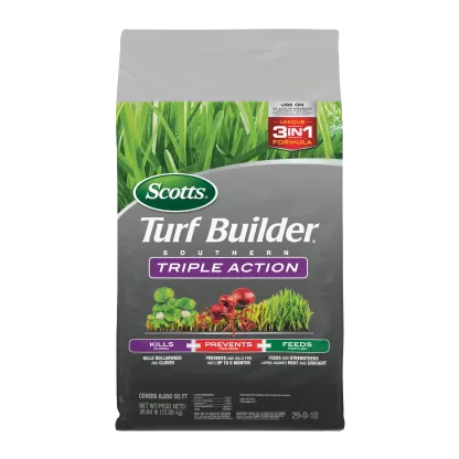A Southern lawn has to be tough. It's got to stand up to heat, drought, tough weeds like dollarweed, and fire ants. That's a tall order, but Scotts Turf Builder Southern Triple Action is up to the task. This is our all-in-one solution made specifically for Southern lawns. It packs a triple punch: it kills listed existing weeds, prevents and kills fire ants for up to 6 months, and gives your lawn a good feeding to help it build strong, deep roots. A stronger lawn is better able to handle the stresses of a Southern summer. It's the simple, three-in-one solution for a beautiful, resilient lawn.