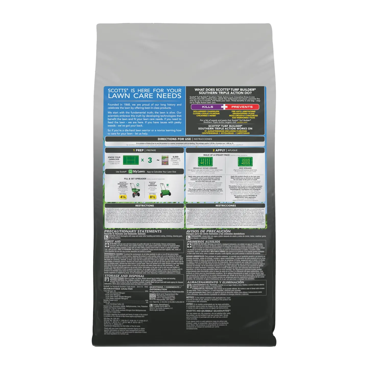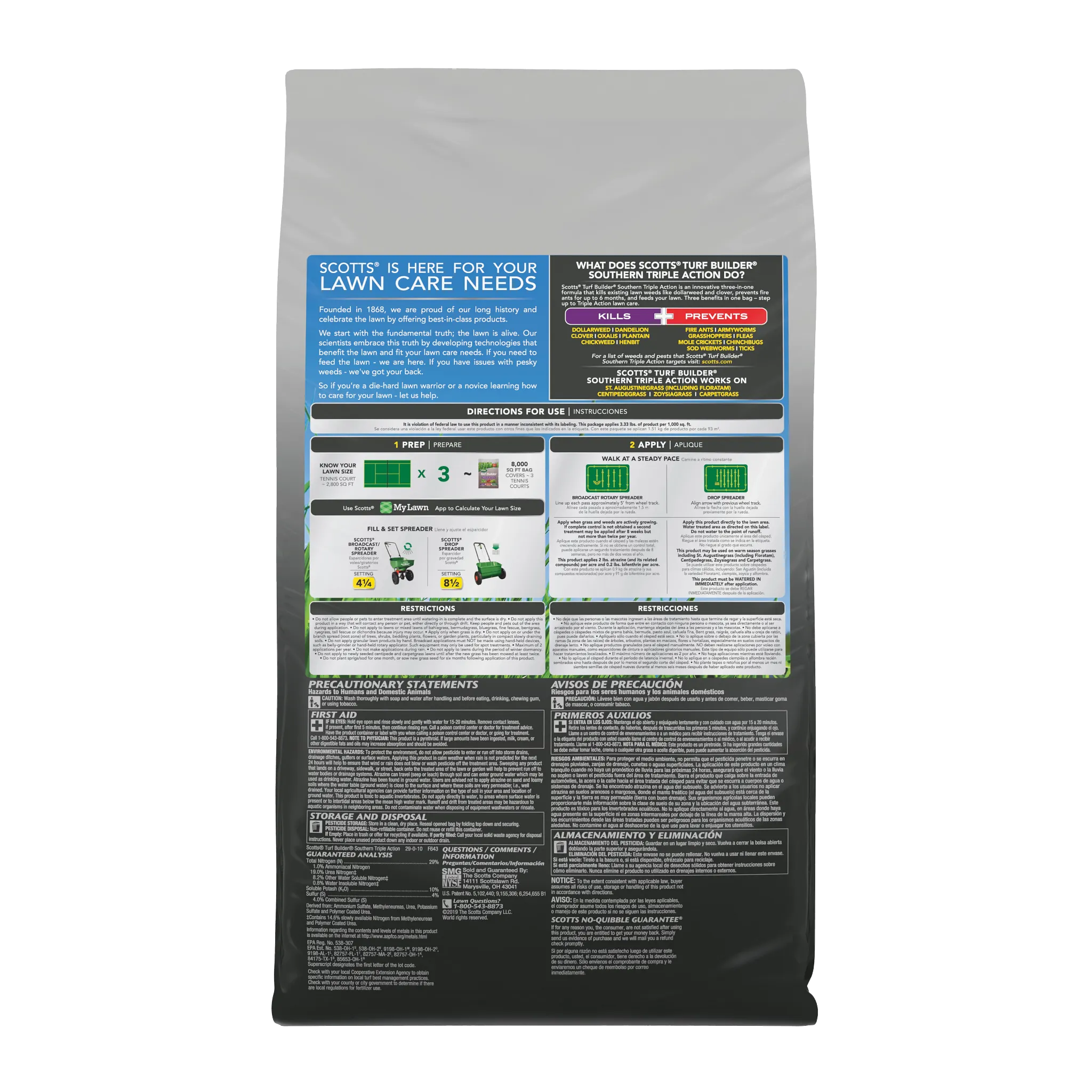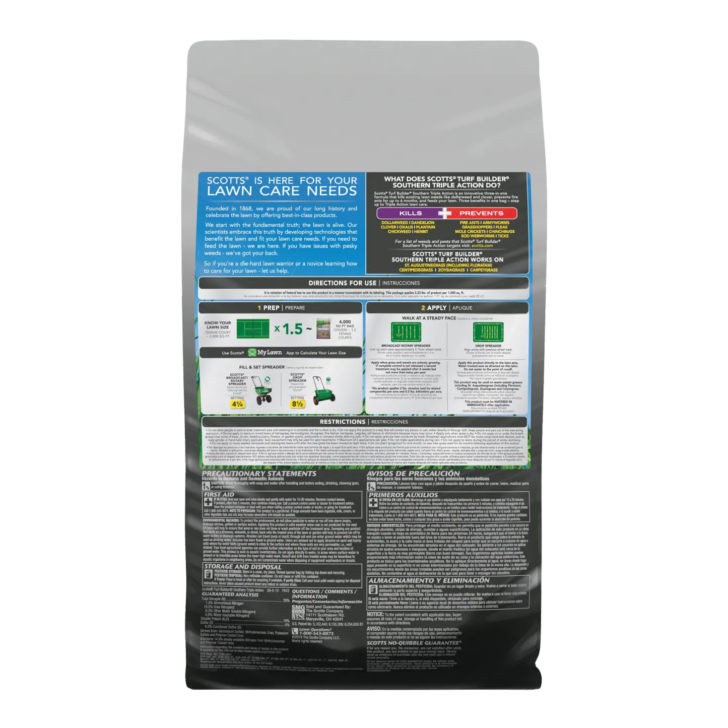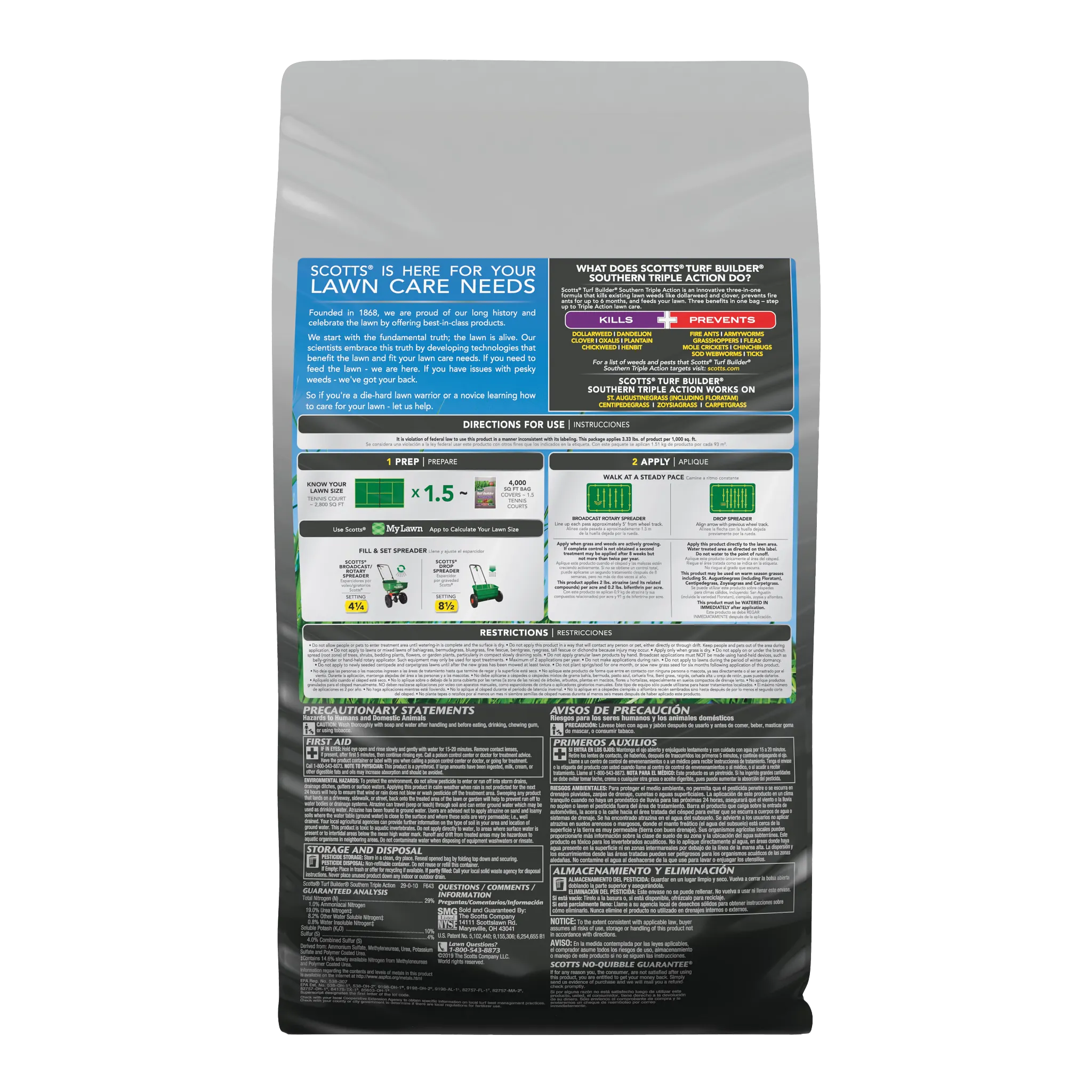 A Southern lawn has to be tough. It's got to stand up to heat, drought, tough weeds like dollarweed, and fire ants. That's a tall order, but Scotts Turf Builder Southern Triple Action is up to the task. This is our all-in-one solution made specifically for Southern lawns. It packs a triple punch: it kills listed existing weeds, prevents and kills fire ants for up to 6 months, and gives your lawn a good feeding to help it build strong, deep roots. A stronger lawn is better able to handle the stresses of a Southern summer. It's the simple, three-in-one solution for a beautiful, resilient lawn.