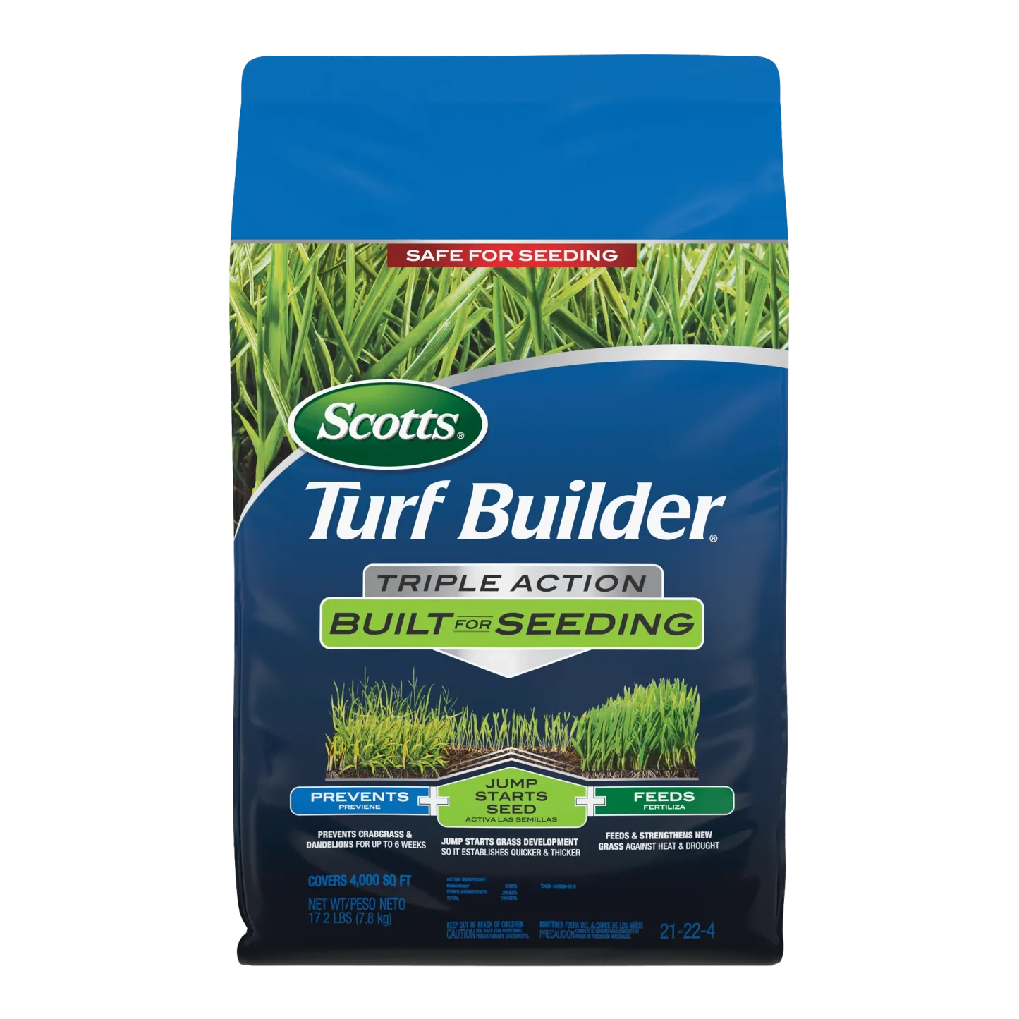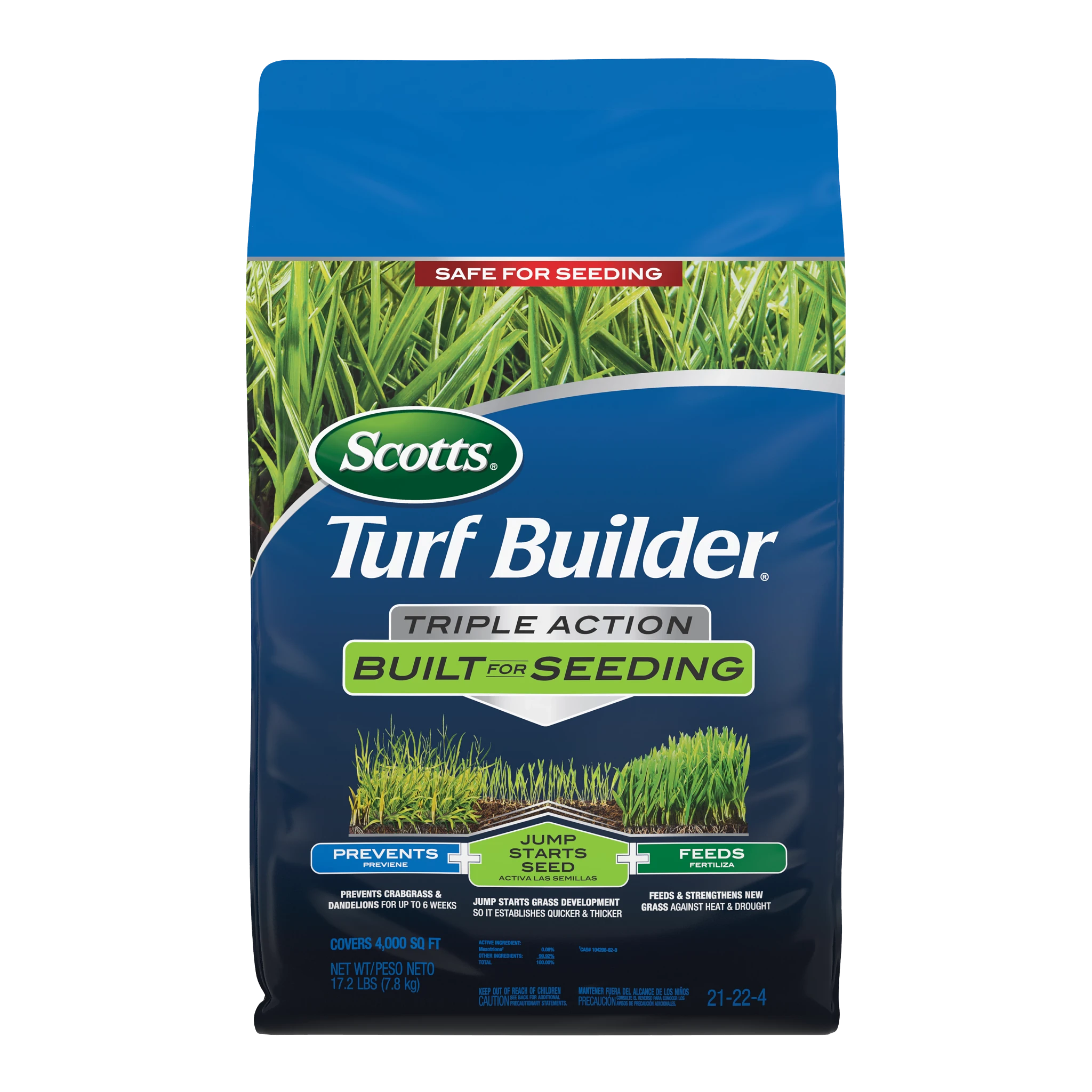 - Designed to be used when planting new grass, Scotts® Turf Builder® Triple Action Built For Seeding prevents dandelion and crabgrass for up to 6 weeks without harming new grass, jumpstarts grass development, and feeds to protect against heat and drought
