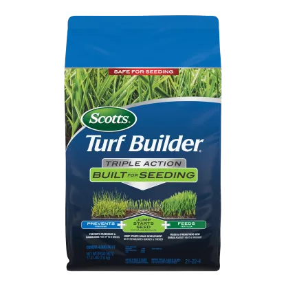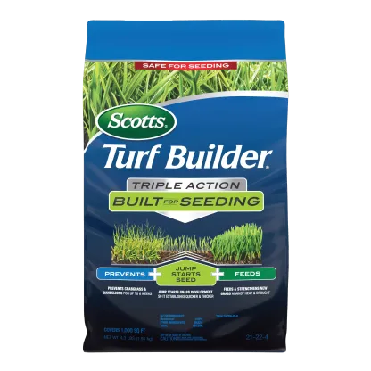 Your lawn can have it all when you use Scotts® Turf Builder® Triple Action Built For Seeding. Designed to be used when planting new grass, this product prevents dandelion and crabgrass for up to 6 weeks without harming new grass, jumpstarts grass development so it establishes thicker and quicker, and feeds to protect against heat and drought. Other weeds prevented are clover, ground ivy, chickweed, henbit, and nutsedge. Scotts® Turf Builder® Triple Action Built For Seeding is for use on newly seeded, overseeded, or newly planted Kentucky Bluegrass, Tall Fescue, Perennial Ryegrass, Centipedegrass, and Fine Fescues. Apply to a dry lawn when temperatures are consistently between 60°F and 90°F. We recommend applying this product with a Scotts® spreader. For Scotts® broadcast/rotary spreaders, use a setting of 4 ½. For Scotts® drop spreaders, use a setting of 7. For Scotts® Wizz, use a setting of 4 ¾. Lightly water in to activate. This product does not include seed and will not kill existing weeds. One 4.3 lb. bag of Scotts® Turf Builder® Triple Action Built For Seeding covers 1,000 sq. ft.