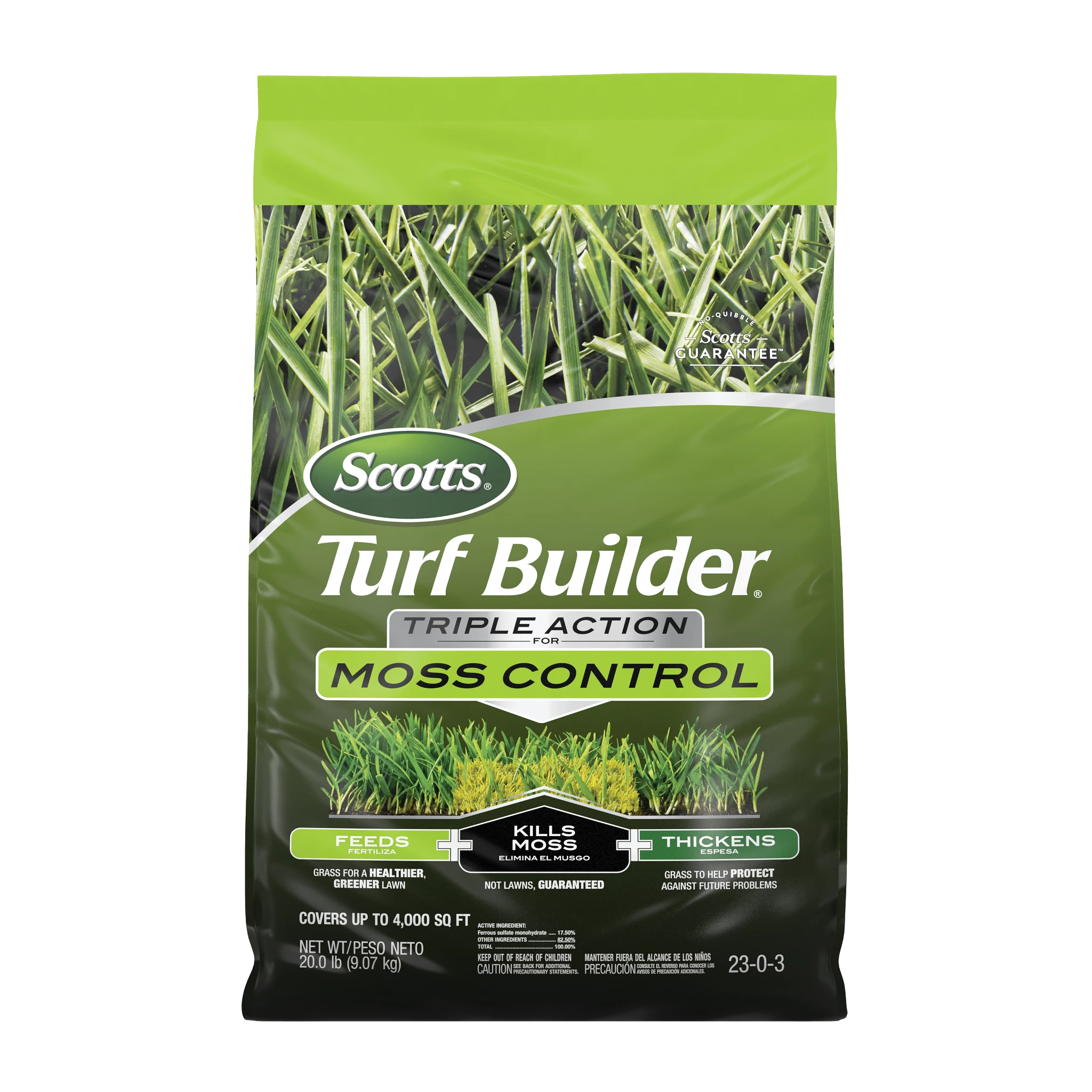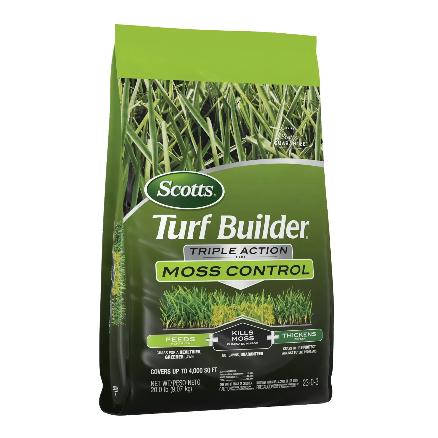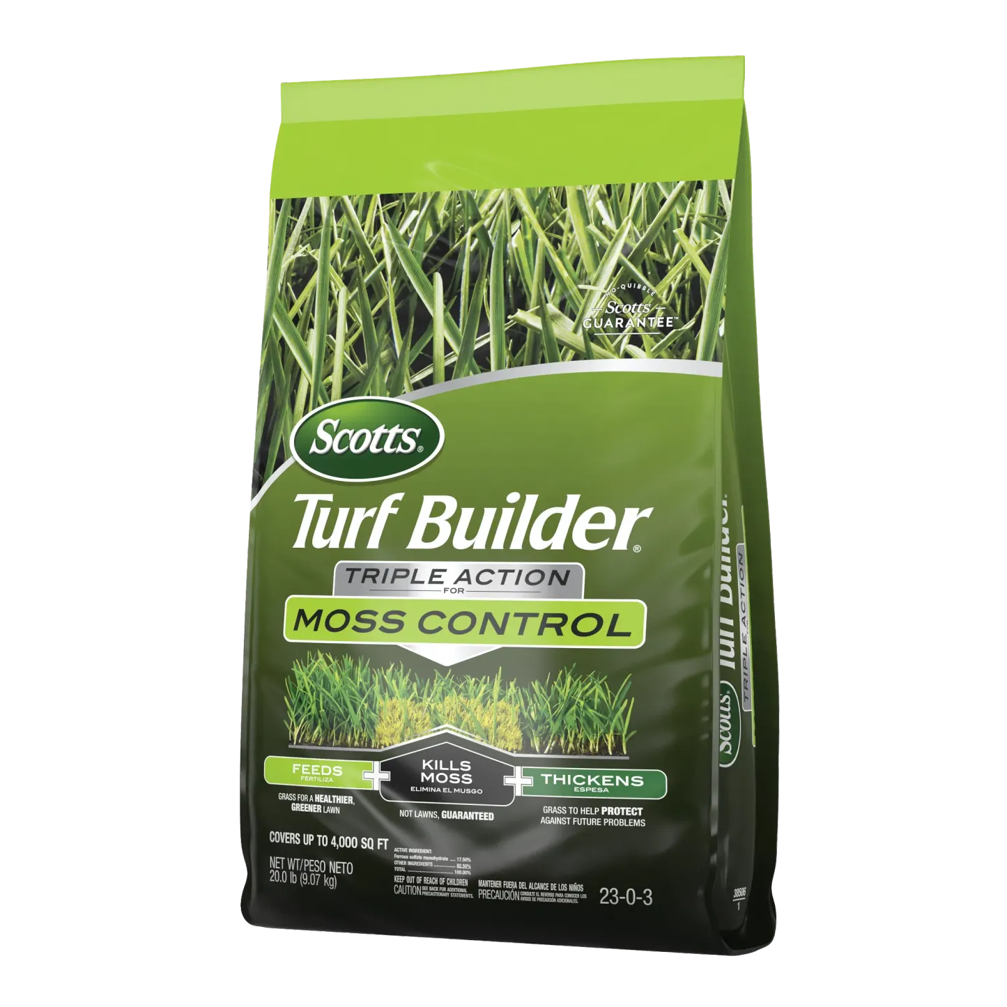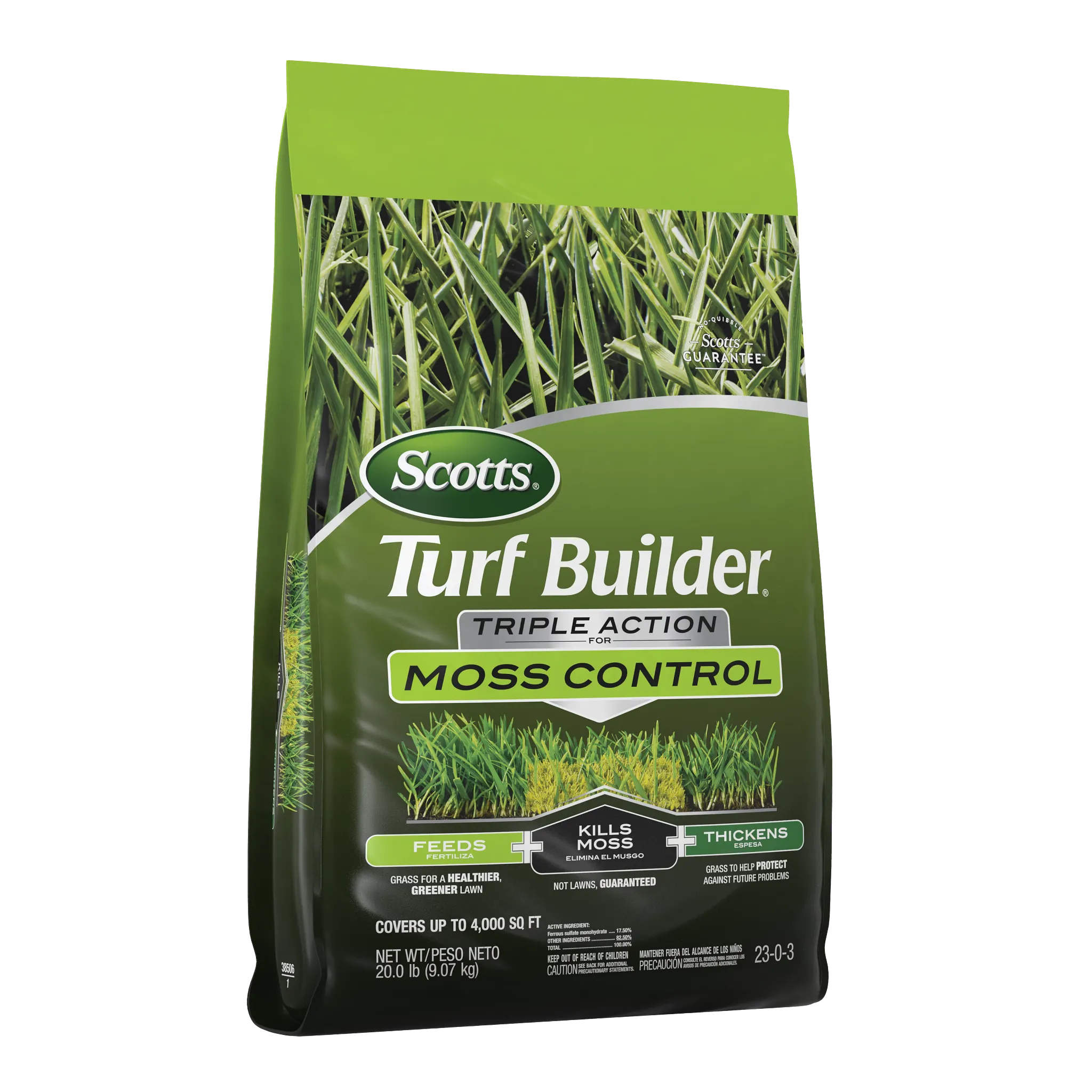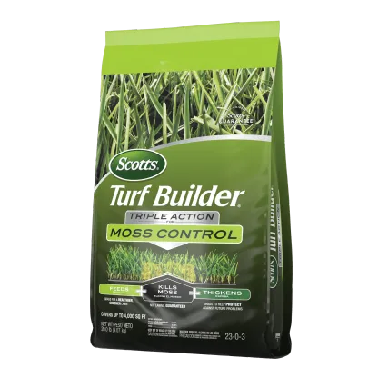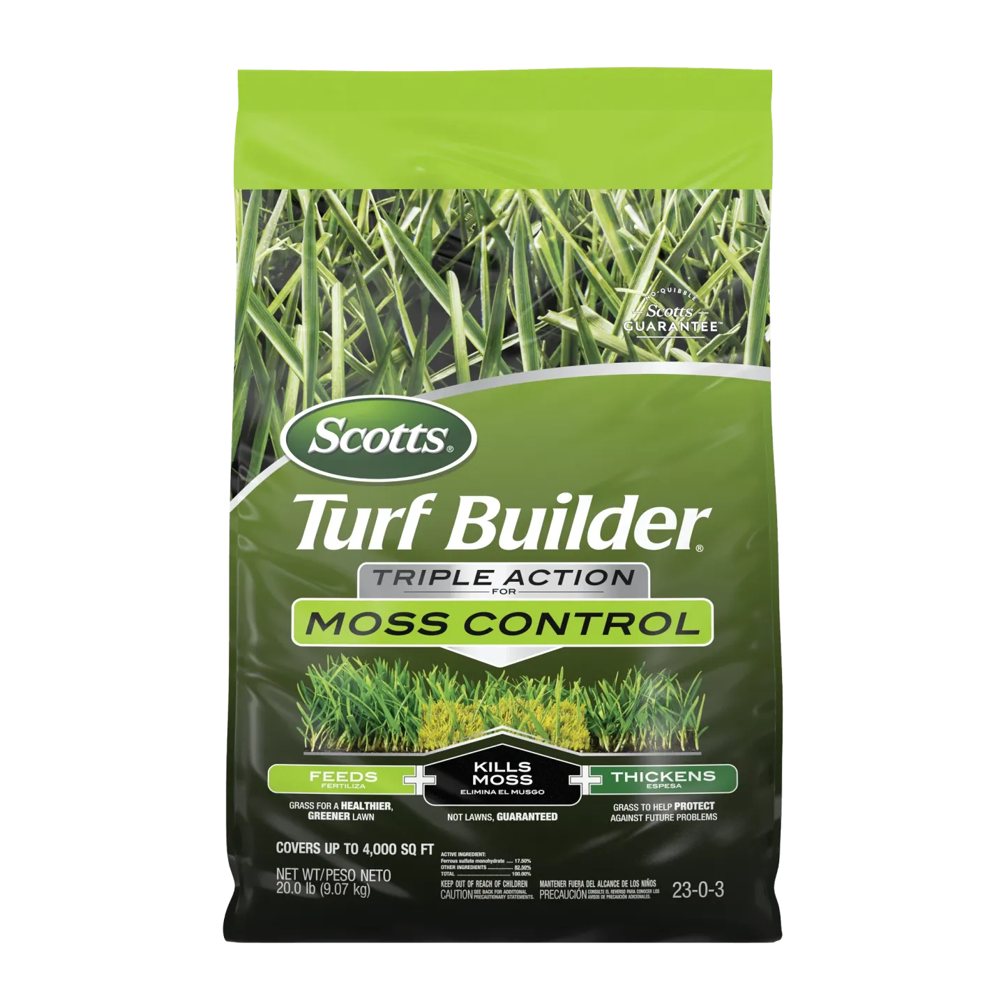Banish moss and grow a lush lawn with the help of Scotts® Turf Builder® Triple Action for Moss Control. This 3-in-1 lawn care product kills moss, feeds grass for a healthier, greener lawn, and thickens grass to help protect against future problems. Scotts® Turf Builder® Triple Action for Moss Control is for use on most grass types. Apply during winter or spring when moss is actively growing. It is best applied when the lawn is moist and tall grass has been mowed to expose low growing moss. We recommend using a Scotts® spreader to apply this product. For Scotts® broadcast/rotary spreaders, use a setting of 5 for the regular rate or 5 ¾ for the heavy rate. For Scotts® drop spreaders, use a setting of 8 for the regular rate or 8 ½ for the heavy rate. For Scotts® Wizz, use a setting of 5 for the regular rate or 5 ½ for the heavy rate. Grass blades may temporarily turn black after application; however, this condition will disappear after mowing. Always wait 6 to 8 weeks between applications. One 20 lb. bag of Scotts® Turf Builder® Triple Action for Moss Control covers up to 4,000 sq. ft.