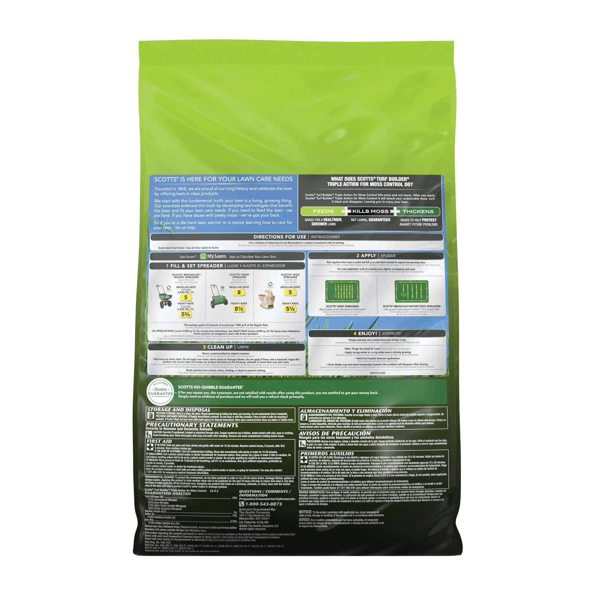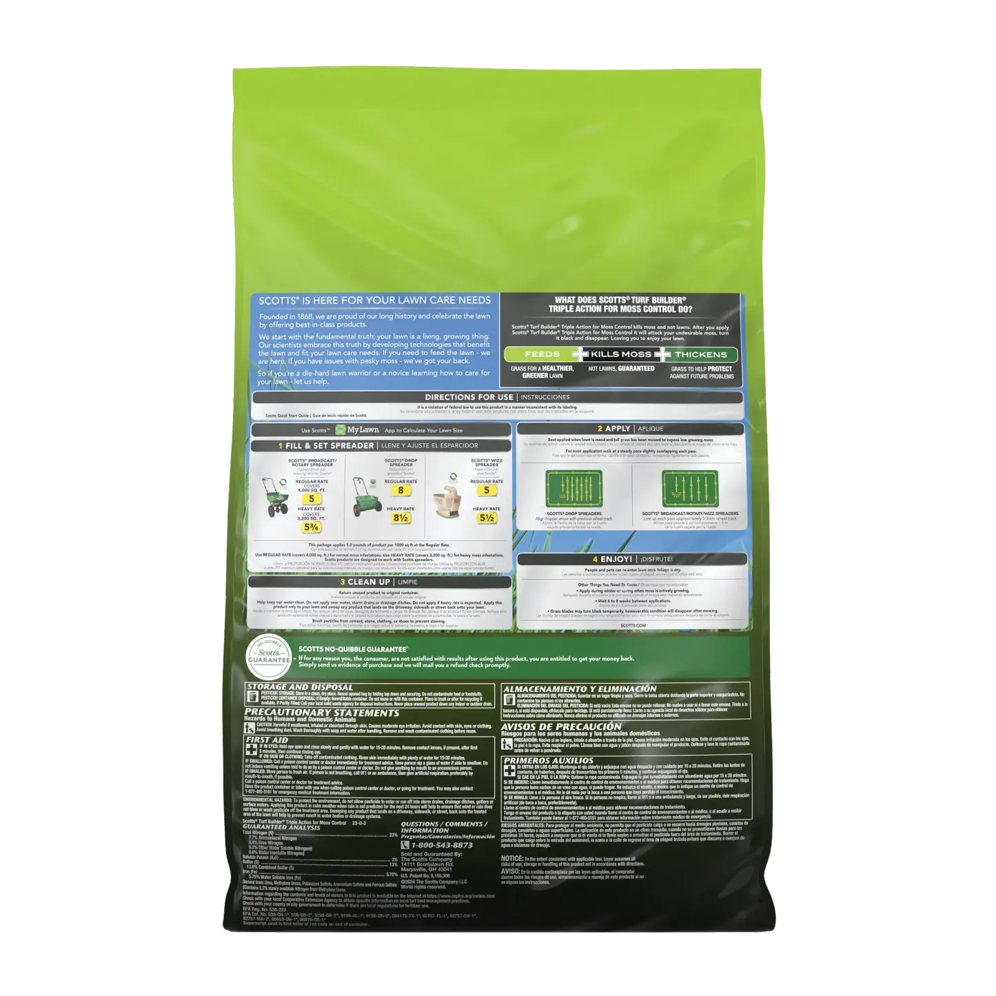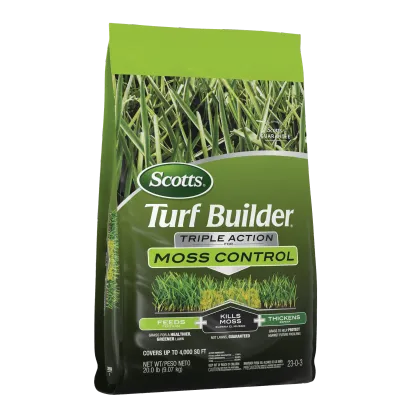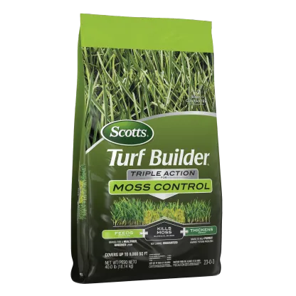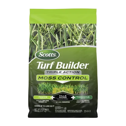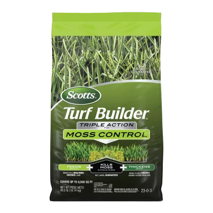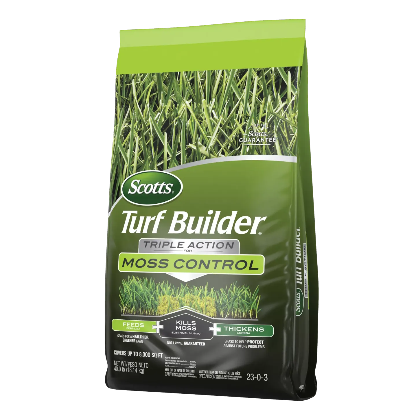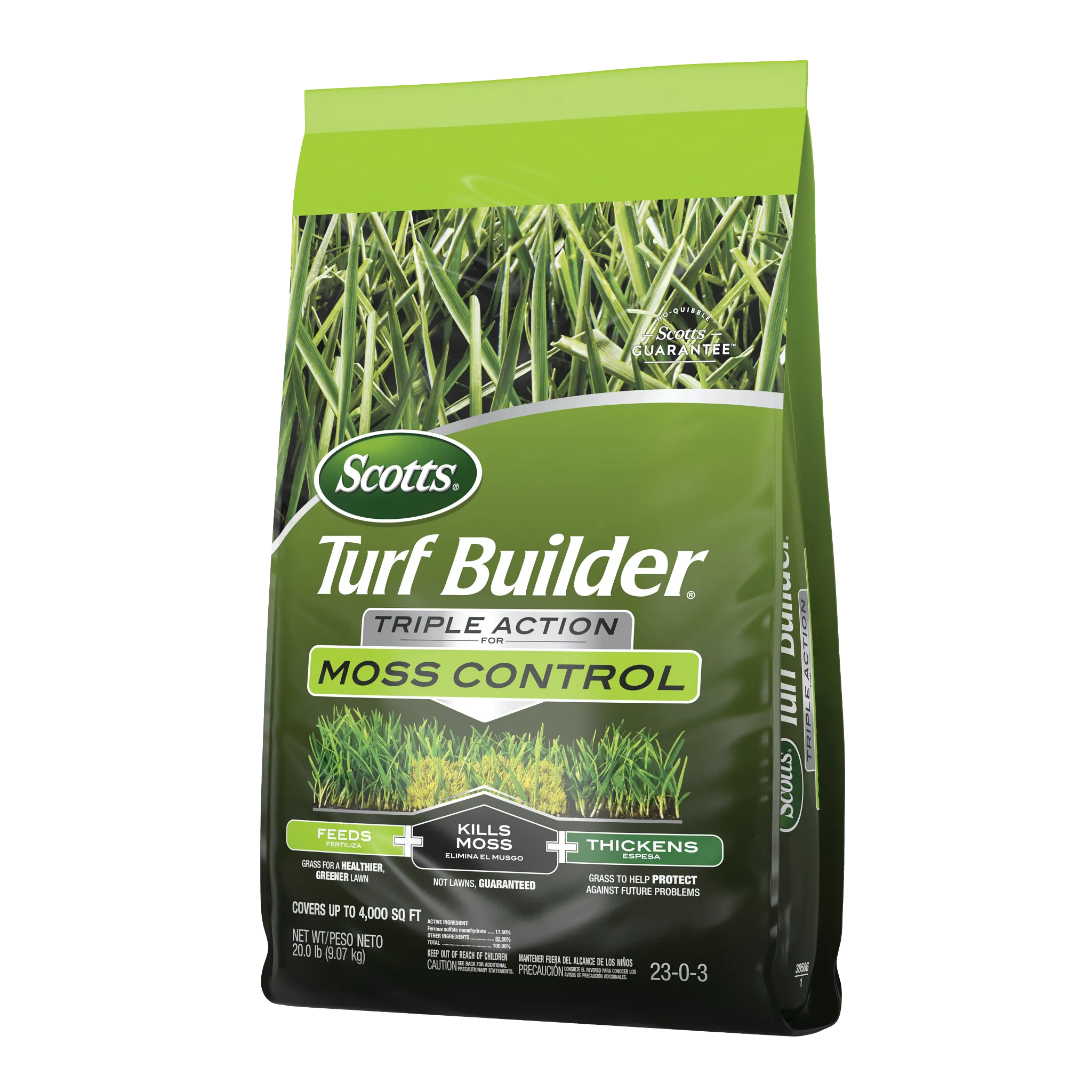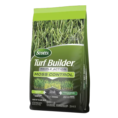 Banish moss and grow a lush lawn with the help of Scotts® Turf Builder® Triple Action for Moss Control. This 3-in-1 lawn care product kills moss, feeds grass for a healthier, greener lawn, and thickens grass to help protect against future problems. Scotts® Turf Builder® Triple Action for Moss Control is for use on most grass types. Apply during winter or spring when moss is actively growing. It is best applied when the lawn is moist and tall grass has been mowed to expose low growing moss. We recommend using a Scotts® spreader to apply this product. For Scotts® broadcast/rotary spreaders, use a setting of 5 for the regular rate or 5 ¾ for the heavy rate. For Scotts® drop spreaders, use a setting of 8 for the regular rate or 8 ½ for the heavy rate. For Scotts® Wizz, use a setting of 5 for the regular rate or 5 ½ for the heavy rate. Grass blades may temporarily turn black after application; however, this condition will disappear after mowing. Always wait 6 to 8 weeks between applications. One 20 lb. bag of Scotts® Turf Builder® Triple Action for Moss Control covers up to 4,000 sq. ft.