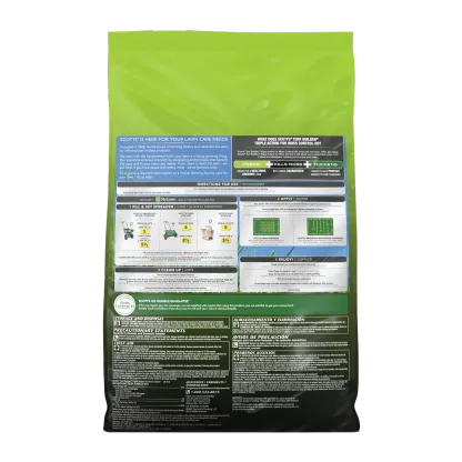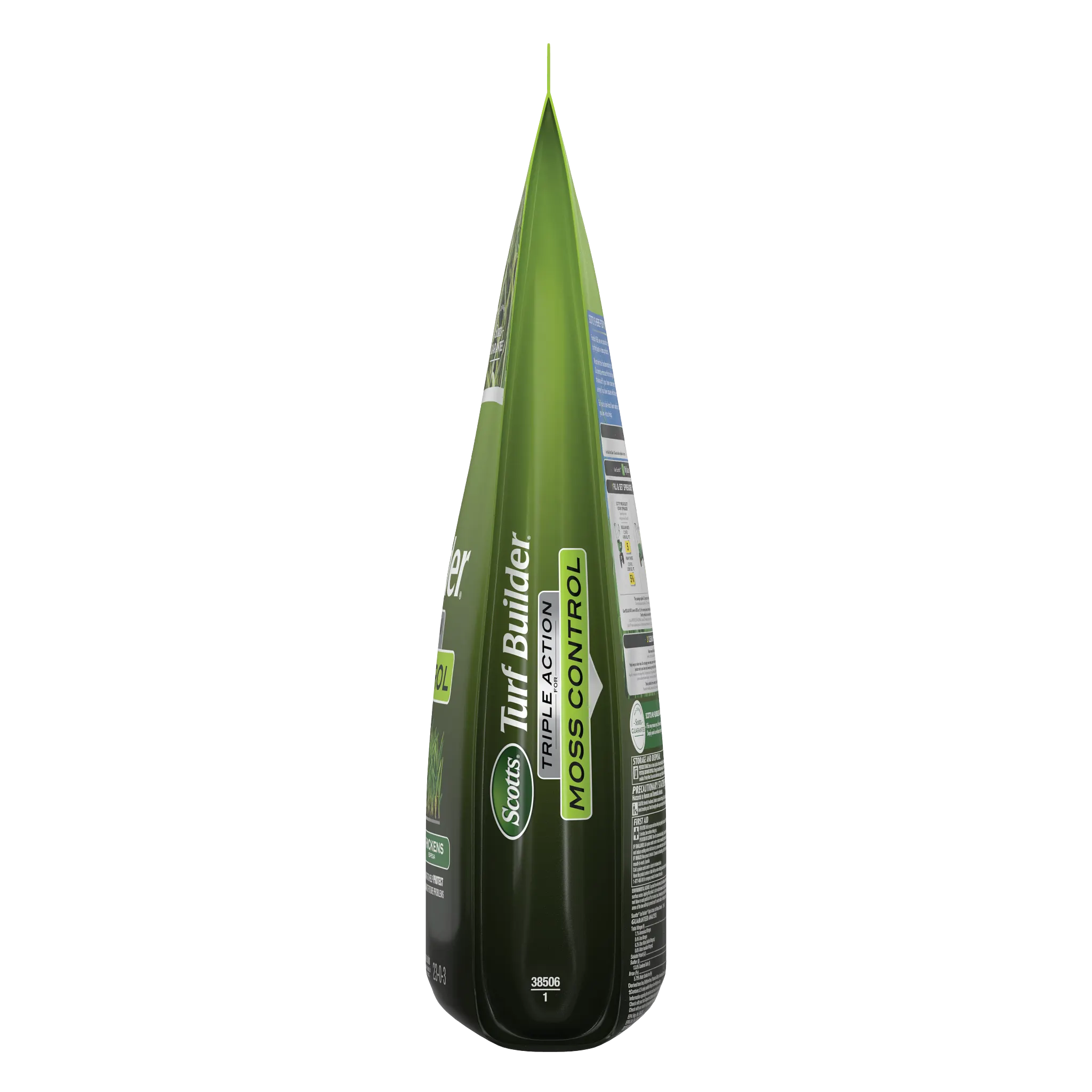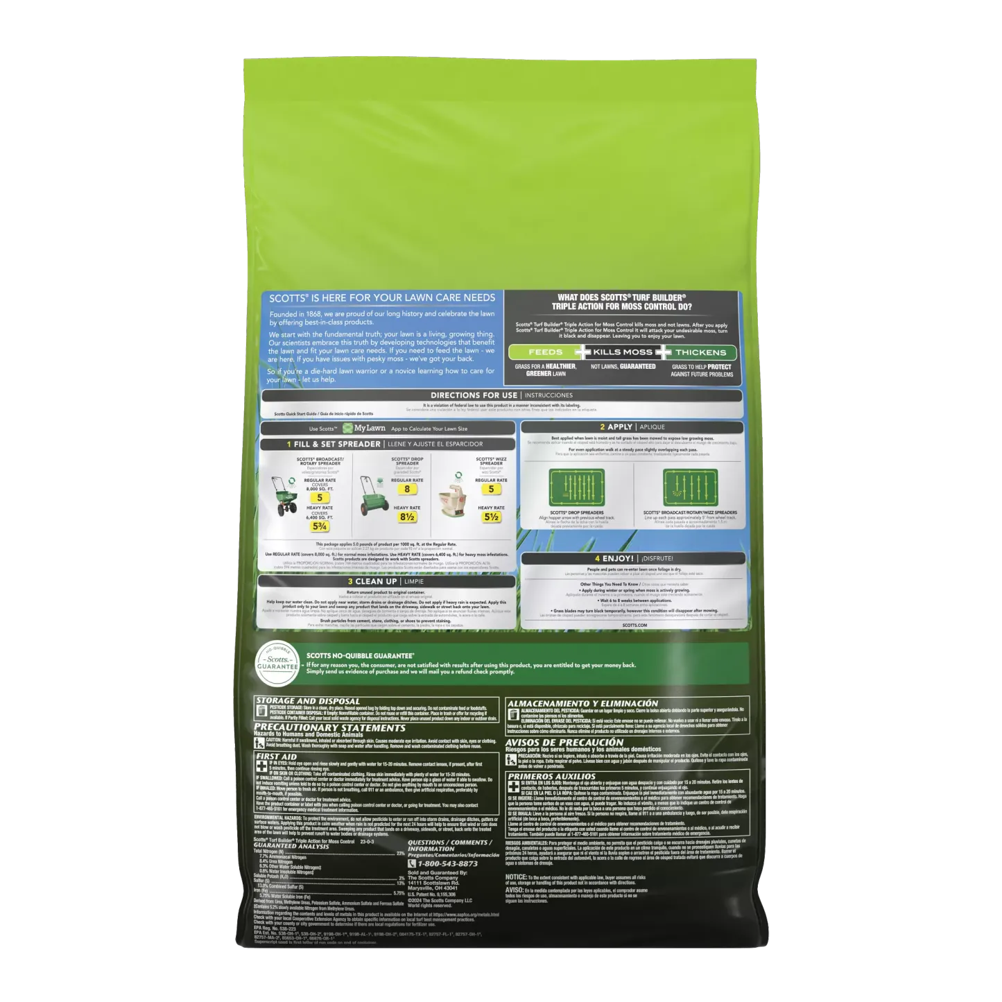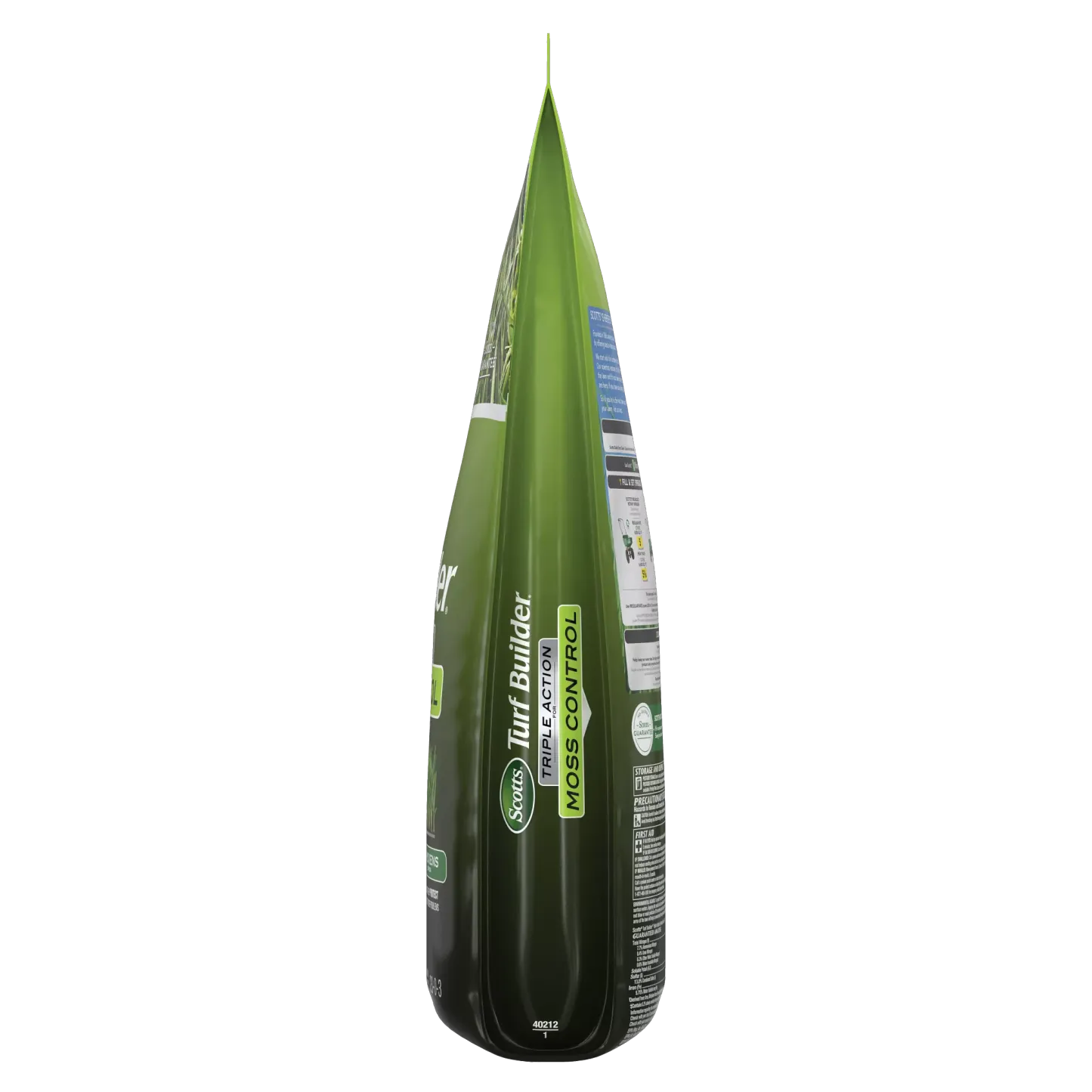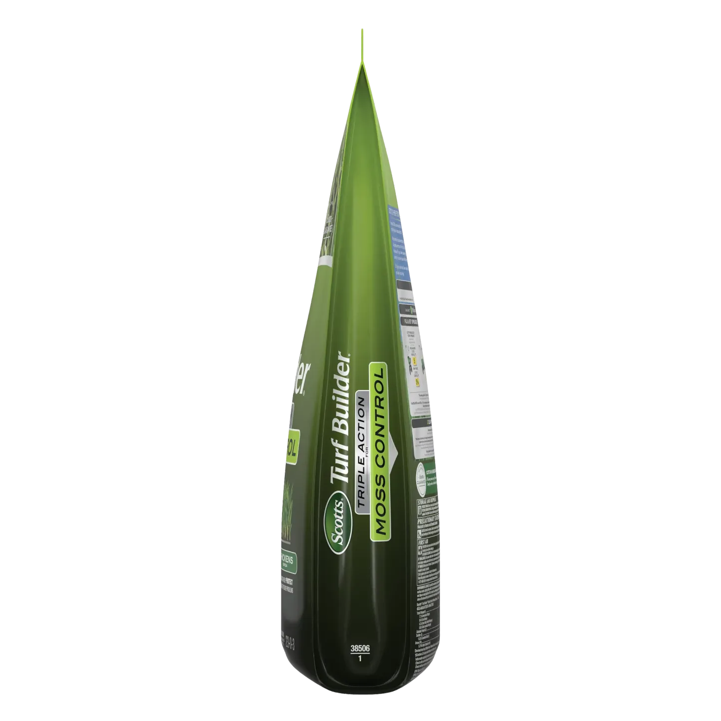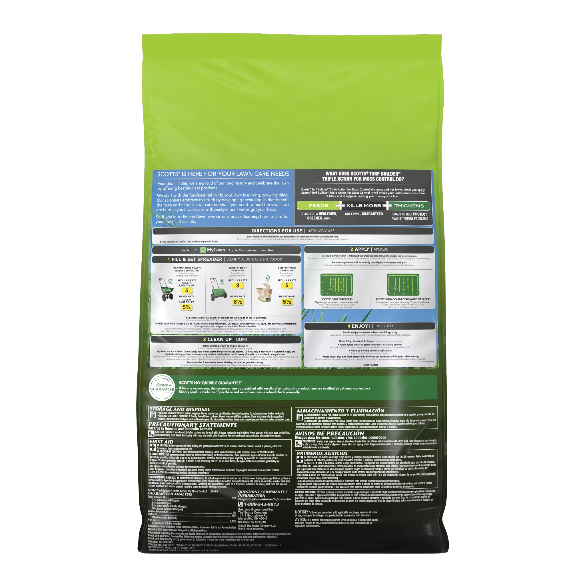 Banish moss and grow a lush lawn with the help of Scotts® Turf Builder® Triple Action for Moss Control. This 3-in-1 lawn care product kills moss, feeds grass for a healthier, greener lawn, and thickens grass to help protect against future problems. Scotts® Turf Builder® Triple Action for Moss Control is for use on most grass types. Apply during winter or spring when moss is actively growing. It is best applied when the lawn is moist and tall grass has been mowed to expose low growing moss. We recommend using a Scotts® spreader to apply this product. For Scotts® broadcast/rotary spreaders, use a setting of 5 for the regular rate or 5 ¾ for the heavy rate. For Scotts® drop spreaders, use a setting of 8 for the regular rate or 8 ½ for the heavy rate. For Scotts® Wizz, use a setting of 5 for the regular rate or 5 ½ for the heavy rate. Grass blades may temporarily turn black after application; however, this condition will disappear after mowing. Always wait 6 to 8 weeks between applications. One 20 lb. bag of Scotts® Turf Builder® Triple Action for Moss Control covers up to 4,000 sq. ft.