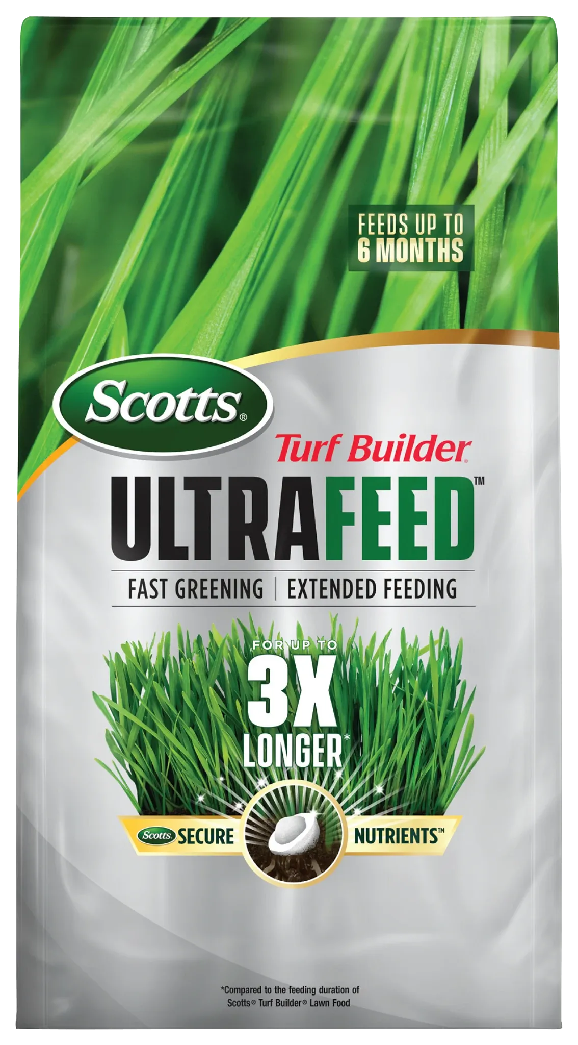 - Scotts® Turf Builder® Ultrafeed™ fertilizer provides fast greening and extended feeding for up to 3X longer than Scotts® Turf Builder® Lawn Food