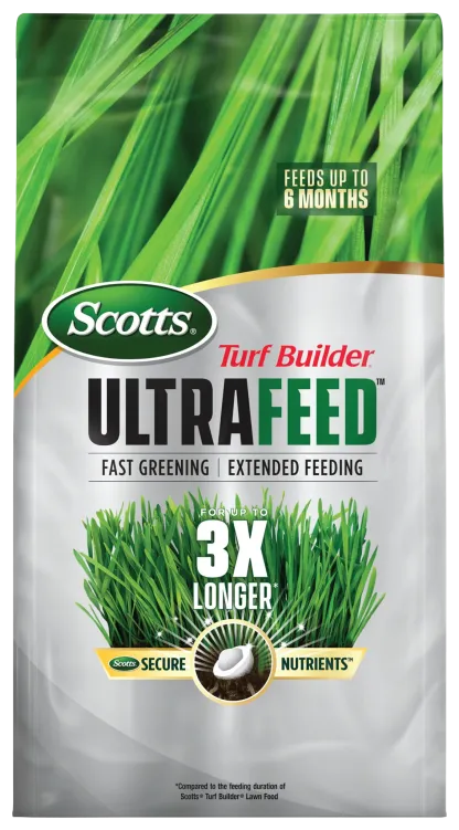 Scotts® Turf Builder® Ultrafeed™ is a fast greening, long-lasting way to feed your yard. This lawn fertilizer provides fast greening and extended feeding for up to 3X longer than Scotts® Turf Builder® Lawn Food. This fertilizer utilizes Scotts® Secure Nutrients™, a coated, patented particle that secures nutrients until your turf needs them, resulting in a fed lawn for up to 6 months. Scotts® Turf Builder® Ultrafeed™ can be used on all grass types. Apply to a wet or dry lawn in the spring to early summer for warm-season grass types, or spring or fall for cool-season grass types. We recommend using a Scotts® spreader to apply this product. For fast results, lightly water in. If you are in the North and need to kill dandelions, prevent crabgrass, and feed your lawn, team up with Scotts® Turf Builder® Triple Action. If you are in the South and need to kill dollarweed and clover, prevent and kill fire ants for up to 6 months and feed your lawn, use Scotts® Turf Builder® Triple Action Southern. Wait 4-6 weeks then apply Ultrafeed™ to keep your lawn fed. One x lb. bag of Scotts® Turf Builder® Ultrafeed™ covers up to 8,889 sq. ft.