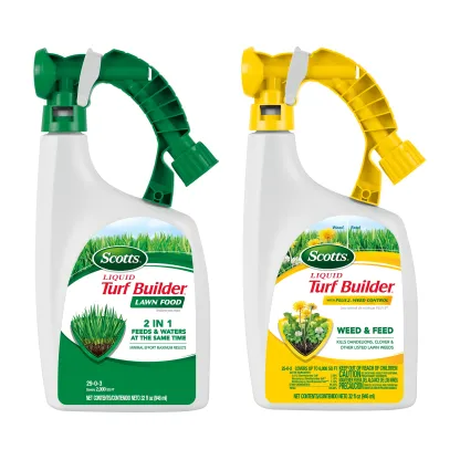 Simplify your lawn care with Scotts® Liquid Turf Builder® 2 Step Lawn Care. These liquid lawn care products make lawn maintenance as easy as watering the yard! Scotts® Liquid Turf Builder® with Plus 2® Weed Control controls common weeds including buckhorn, chickweed, clover, dandelion, ground ivy, henbit, knotweed, lambsquarters, oxalis, pigweed, plantain, poison ivy, ragweed, spurge, and other broadleaf weeds as listed, all while giving your lawn a boost of nitrogen. Use this product when weeds are actively growing. This product is for use on Bluegrass, Fescue, Ryegrass, Bahiagrass, Common Bermudagrass, Centipedegrass, and Zoysiagrass. One 32 oz. container of ready-to-spray Scotts® Liquid Turf Builder® with Plus 2® Weed Control covers up to 6,000 sq. ft. for warm season grasses or 4,000 sq. ft. for cool season grasses. Scotts® Liquid Turf Builder® Lawn Food is a ready-to-spray liquid fertilizer that contains the feeding power lawns need for great results. This lawn care product may be used on any grass type. Apply when grass actively growing. One 32 oz. container of Scotts® Liquid Turf Builder® Lawn Food covers up to 2,000 sq. ft. of lawn.