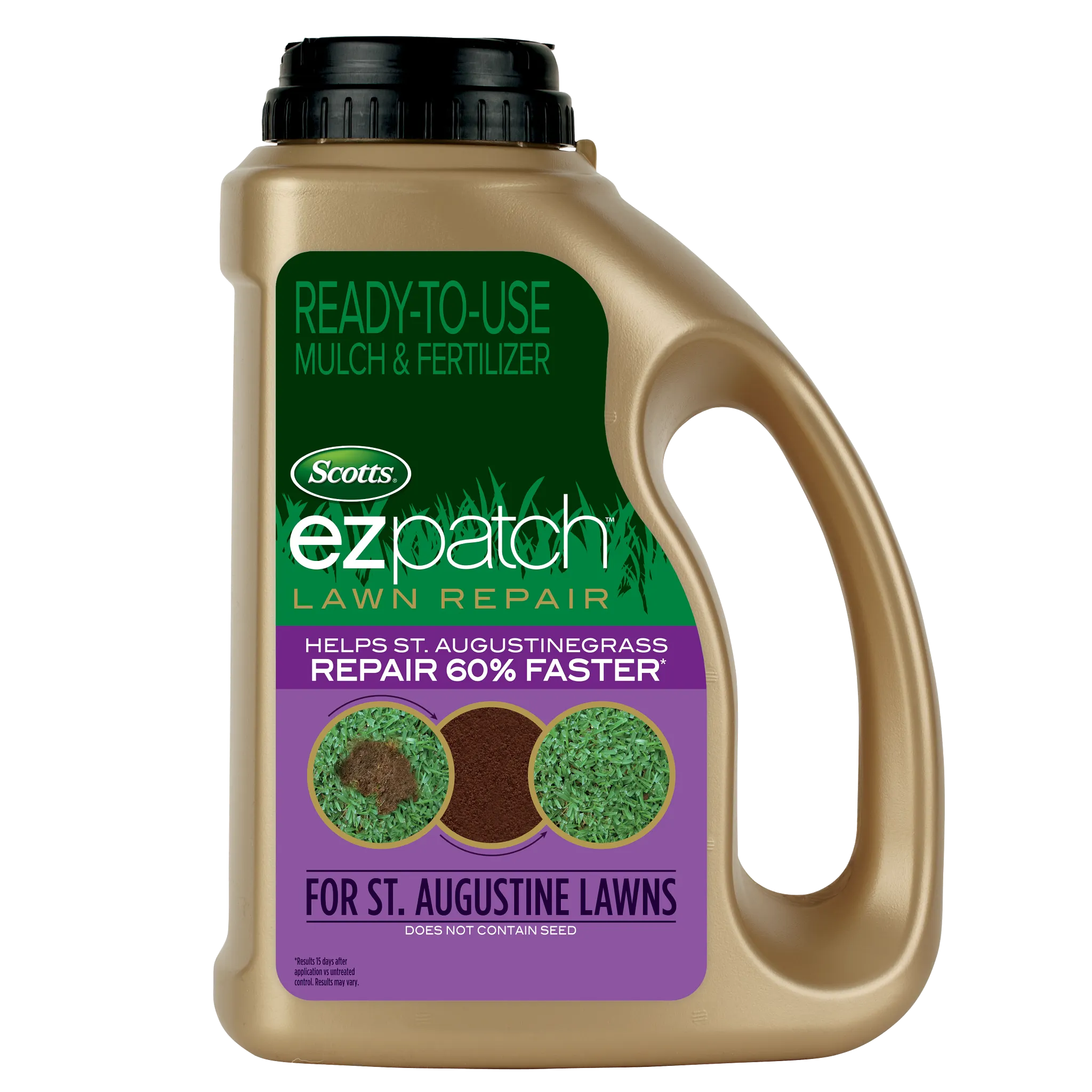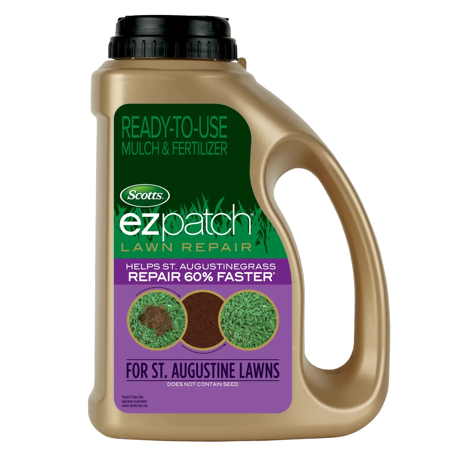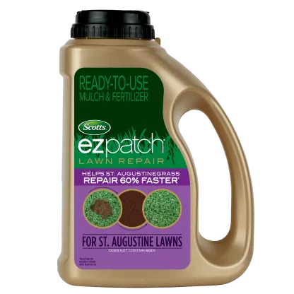 Revitalize your lawn with Scotts® EZ Patch™ Lawn Repair for Augustine Lawns. This combination mulch and fertilizer is specially designed to help repair St. Augustinegrass 60% faster*! The mulch absorbs 6x its weight in water and expands to surround the seed in a moist protective layer. This grass repair product also has fertilizer with exclusive controlled release technology that feeds to promote growth and establishment of St. Augustinegrass. Use this ready-to-use mix to establish new plug plants or repair bare areas of your lawn. Apply in three easy steps. First, prep your area by removing dead grass and loosening hard soil. Apply mix evenly so the ground is covered and no bare ground is visible. Last, gently water until mix is completely saturated. This lawn care product does not contain grass seed. One 3.75 lb. container of Scotts® EZ Patch™ Lawn Repair for St. Augustine Lawns covers up to 85 sq. ft. of lawn. *Results 15 days after application vs. untreated control, results may vary.