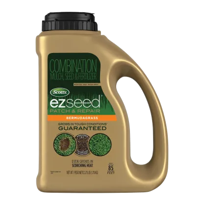 Scotts® EZ Seed® Patch & Repair Bermudagrass is a revolutionary grass seeding product designed to fill in bare spots on your lawn. This Bermudagrass seed grows in tough conditions, including scorching heat, dry areas, high-traffic areas and on slopes. Scotts® EZ Seed® Patch & Repair consists of high performance grass seed, continuous release lawn food, and super-absorbent growing mulch material. Scotts® EZ Seed® Patch & Repair Bermudagrass also includes a tackifier to help reduce seed wash-away and a protectant to help keep seedlings safe from harmful diseases. There are three easy steps to success: 1) prep the area by removing dead grass and loosening hard soil, 2) evenly apply EZ Seed® so the area is mostly covered but bare ground is still visible, and 3) saturate with water until no more water is being absorbed and mulch turns dark brown. Plant when daytime temperatures are between 70°F and 90°F with no danger of frost. For best results, water when mulch turns light brown to keep the soil surface moist until the seedlings reach at least 2 inches tall.