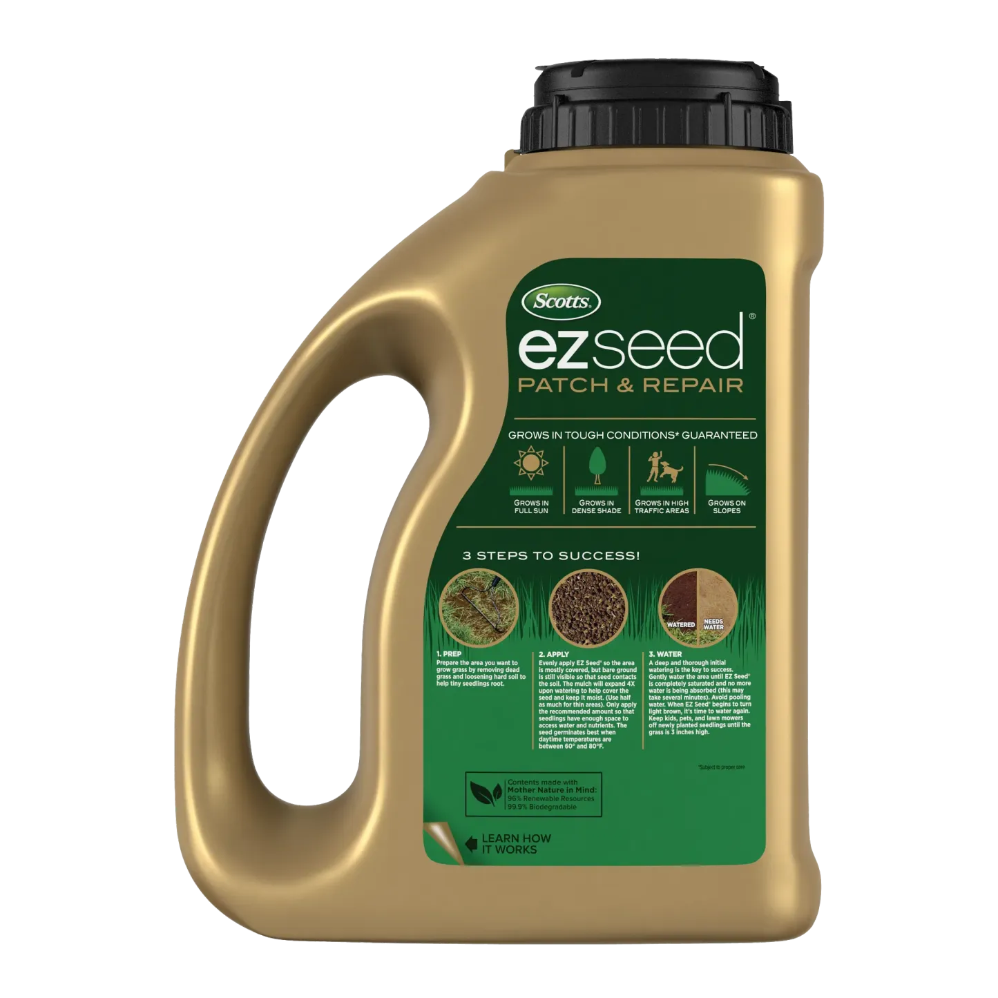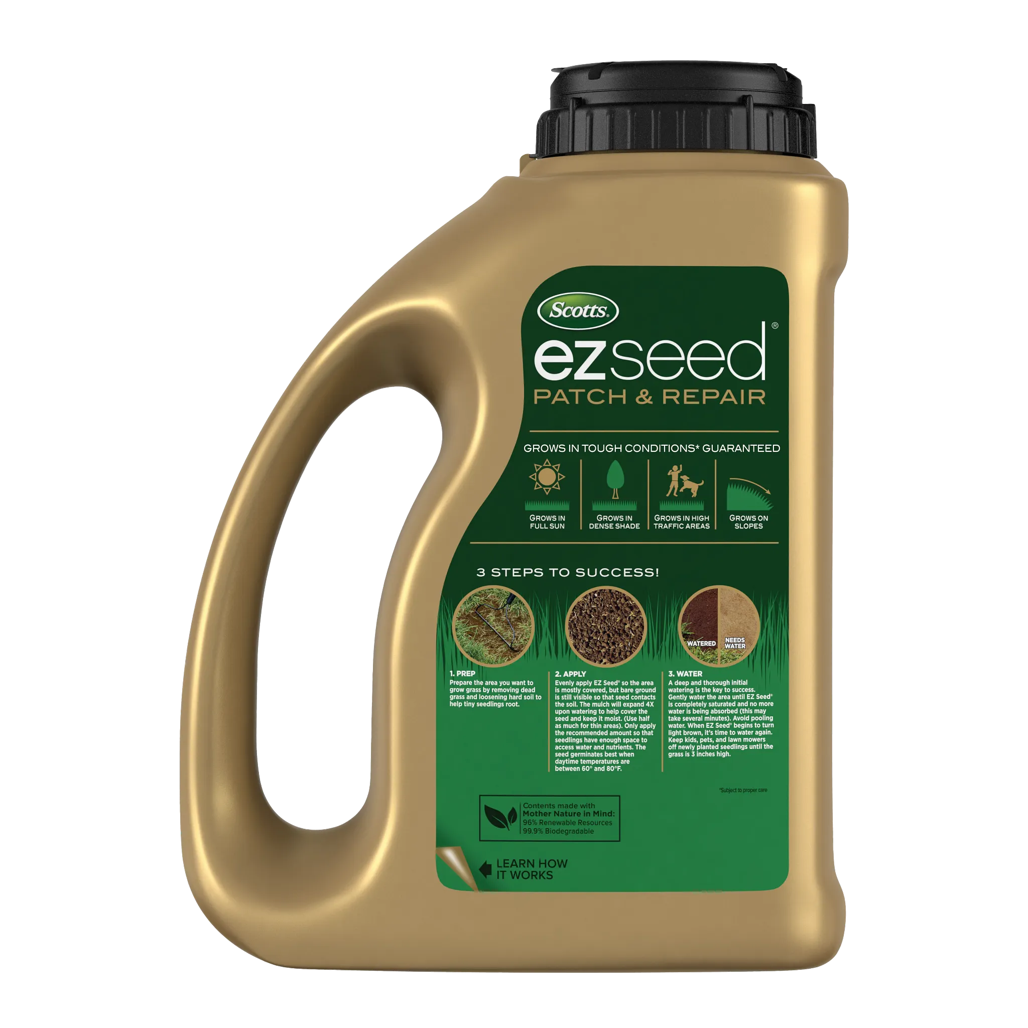 - A 3-IN-1 SOLUTION: This all-in-one formula takes the guesswork out of repairs. It has everything you need: seed, super-absorbent mulch, and a slow-release fertilizer
