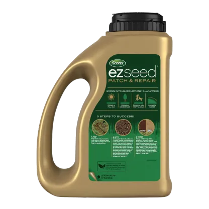 Every lawn gets them—bare spots. Whether they're from foot traffic, tough sun, or dense shade, they can really spoil the look of your yard. That's where Scotts EZ Seed Patch & Repair comes in. We've taken the guesswork out of fixing those spots with our revolutionary 3-in-1 formula. It's a combination of our highest-performing grass seed, a super-absorbent mulch that holds water and protects the seeds, and a fertilizer that gets the new grass off to a great start. The mulch even tells you when to water by changing color. It's the simple, effective way to get lush, thick grass growing anywhere in your yard. Guaranteed.