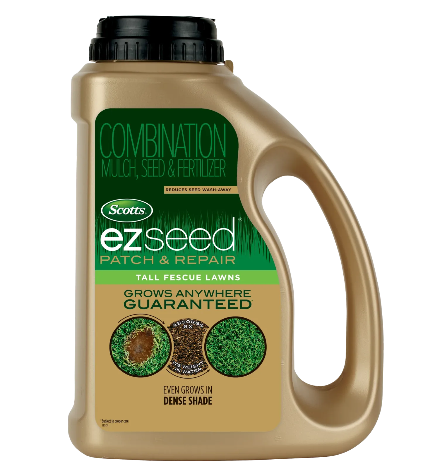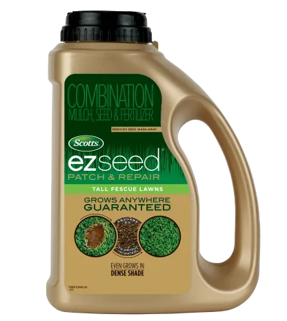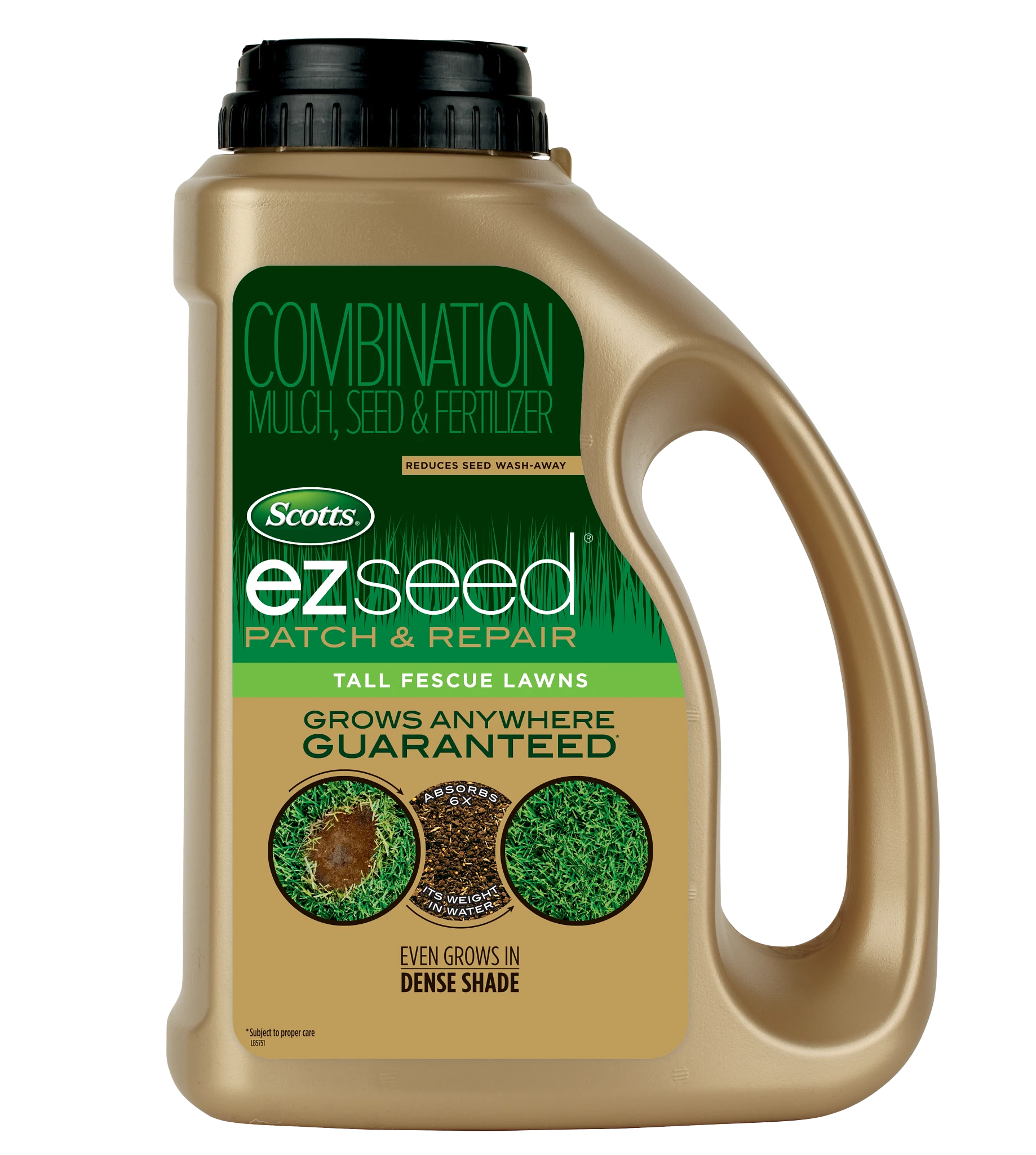 Scotts® EZ Seed® Patch & Repair Tall Fescue Lawns grass is a revolutionary grass seeding product designed to fill in bare spots on your lawn. This Tall Fescue grass seed grows anywhere, including in full sun, dense shade, high-trafficked areas, and on slopes. Scotts® EZ Seed® Patch & Repair consists of high performance Tall Fescue grass seed, continuous release lawn food and water absorbent mulch. Scotts® EZ Seed® Patch & Repair Tall Fescue grass also includes a tackifier to help reduce seed wash-away and a protectant to help keep seedlings safe from harmful diseases. There are three easy steps to success: 1) prep the area by removing dead grass and loosening hard soil, 2) evenly apply EZ Seed® so the area is mostly covered but bare ground is still visible, and 3) saturate with water until no more water is being absorbed and mulch turns dark brown. Plant seed in the spring or fall when daily average soil temperatures are consistently between 55°F and 70°F, or air temperatures between 60°F and 80°F. For best results, keep kids, pets, and lawn mowers off newly planted seedlings until the grass is 3 inches high.