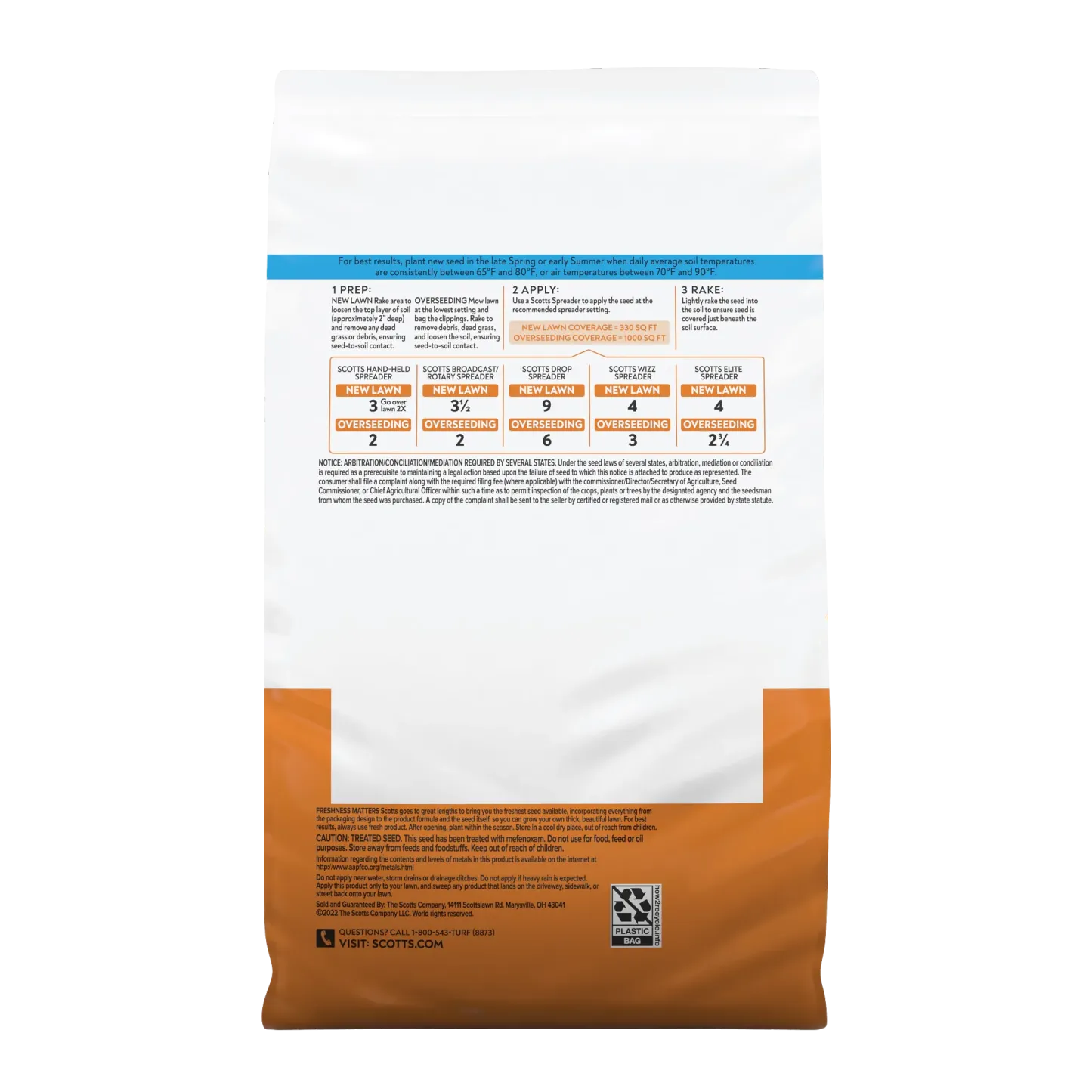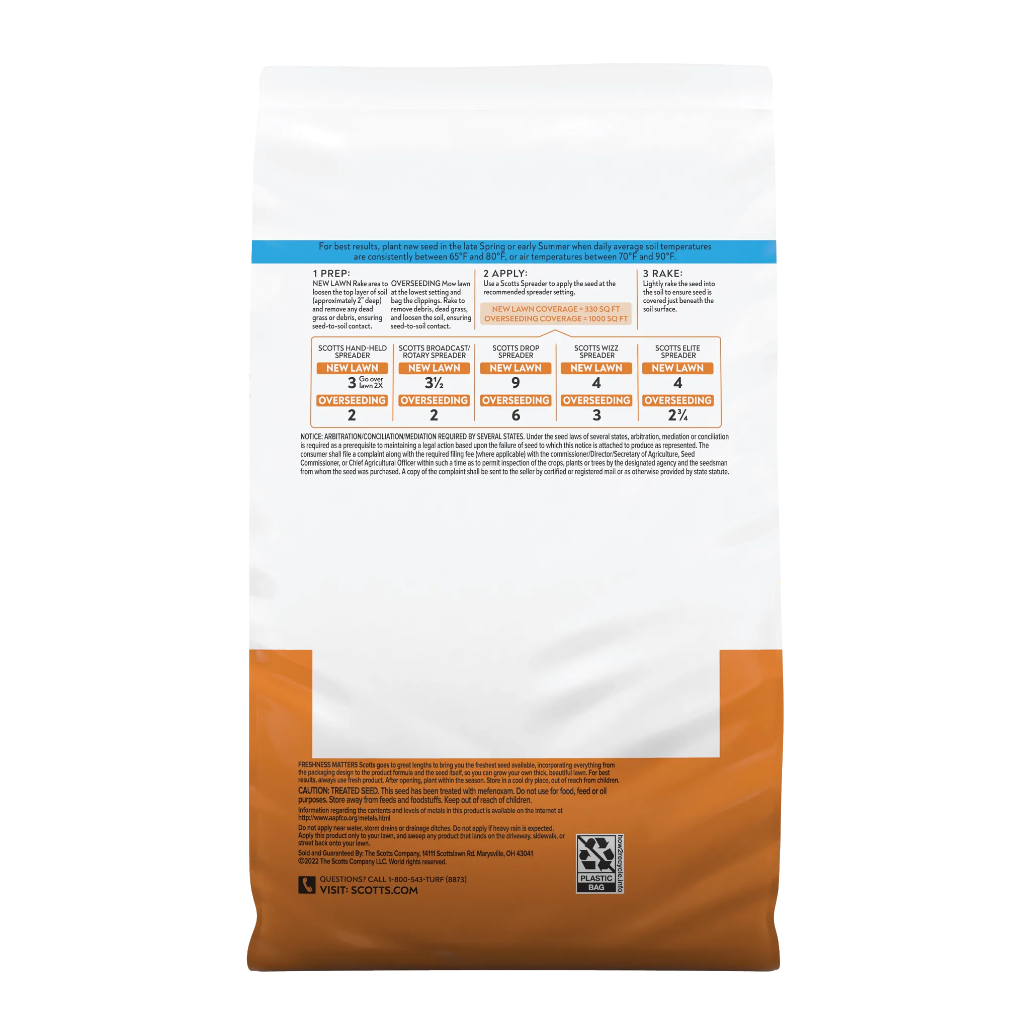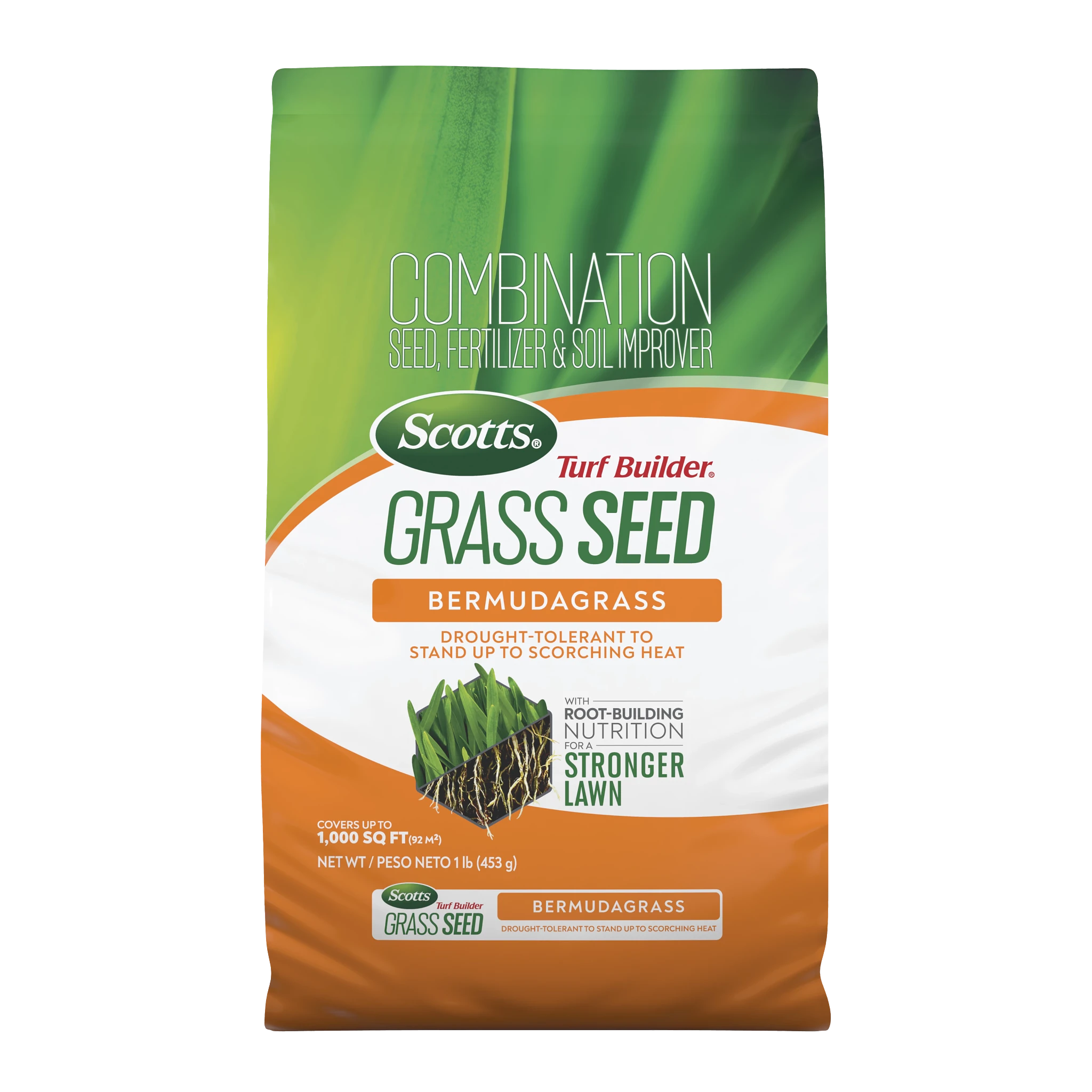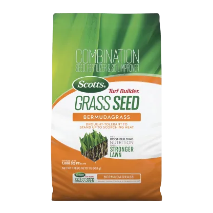Scotts® Turf Builder® Grass Seed Bermudagrass is drought-tolerant to stand up to scorching heat. This mix contains Root-Building Nutrition, a combination of ingredients that is expertly crafted to help establish deep roots to grow thick, green turf so that you can build a better, stronger lawn from the roots up. Scotts® Turf Builder® Grass Seed Bermudagrass is designed for full sun, and has high drought resistance with high durability. It can be used to seed a new lawn or overseed an existing lawn. For best results, apply in the late spring or early summer when daily average soil temperatures are consistently between 65°F and 80°F or air temperatures are between 70°F and 90°F. We recommend using a Scotts® spreader to apply this product (please refer to spreader settings on product label). Water daily or as needed to keep the soil surface moist until the seedlings reach at least 2 inches tall. One 1 lb. bag of Scotts® Turf Builder® Grass Seed Bermudagrass has a new lawn coverage of 330 sq. ft. and an overseeding coverage of 1,000 sq. ft.