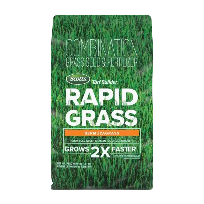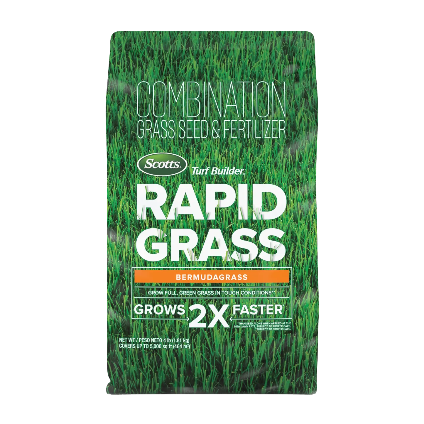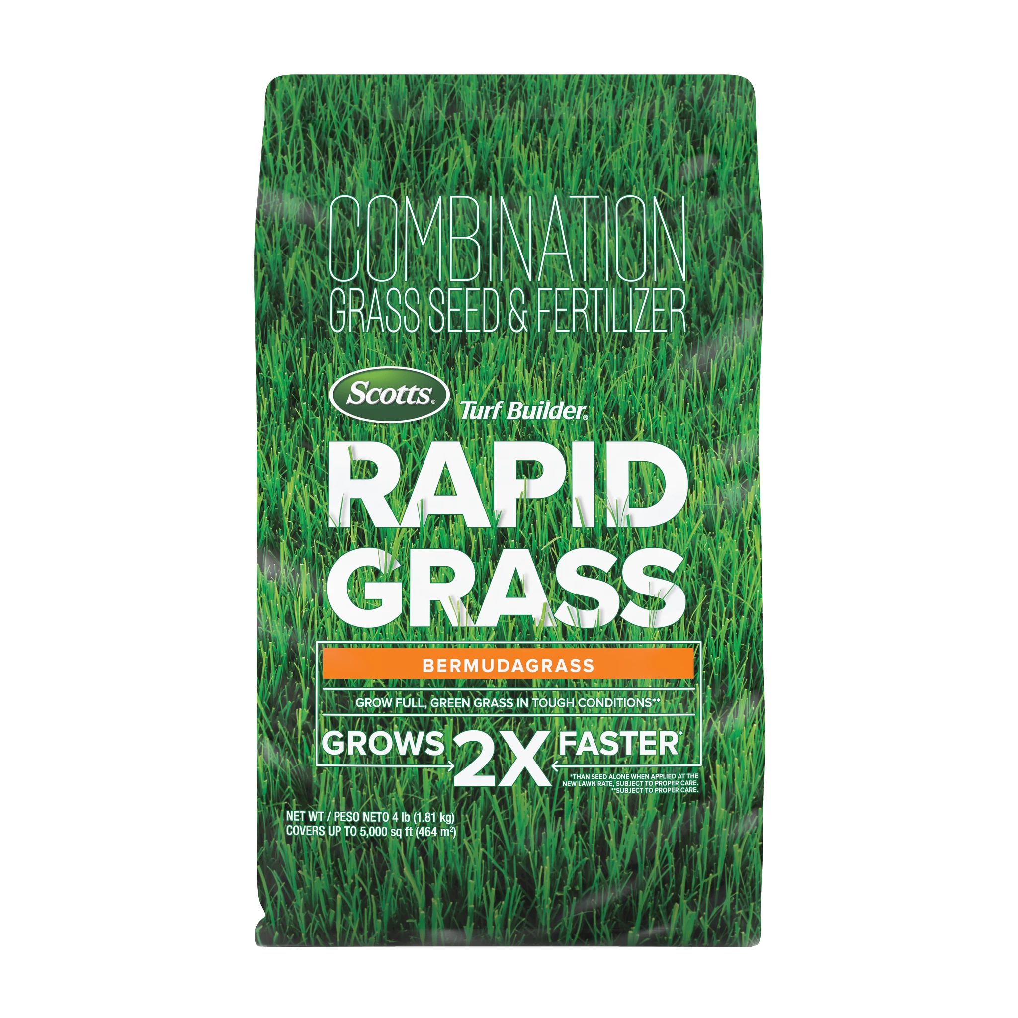 Get outside and enjoy your lawn with Scotts® Turf Builder® Rapid Grass Bermudagrass. With our revolutionary mix of grass seed and fertilizer in one effective formula, your lawn benefits from extended feeding. Compared to seed alone, this grass seed mix will grow 2X faster (when applied at the new lawn rate, subject to proper care). You can count on Scotts® Turf Builder® Rapid Grass Bermudagrass to grow full, green grass in tough conditions (subject to proper care). Use on either new lawns or to overseed an existing bermudagrass lawn. For best results, apply in the spring or early summer when air temperatures are consistently between 70°F and 90°F. We recommend using a Scotts® spreader to apply this product Do not use weed control products until your lawn has been mowed at least 4 times. Finally, be sure to apply Scotts® Lawn Food products every 8 weeks throughout the season to help maintain your thick, green lawn. One 4 lb. bag of Scotts® Turf Builder® Rapid Grass Bermudagrass has a new lawn coverage of 1,498 sq. ft. and an overseeding coverage of 5,000 sq. ft.