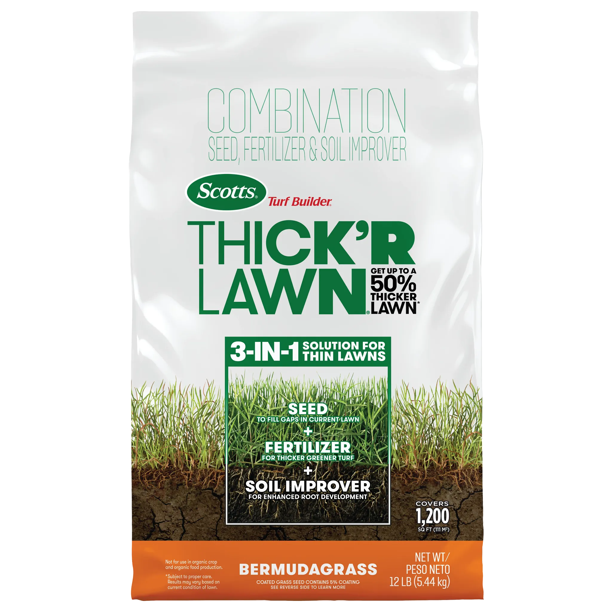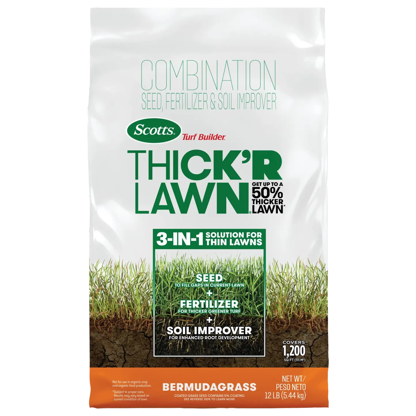 - Coverage: One 12 lb. bag of Scotts® Turf Builder® Thick'R Lawn® Bermudagrass covers 1,200 sq. ft.