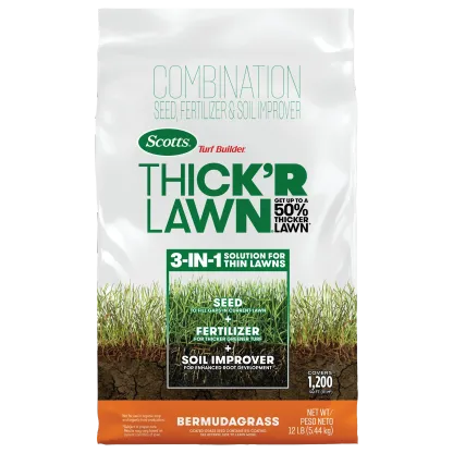 Build your lawn with Scotts® Turf Builder® Thick'R Lawn® Bermudagrass. With this combination grass seed, fertilizer, and soil improver, you can get up to a 50% thicker lawn subject to proper care (results may vary based on the condition of your lawn). This 3-in-1 solution for thin, weak lawns helps turn your grass into thicker, greener turf with stronger roots in one easy application. Use this product to overseed your Bermudagrass lawn in the late spring or early summer once your lawn has greened up and soil temperatures reach 65°F. Apply in three easy steps: 1) Prep your lawn by mowing to 2 inches or at the lowest mower setting, then rake to loosen the top layer of soil and remove dead grass and debris. 2) Use a Scotts® spreader to apply (use the recommended settings on the label). 3) Water daily or as needed to keep the soil surface moist for 2 weeks until seeds germinate, then water regularly to maintain seedling growth. One 12 lb. bag of Scotts® Turf Builder® Thick'R Lawn® Bermudagrass covers 1,200 sq. ft.