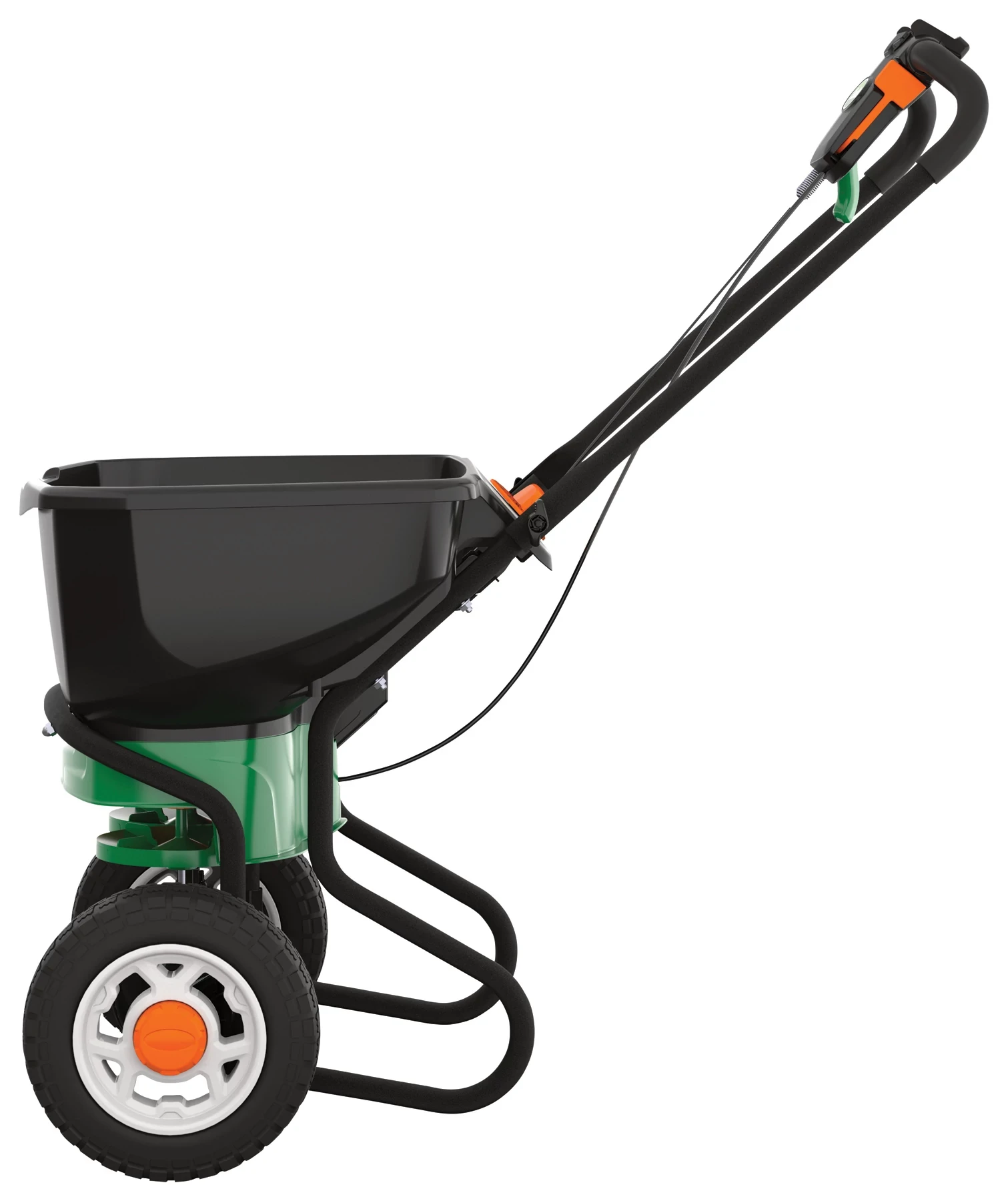 The Scotts Elite Spreader has a fold-down handle, so it can be stored upright in your garage or shed.