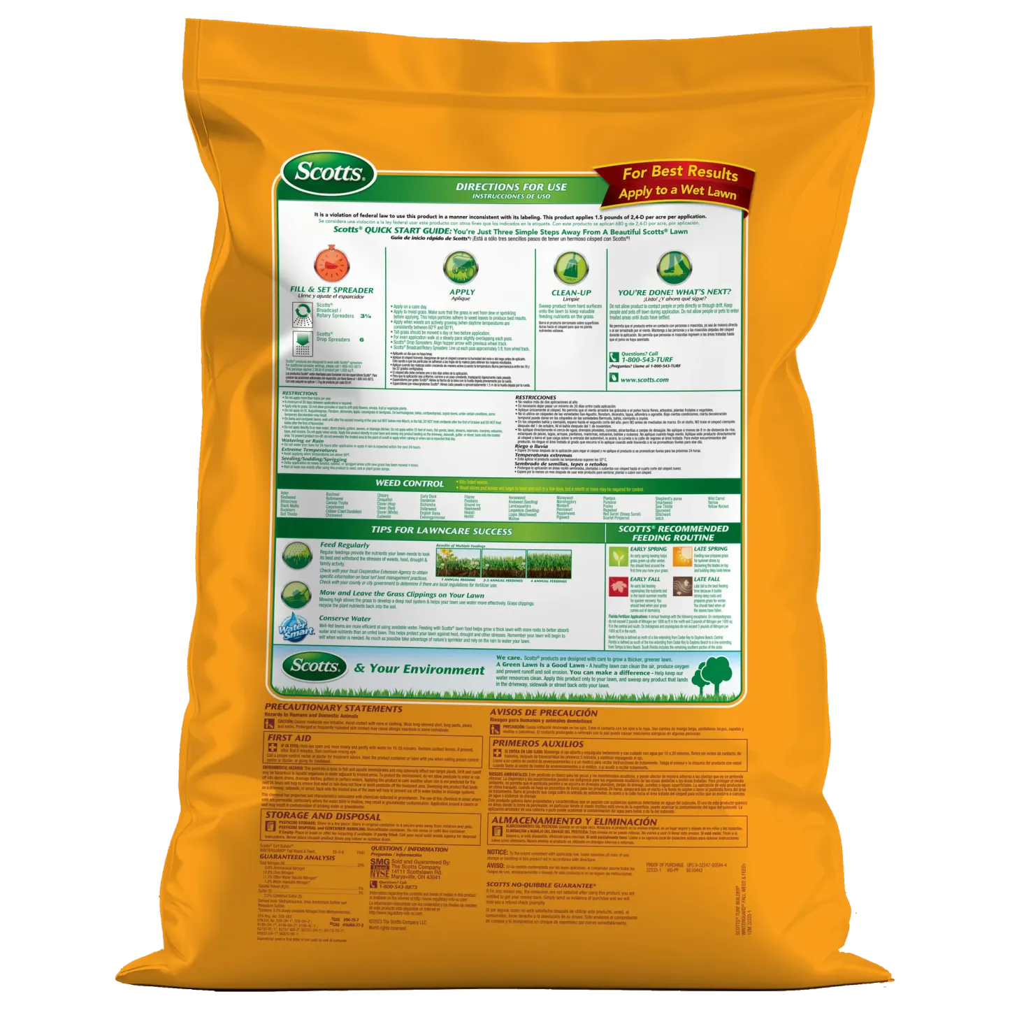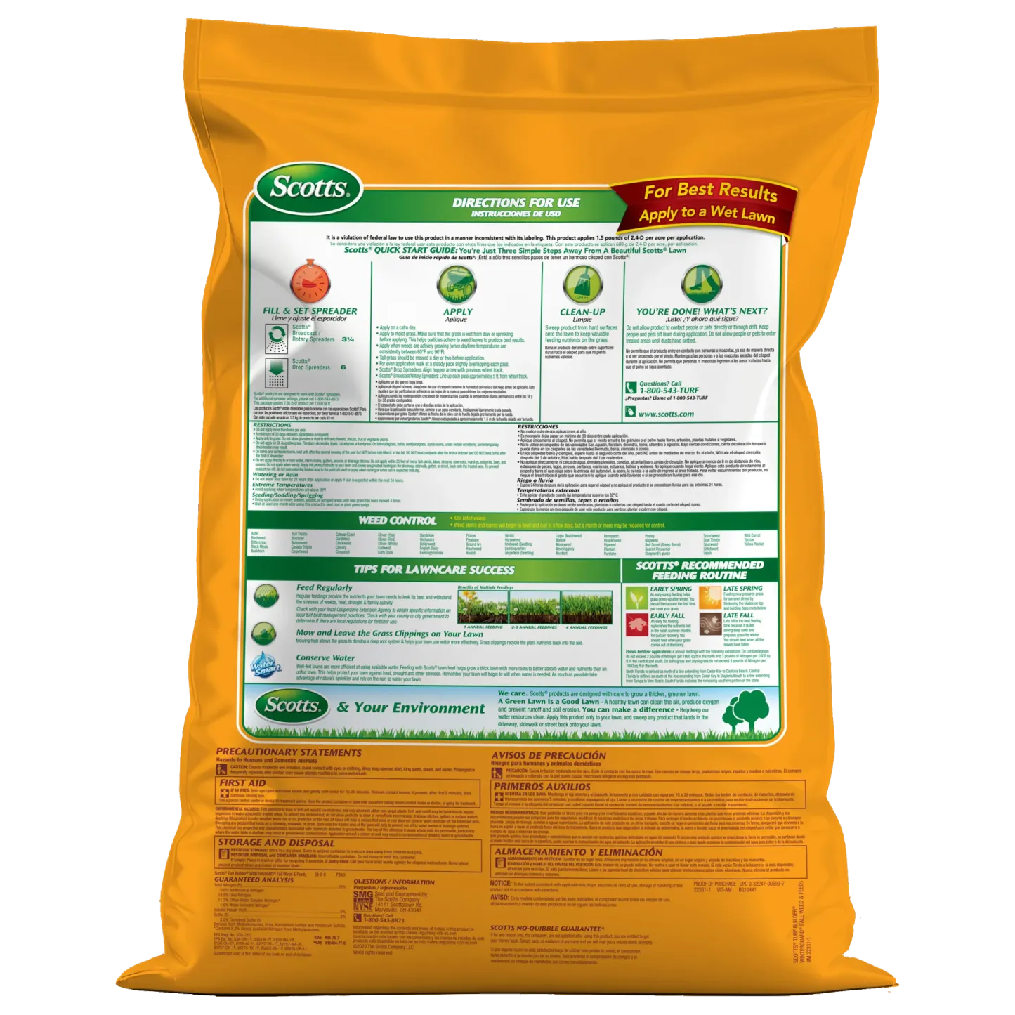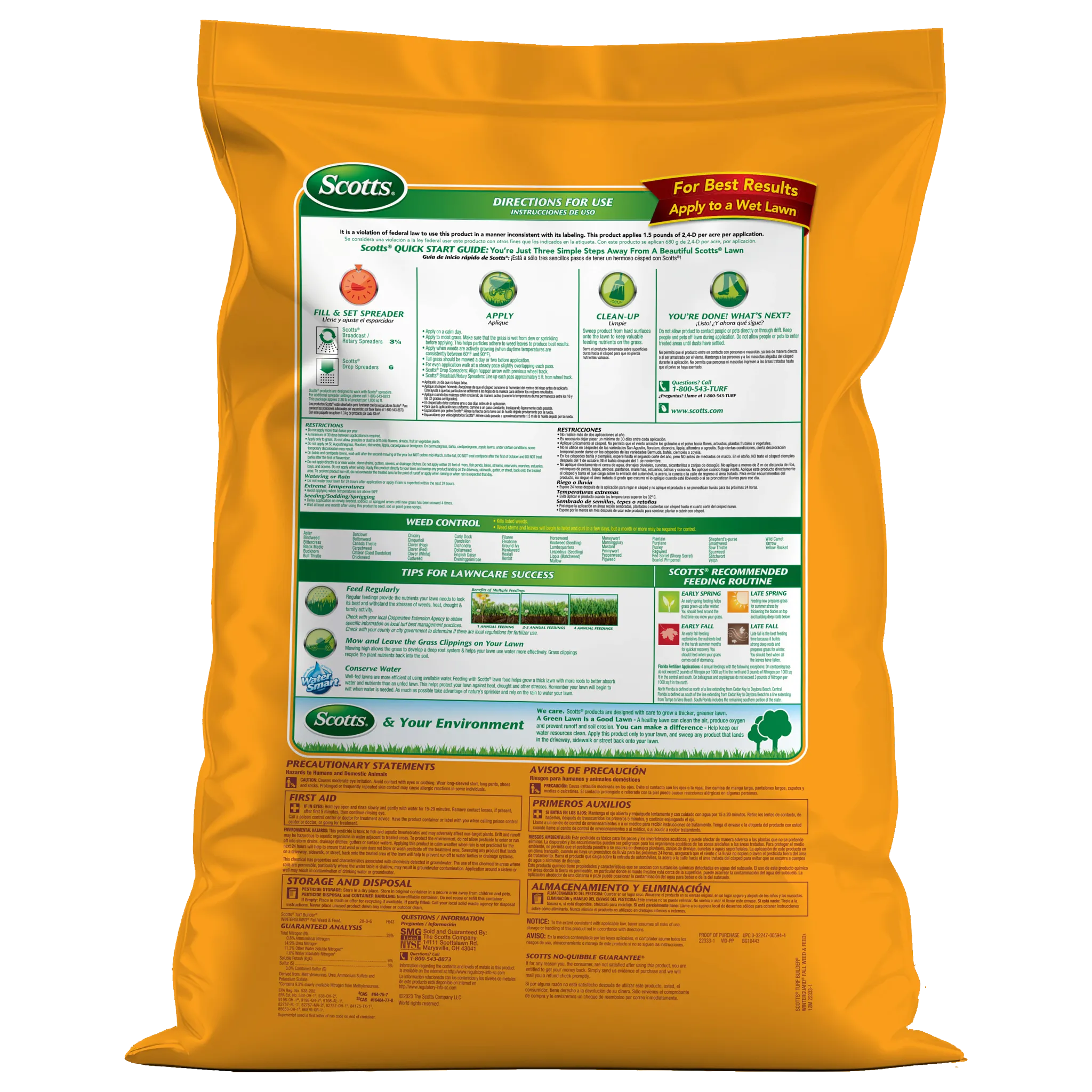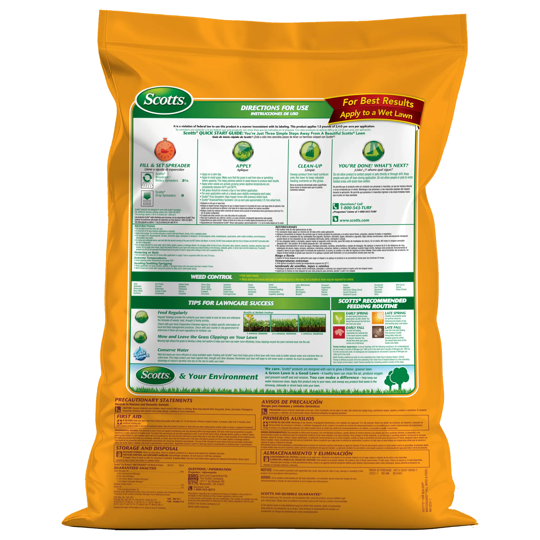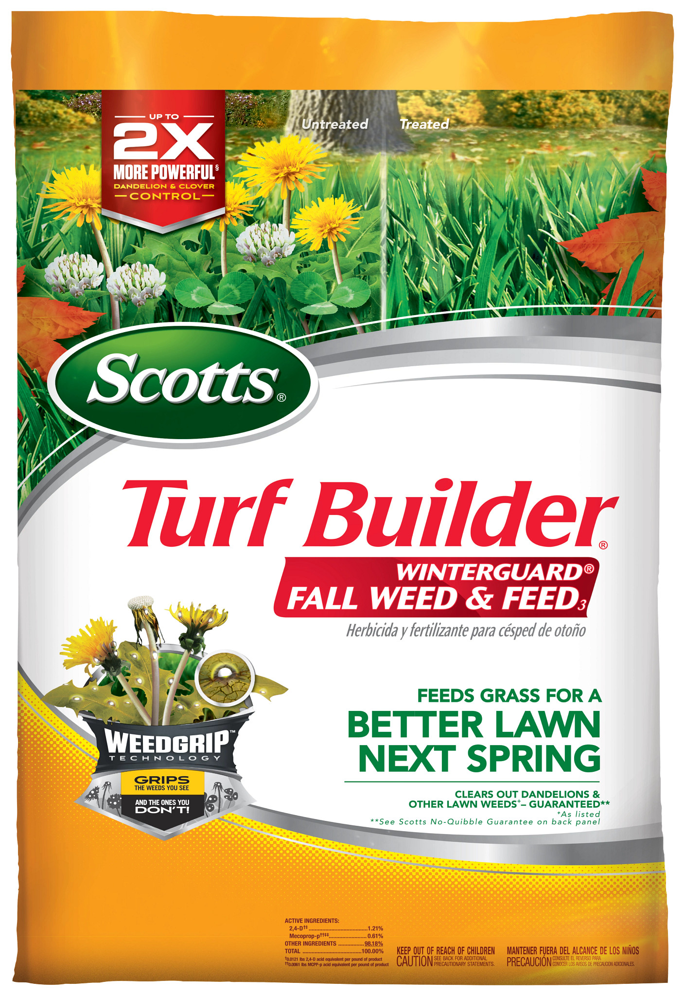 Treat weeds and feed your lawn with Scotts® Turf Builder® WinterGuard® Fall Weed & Feed3 in the fall for a better lawn next spring. This weed killer plus lawn fertilizer controls over 50 listed lawn weeds, including clover, dandelion, plantain, morningglory, chicory, eveningprimrose, and purslane. In addition, it delivers the nutrients needed to help recover from damage from the summertime and build strong roots to take on harsh winter conditions. Apply Scotts® Turf Builder® WinterGuard® Fall Weed & Feed3 on a calm day when weeds are actively growing and temperatures are consistently between 60°F and 90°F. Make sure your grass is moist from dew or sprinkling, as this helps particles adhere to weed leaves to produce the best results. We recommend using a Scotts® spreader to apply this product. For Scotts® broadcast/rotary spreaders, use a setting of 3 1/2. For Scotts® drop spreaders, use a setting of 6. Do not water your lawn for 24 hours after application. This lawn care product is for use on Bahiagrass, Bermudagrass, Bluegrass, Centipedegrass, Fescue, Ryegrass, and Zoysiagrass. Do not apply to St. Augustinegrass (including Floratam), Dichondra, Lippia, Carpetgrass, or Bentgrass. One 11.43 lb. bag covers 4,000 sq. ft.