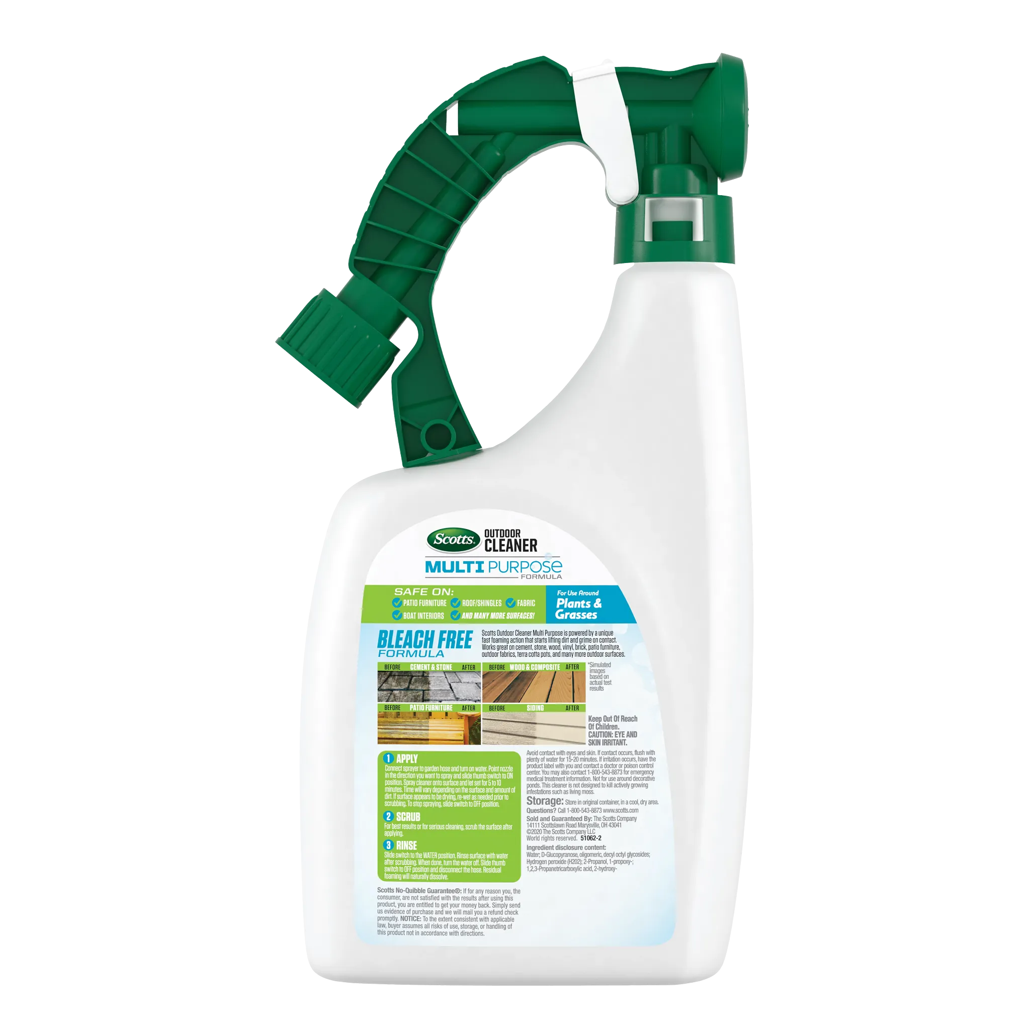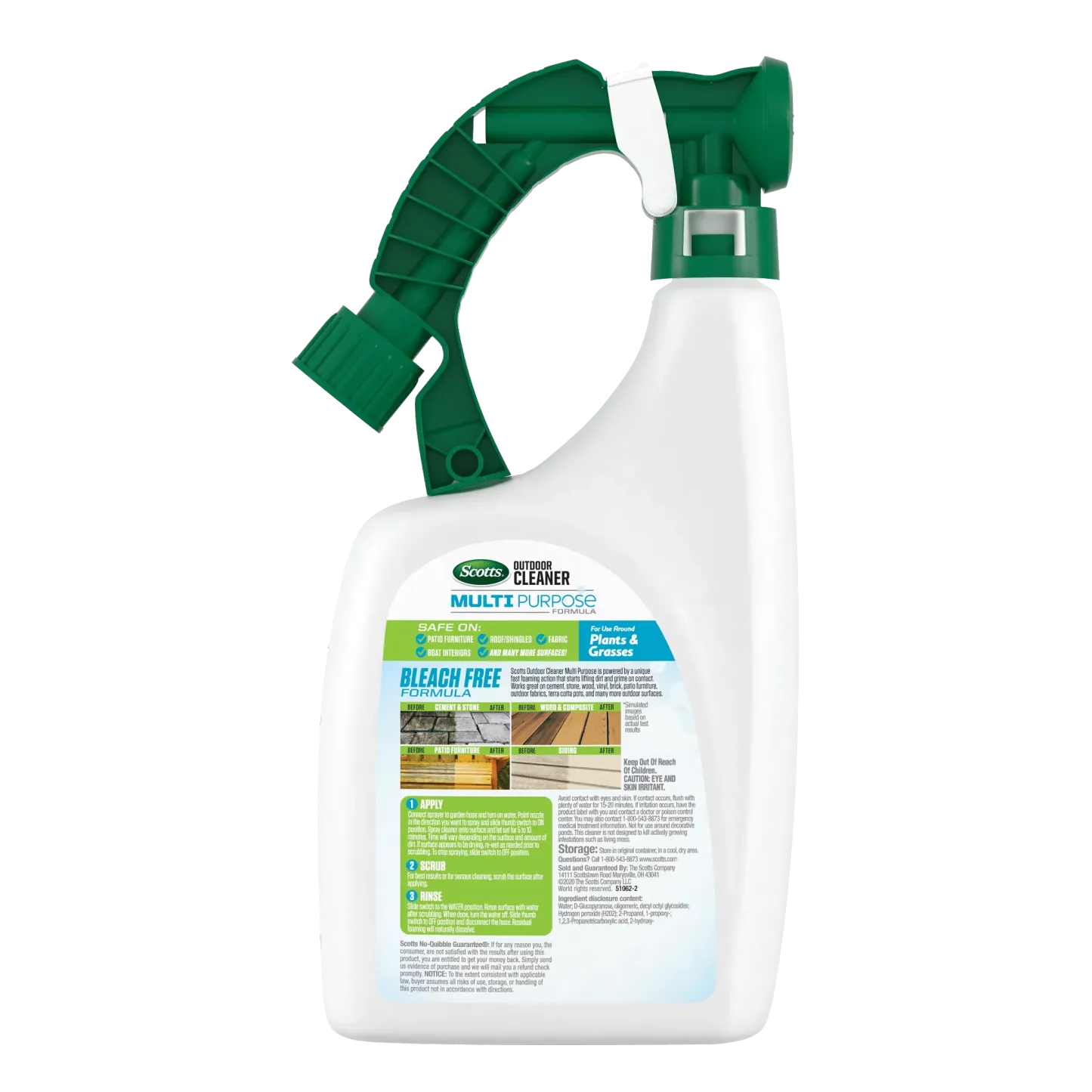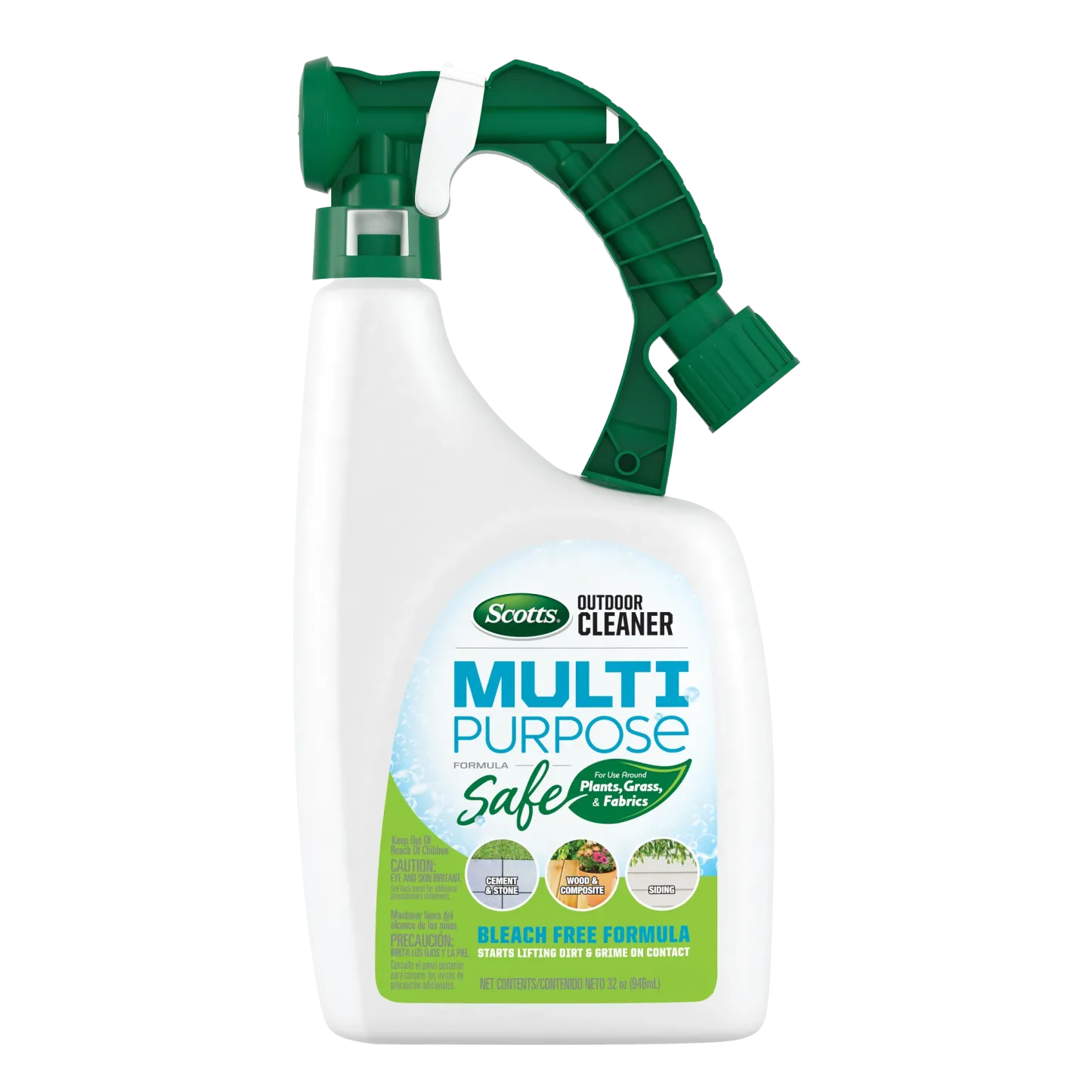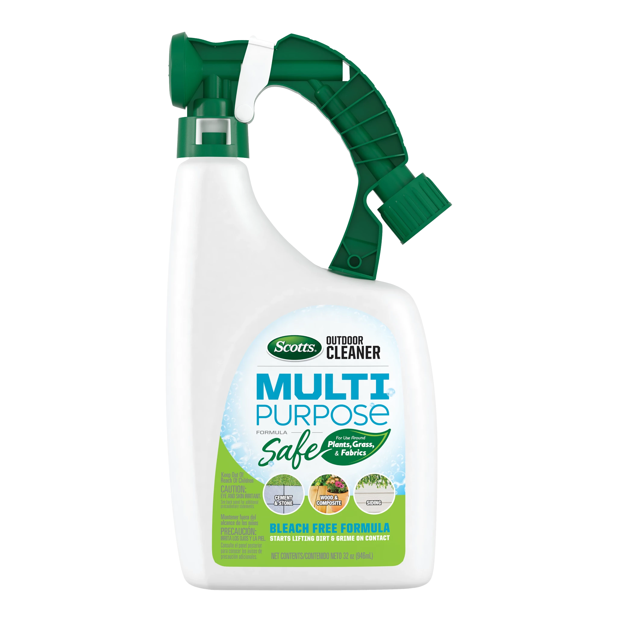 Forget filling your shelves with an individual deck cleaner, siding cleaner, brick cleaner and patio furniture cleaner. Scotts® Outdoor Cleaner Multi Purpose Formula is your everyday, ready-to-spray go-to for tackling a weekend’s worth of dirty jobs (and then some). Patio furniture on deck? Check. Siding? Check. Roof shingles? Check. Even your boat interior? Check, mate. From cement and stone, to wood and composite, the fast-foaming action of this multipurpose cleaner lifts dirt and grime on contact. Designed with the environment in mind, the bleach-free formula delivers the punch you expect from a cleaner while still being safe to spray and use around plants, grasses and on outdoor fabrics such as umbrellas, awnings and more. To apply the cleaner, simply connect the sprayer to your garden hose, spray and let it sit for 5-10 minutes. For best results or serious cleaning, scrub the surface. Once finished, rinse and move onto the next project on your list. That cleaning to-do list, it never stood a chance. (This bottle is not refillable.)